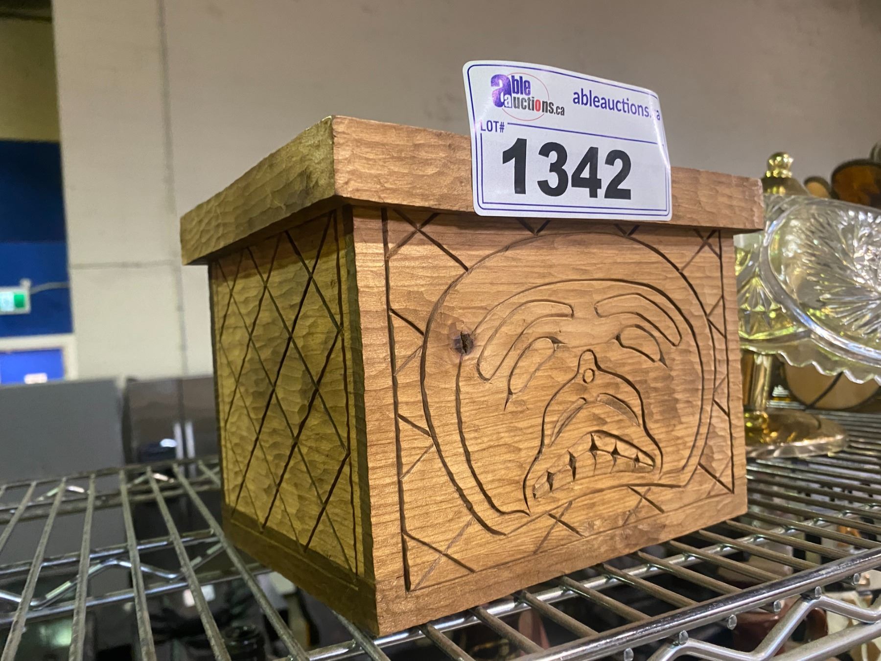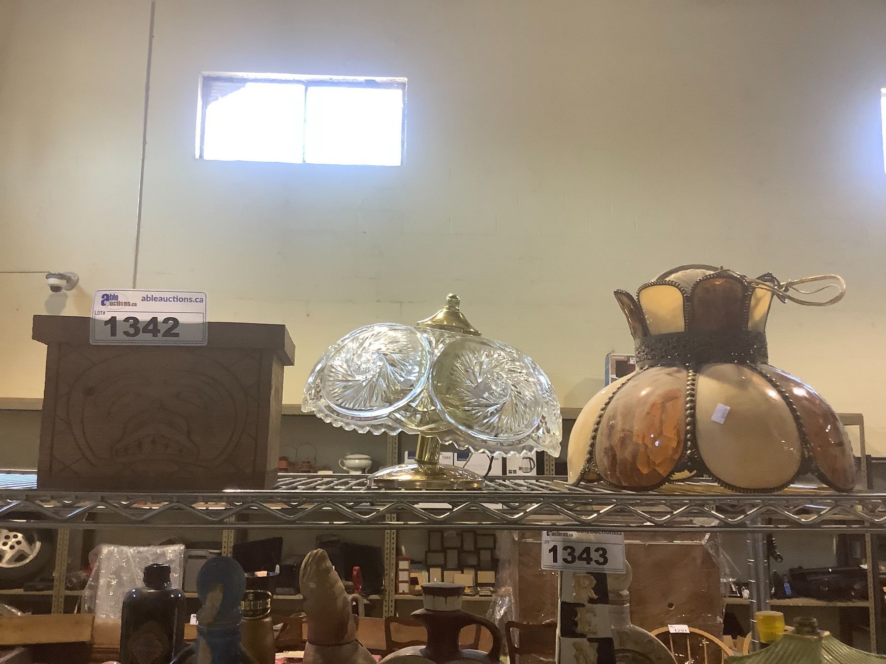 VINTAGE GLASS LAMP SHADE, TABLE LAMP, WOOD CARVED BEAVER BOX BY M. STEVENS