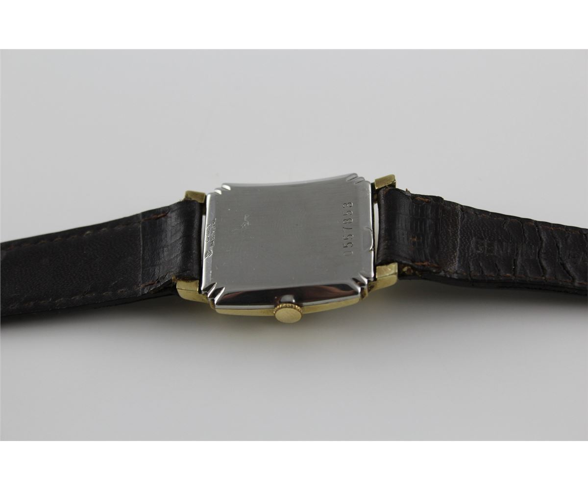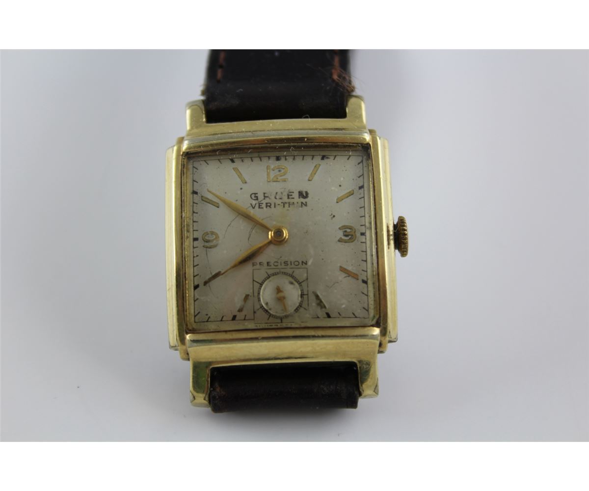 VINTAGE GRUEN YELLOW GOLD PLATED GENTS OR LADIES WRIST WATCH WITH A SQUARE SHAPED CASE . IS PART OF THE "VERITHIN" SERIES. HAS A CREAM DIAL WITH GOLD TONE BARS & ARABIC NUMERALS AS HOUR NOTATIONS. ATTACHED IS A BROWN LEATHER STRAP WITH DECORATIVE STITCHING. VALUE: $875.00