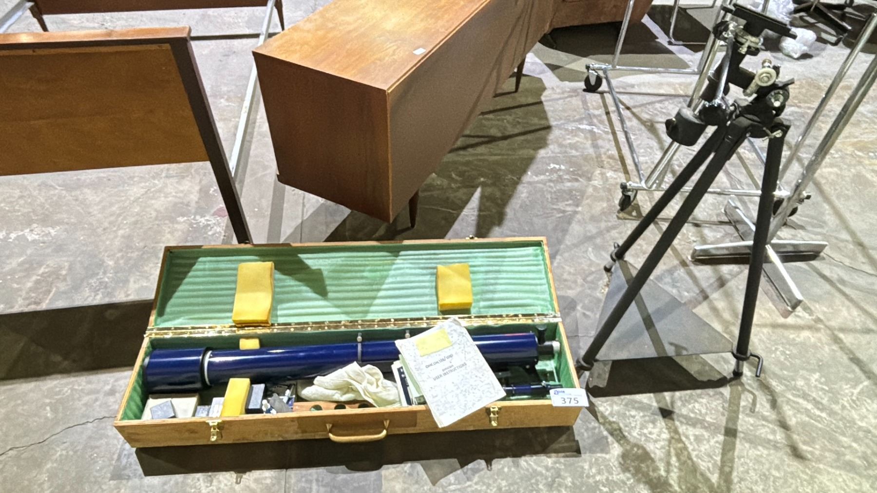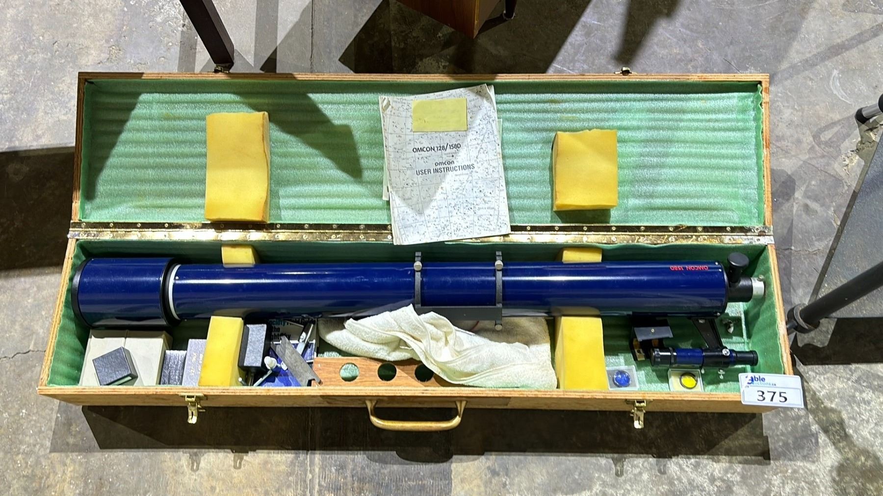 VINTAGE OMCON 128/158D TELESCOPE WITH TRIPOD, ACCESSORIES, ORIGINAL RECEIPT & STORAGE BOX