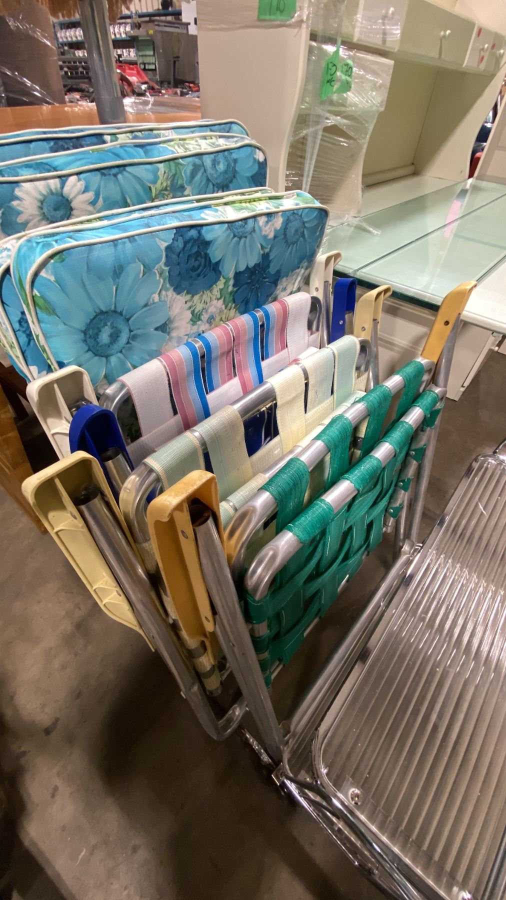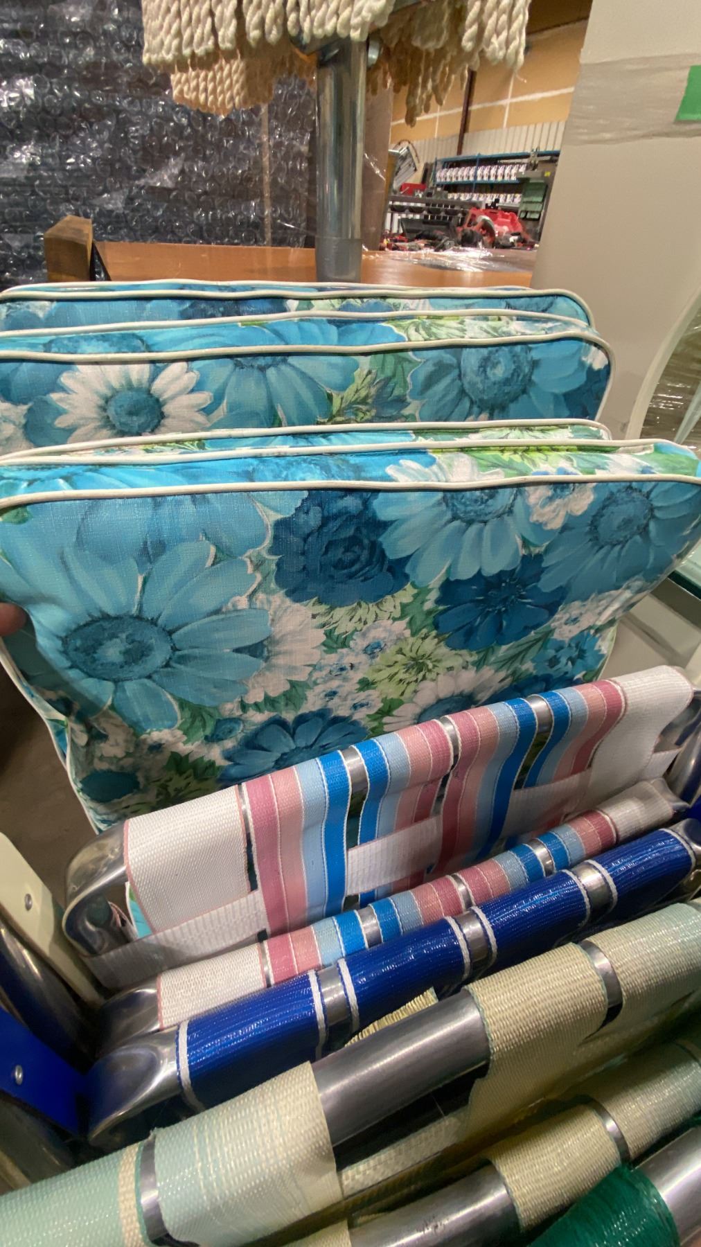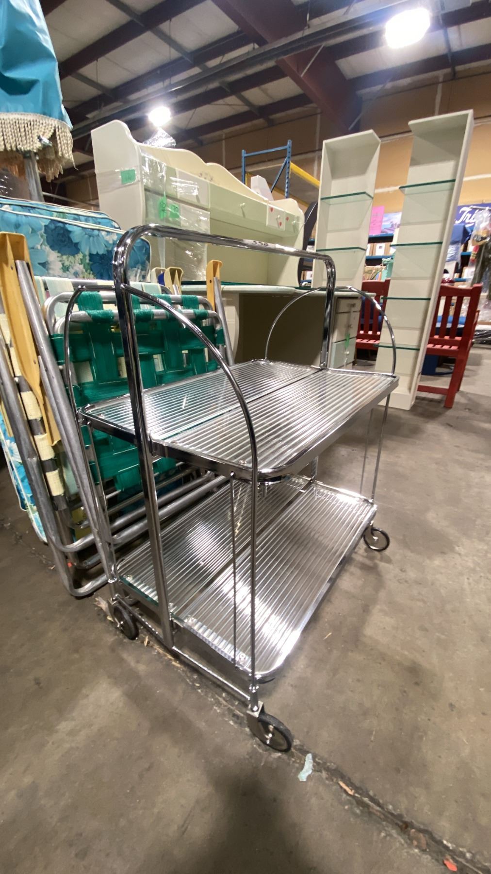 VINTAGE OUTDOOR PATIO UMBRELLA, FLOWER CUSHIONS, FOLDING CHAIRS & CHROME MOBILE BEVERAGE CART