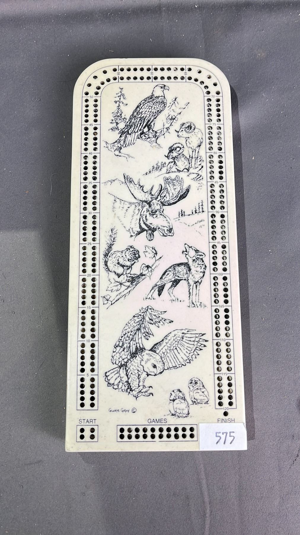 VINTAGE PEARLITE CRIBBAGE BOARD SIGNED GLENYS GRAY 13"