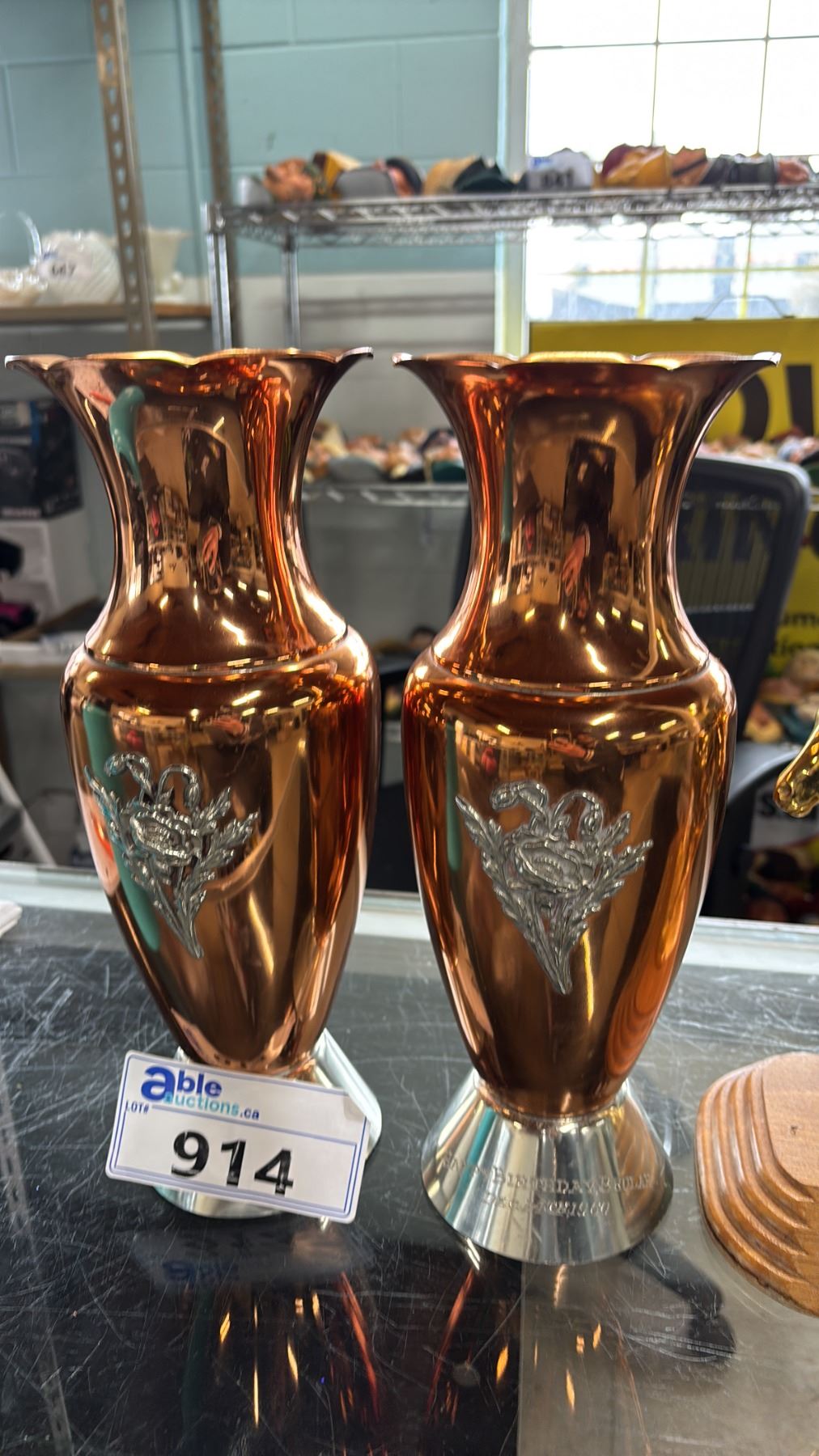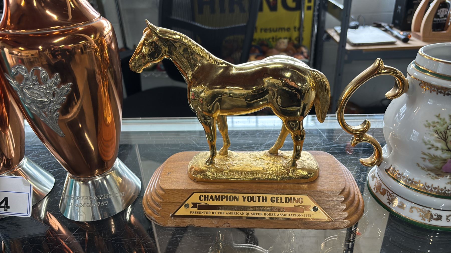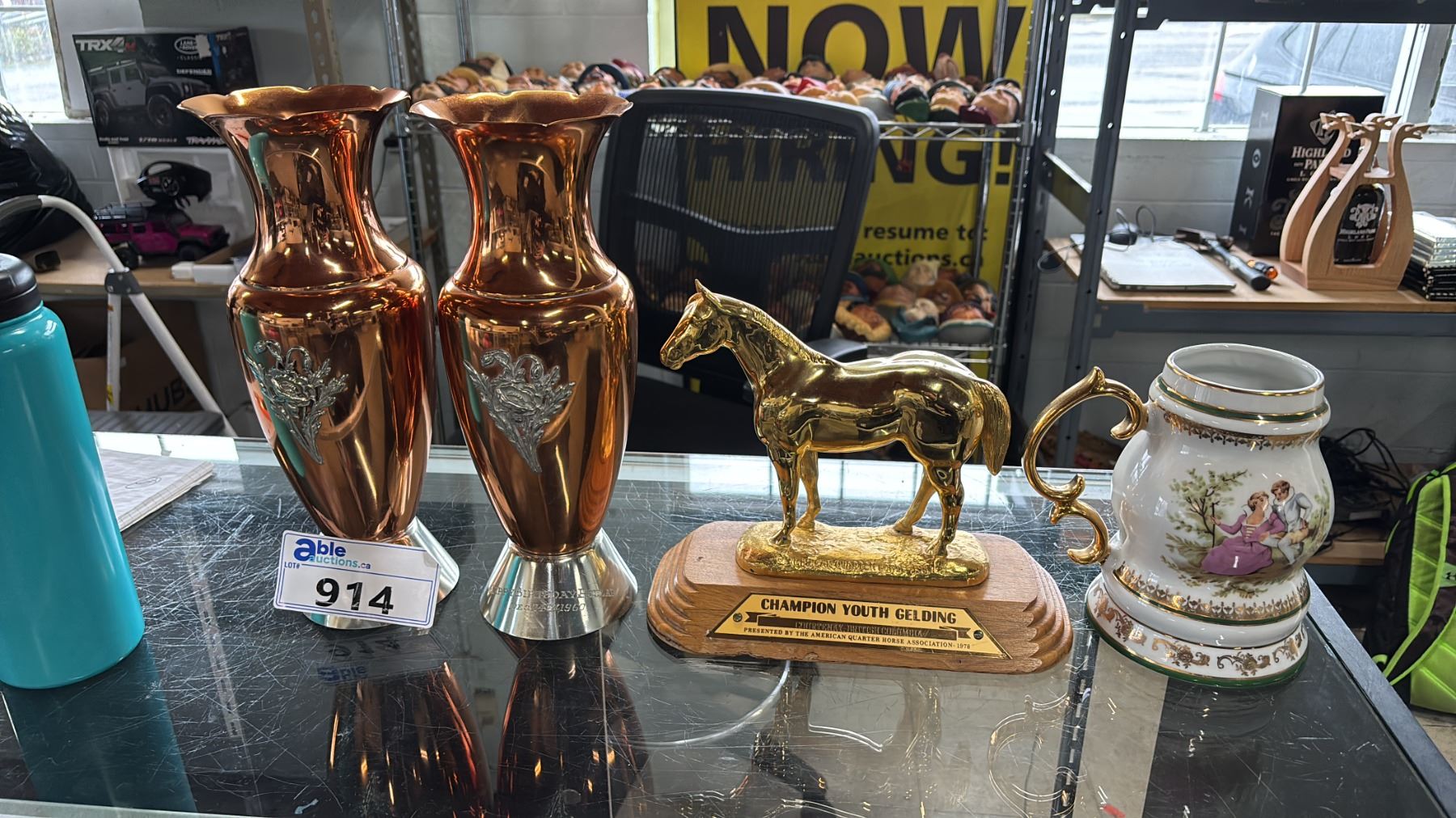 VINTAGE POLISH STEIN, CHAMPION YOUTH GELDING TROPHIE & PAIR OF VINTAGE VASES (1 WITH INSCRIPTION)