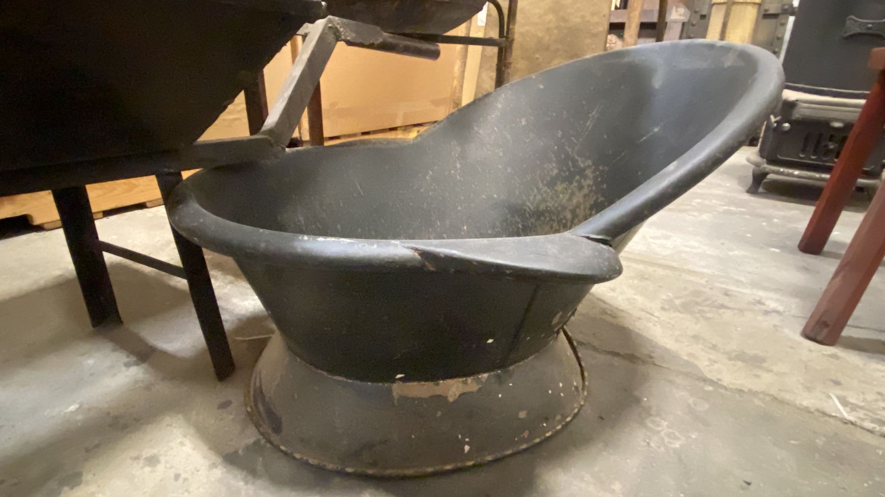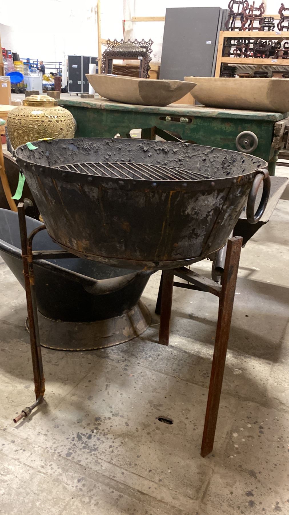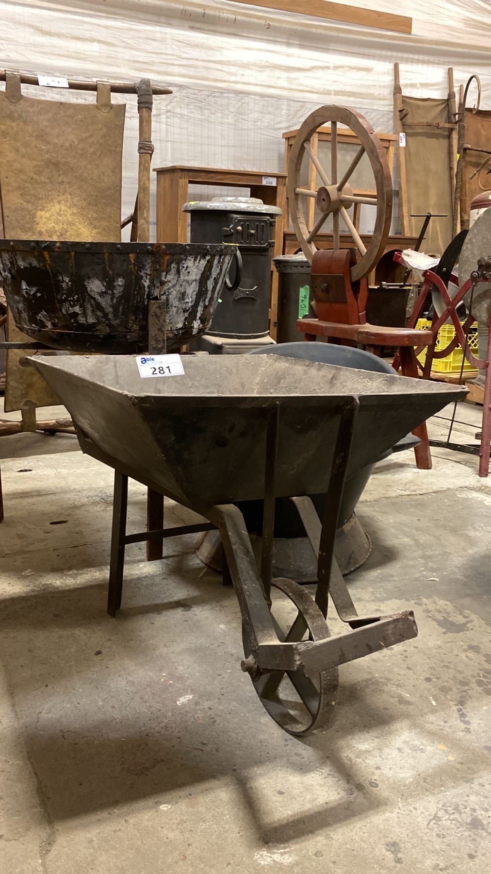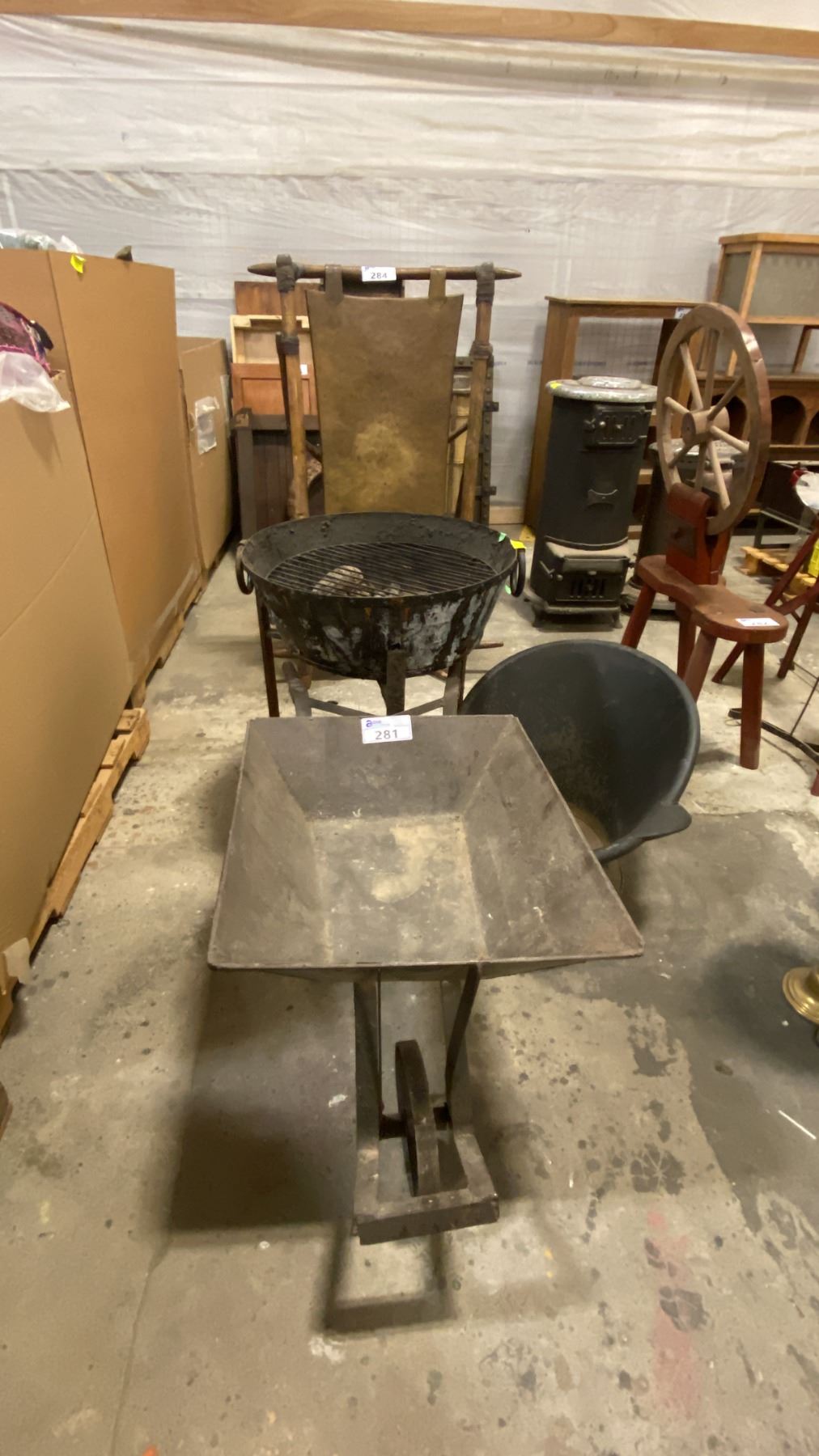 VINTAGE RUSTIC WHEELBARROW, SET DEC METAL FIRE PIT & WOOD OR COAL SCUTTLE