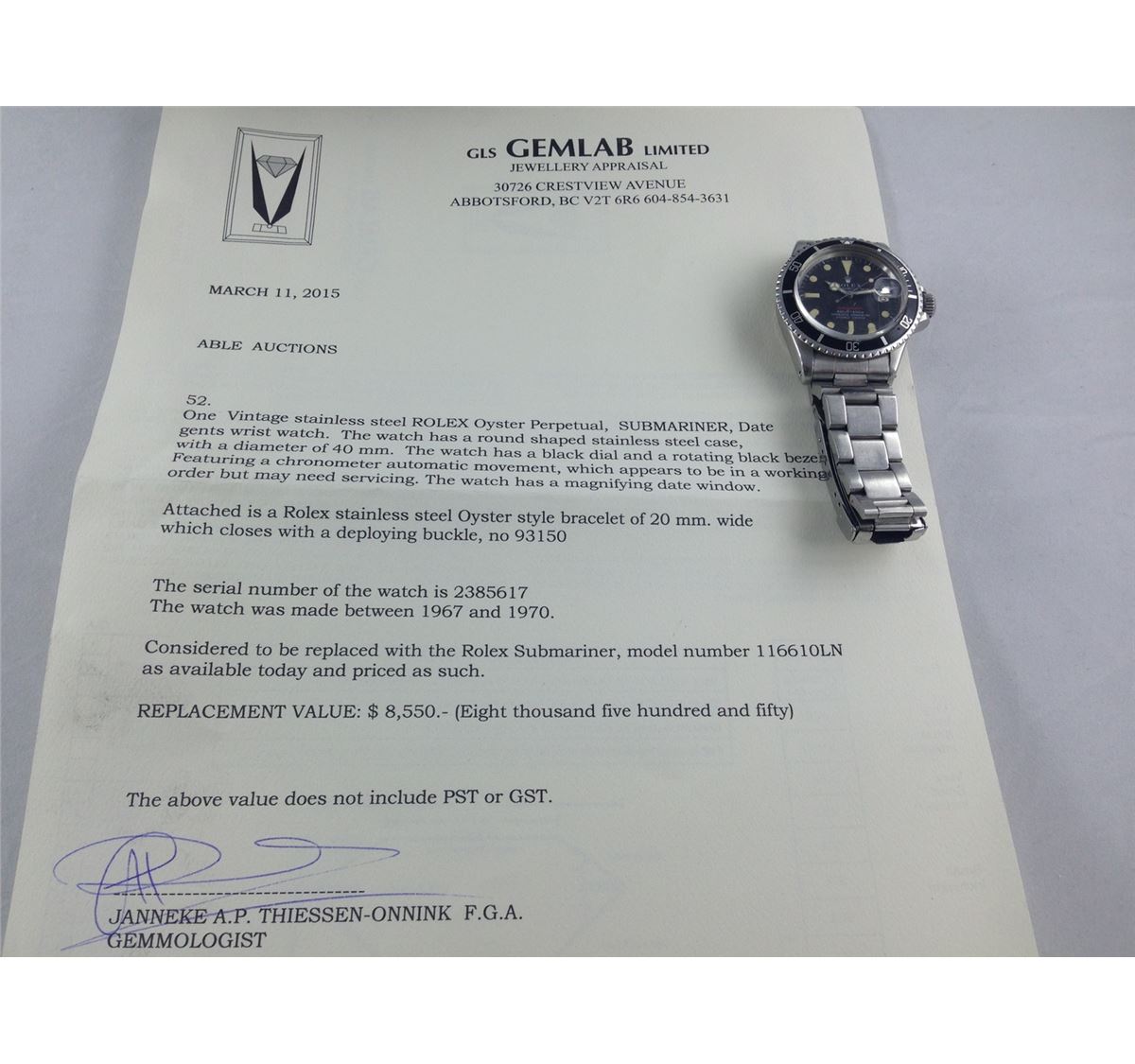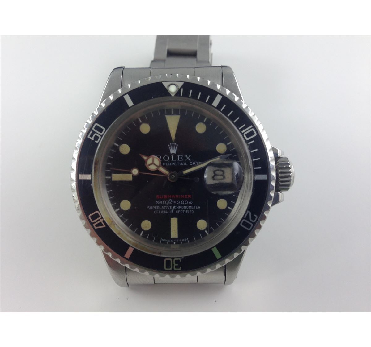 VINTAGE STAINLESS STEEL ROLEX OYSTER PERPETUAL, SUBMARINER, DATE GENTS WRIST WATCH.  HAS A BLACK DIAL AND A ROTATING BLACK BEZEL. AUTOMATIC MOVEMENT.  ATTACHED IS A STAINLESS STEEL OYSTER STYLE BRACELET. MADE BETWEEN 1967-1970.  REPLACEMENT VALUE:$8550.00
