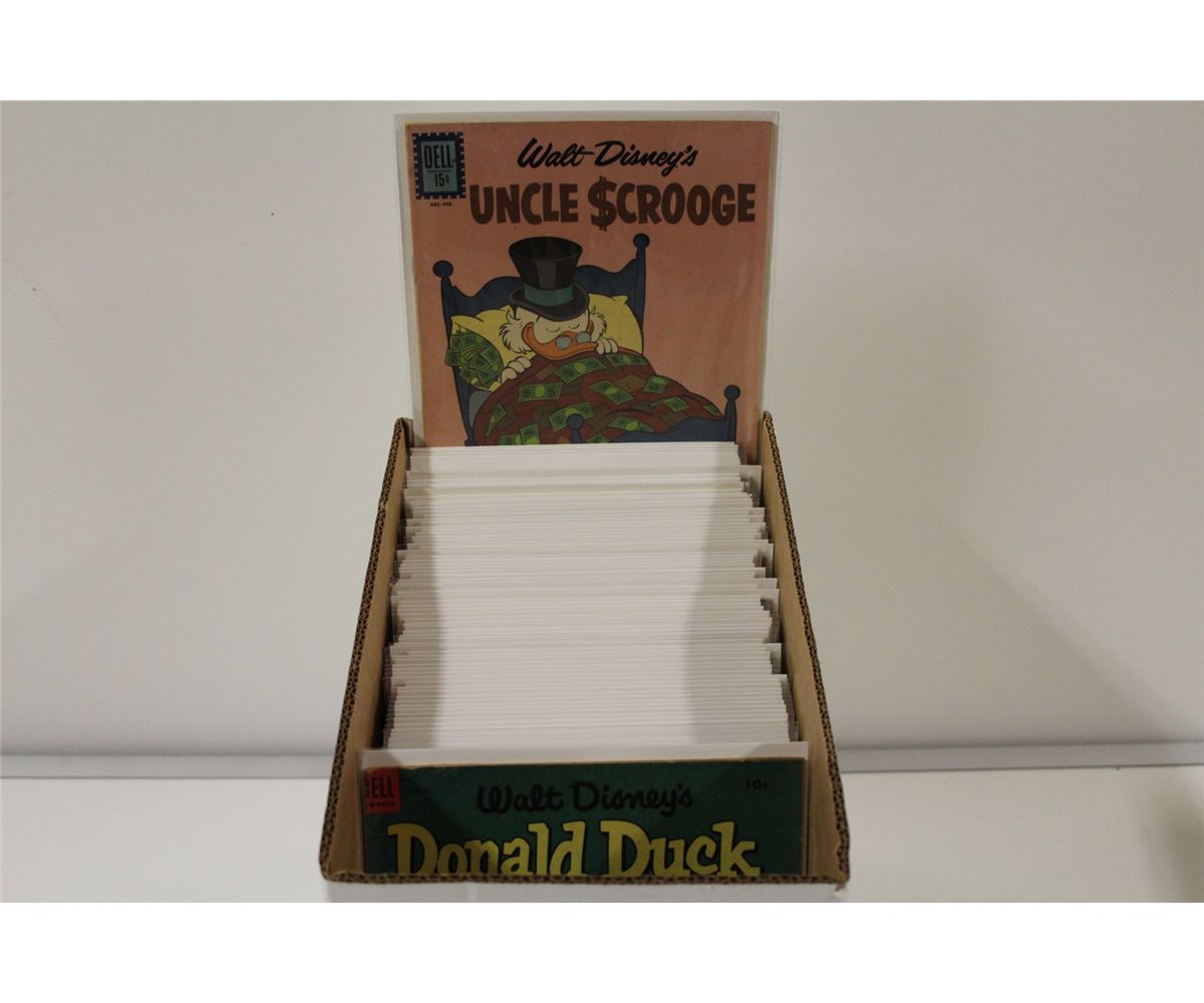 VINTAGE WALT DISNEY DUCKS SHORT BOX OF RUNS & TITLES (1950'S-90'S) FULL SHORT BOX , NO DUPLICATES. INCLUDES DONALD DUCK #37 (1954)-UP (20 ISSUES) UNCLE SCROOGE #36-UP (22 ISSUES) & MULIPLE OTHER DUCK TITLES. MOST ISSUES FROM THE '60'S & '70'S, MIXED GRADES WITH MANY SHARP COPIES