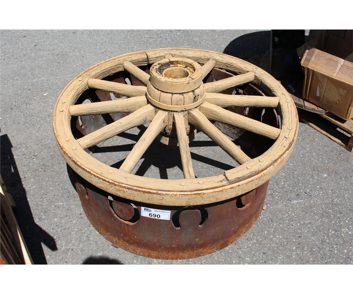 VINTAGE WOODEN WAGON WHEEL AND A METAL HORSESHOE FIREPIT RING