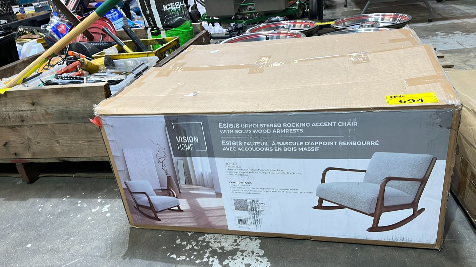 VISION HOME ESTERS UPHOLSTERED CLOUDY GREY ROCKING ACCENT CHAIR WITH SOLID WOOD ARMRESTS * IN BOX *