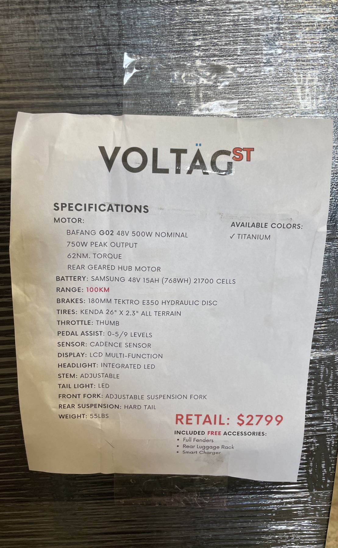VOLTAG TITANIUM ELECTRIC BIKE WITH CHARGER ( NN-715026MDG ) - 100KM RANGE, HYDRAULIC DISC BRAKES, 9 LEVELS, LCD MULTI FUNCTION DISPLAY, HEADLIGHT + TAILLIGHT, ADJUSTABLE STEM + FRONT SUSPENSION FORK MOTOR: BAFANG G02 48V 500W NOMINAL, 750W PEAK OUTPUT, REAR GEARED HUB MOTOR BATTERY: SAMSUNG 48V 15AH ( 21700 CELLS ) TIRES: KENDA ALL TERRAIN 26" X 2.3" WEIGHT: 55LBS *IN BOX*