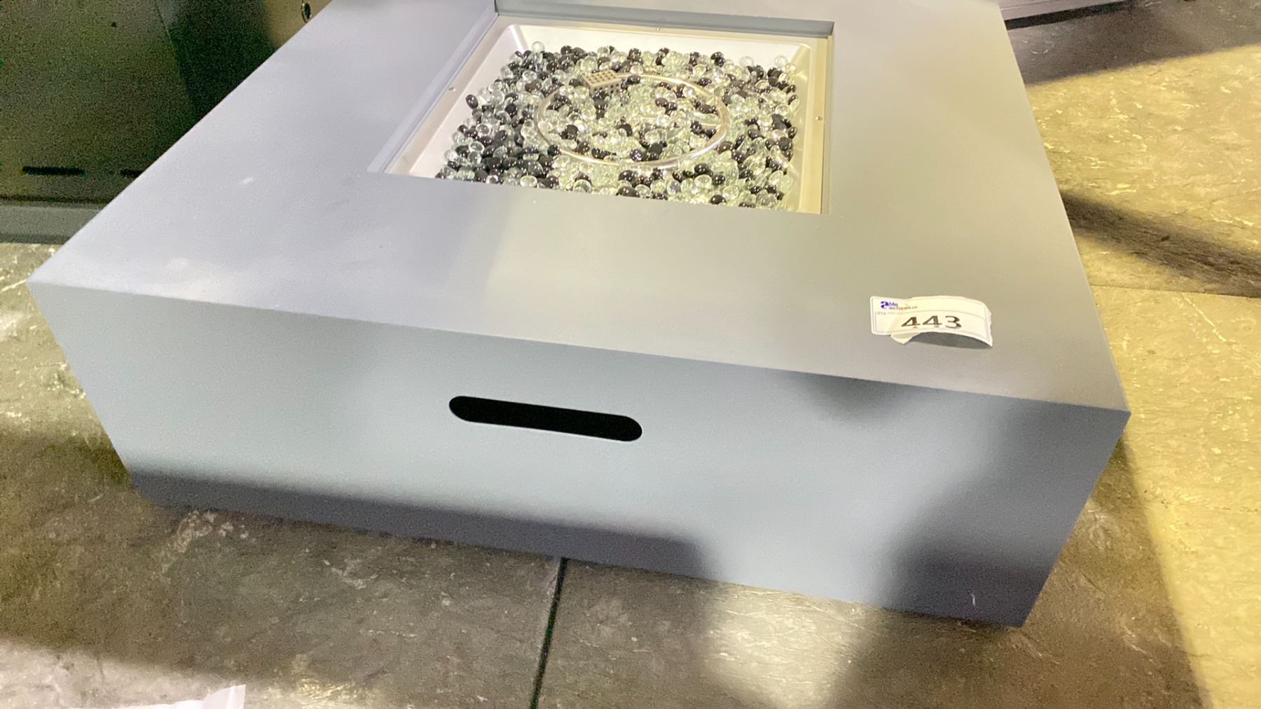 VULCAN 38" SQUARE FIRE TABLE. GREY. COMES WITH GLASS SURROUND, COVER AND LID. PROPANE.