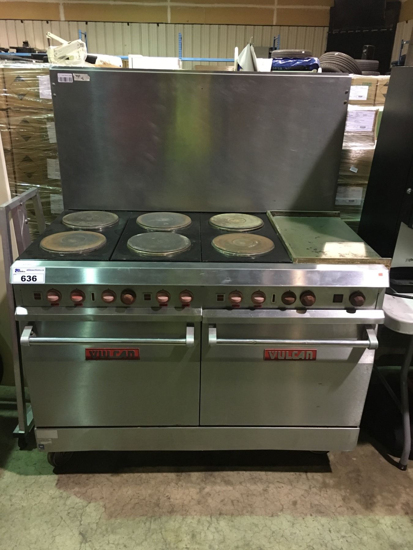 VULCAN STAINLESS STEEL 50"X 30" COMMERCIAL 6 BURNER DUAL OVEN ELECTRIC RANGE WITH GRIDDLE AND BACK SPLASH
