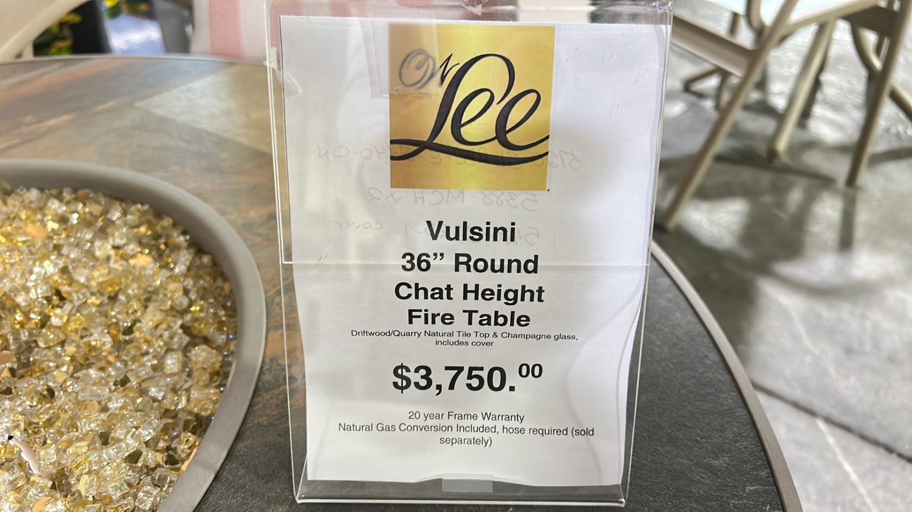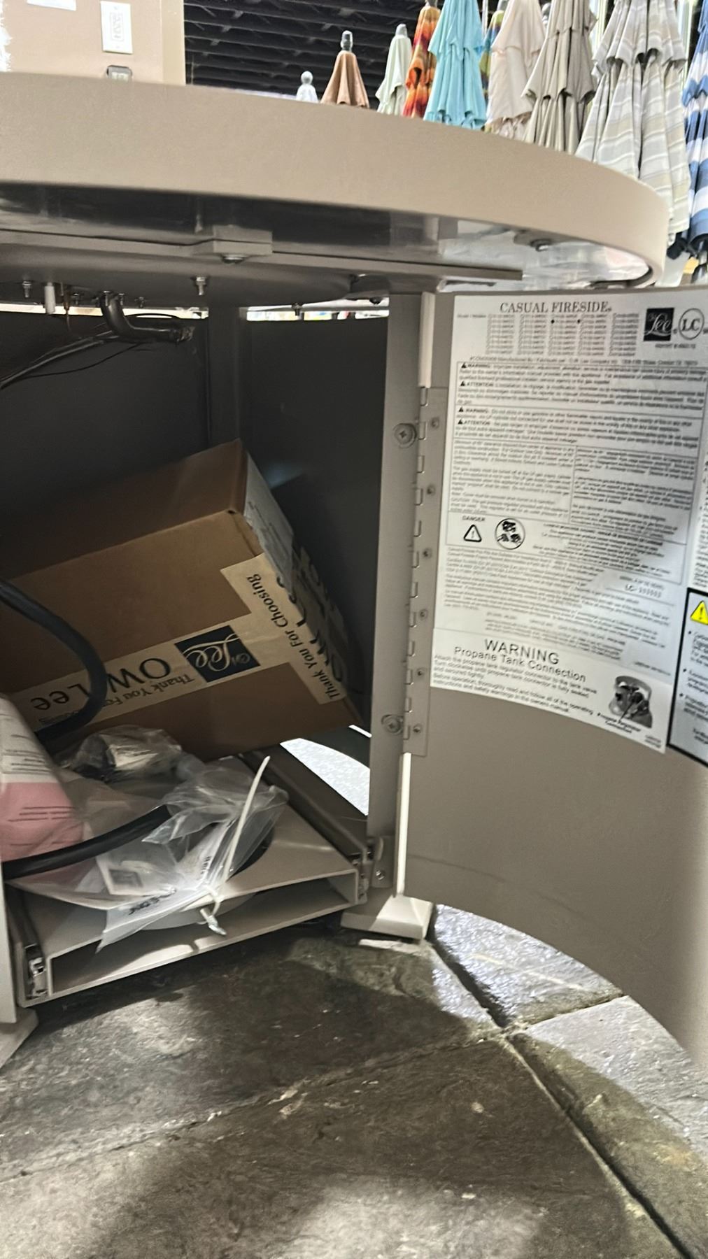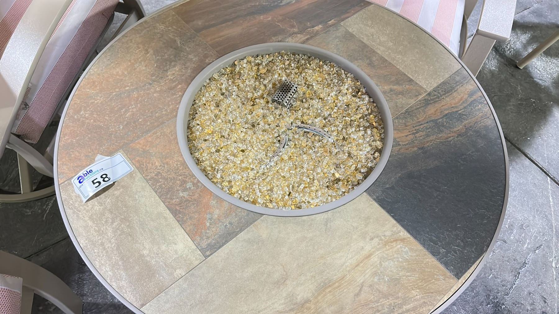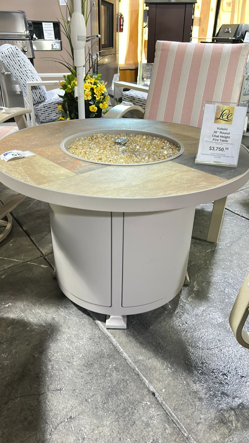 VULSINI 36" ROUND CHAT HEIGHT FIRE TABLE. DRIFTWOOD/QUARRY NATURAL TILE TOP & CHAMPAGNE GLASS. INCLUDES COVER. SET FOR PROPANE, NATURAL GAS CONVERSION INC. HOSE REQUIRED.