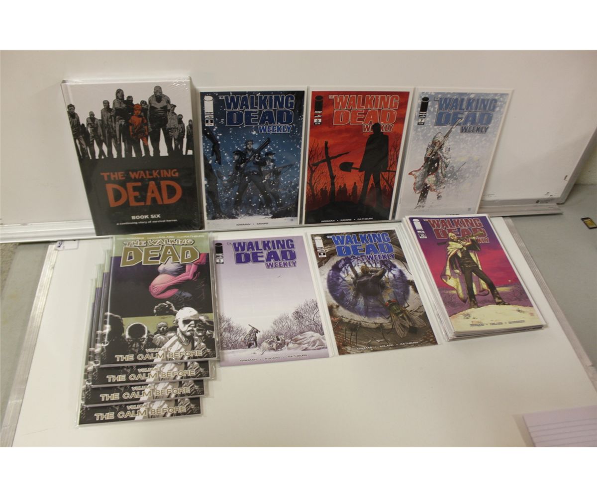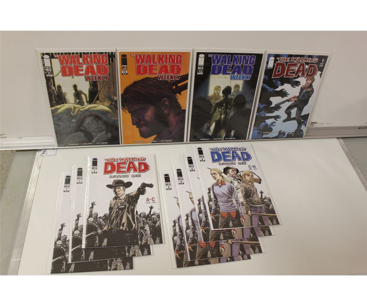 WALKING DEAD MIXED COMICS & TRADES, BIG LOT, INCLUDES WALKING DEAD WEEKLY #5-13 CONSECUTIVE, SPECIAL #2, SURVIVORS' GUIDE #1-2 X 7 COPIES, TRADE PAPERBACK VOLUME 7X4 COPIES & 1 HARD COVER VOLUME 6.  22 TOTAL, HIGH GRADE