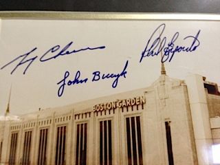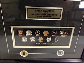 WALL MOUNT SHOWCASE FEATURING BOSTON BRUIN LEGENDS SIGNED BY: GERRY CHEEVERS, JOHN BUCYK AND PHIL ESPOSITO, WITH C.O.A.
