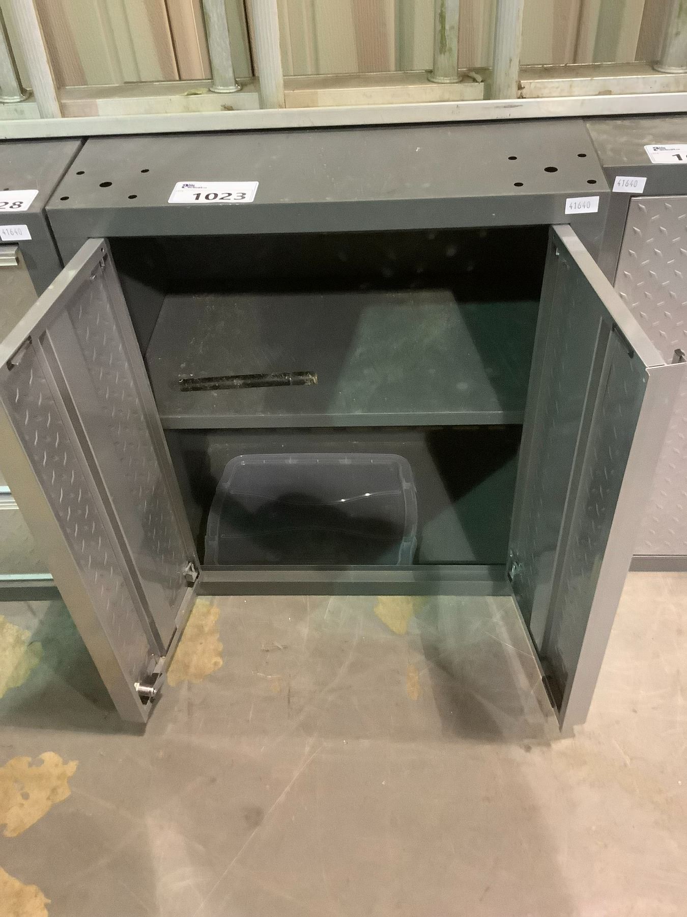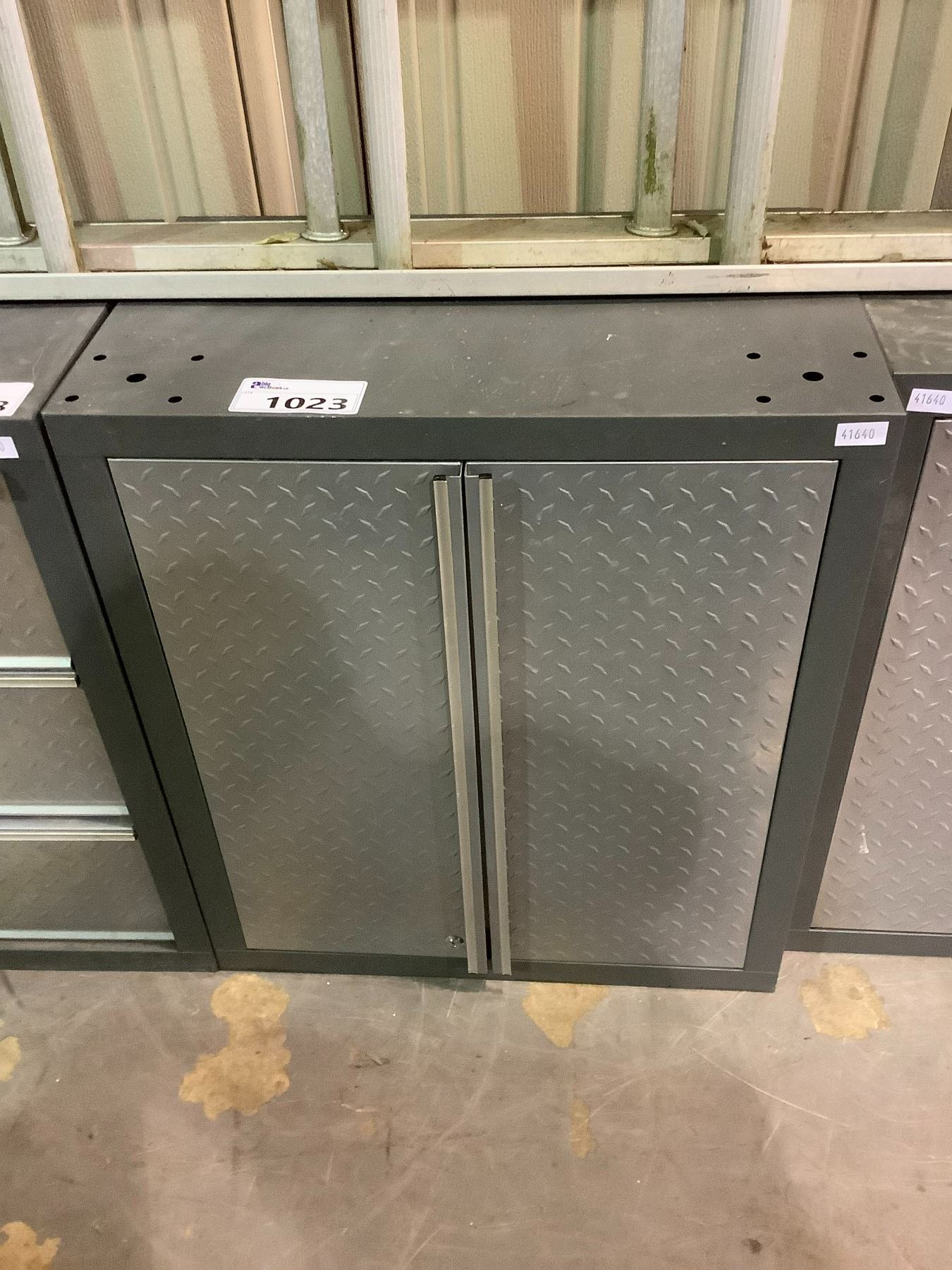 WALL MOUNT STAINLESS STEEL & GREY SHOP CABINET 2 DOOR WITH SHELVES APPROX. 30X26X12"