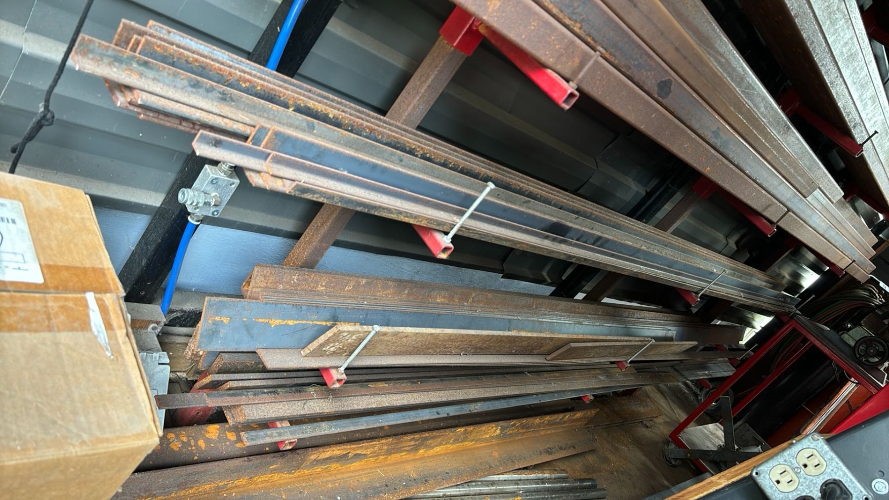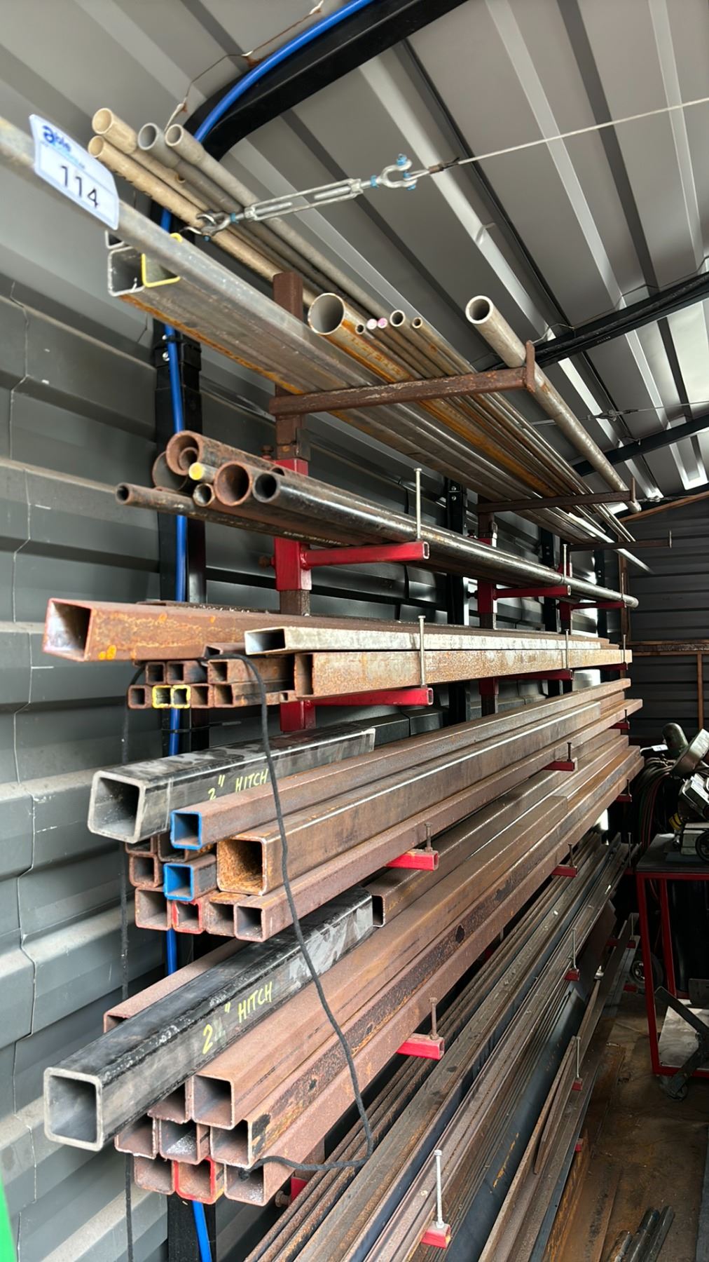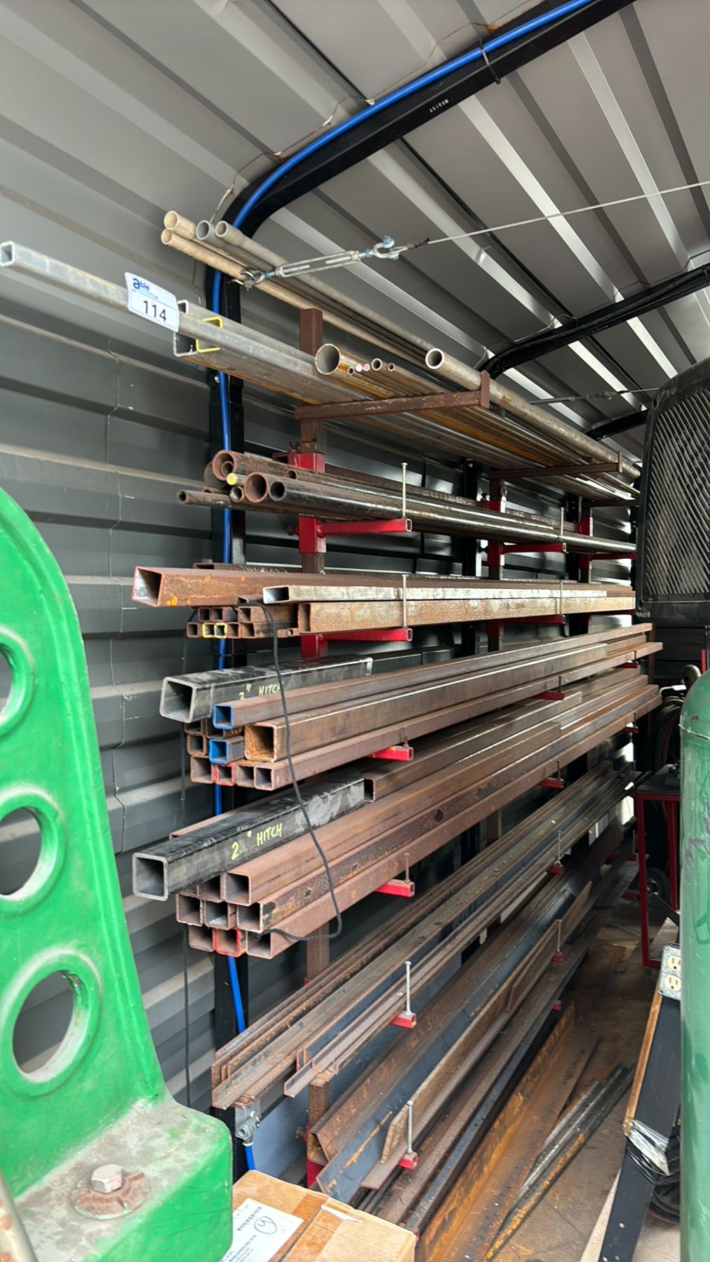 WALL MOUNT STEEL MATERIAL RACK WITH LARGE ASSORTMENT OF STEEL LENGTHS - ANGLE IRON, FLATBAR, SQUARE TUBING, ROUND TUBING, & SOME ALUMINUM * WALL MOUNT RACK INCLUDED *
