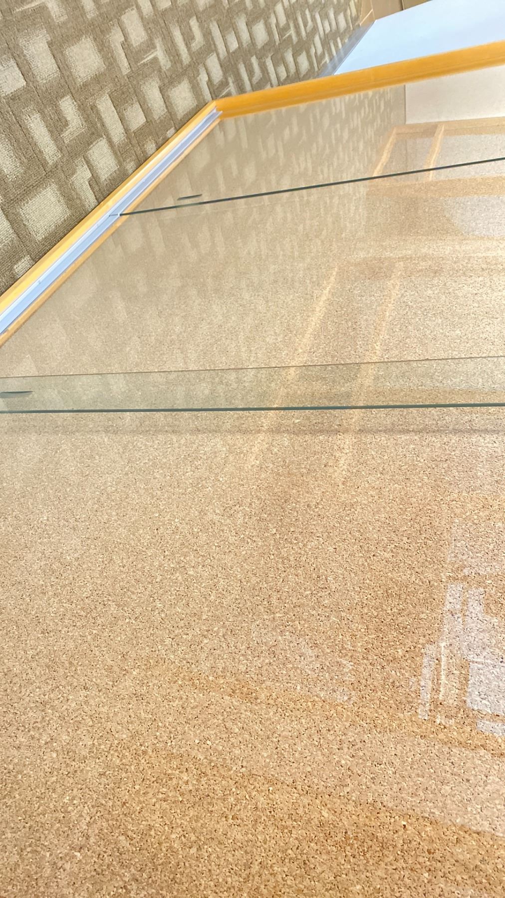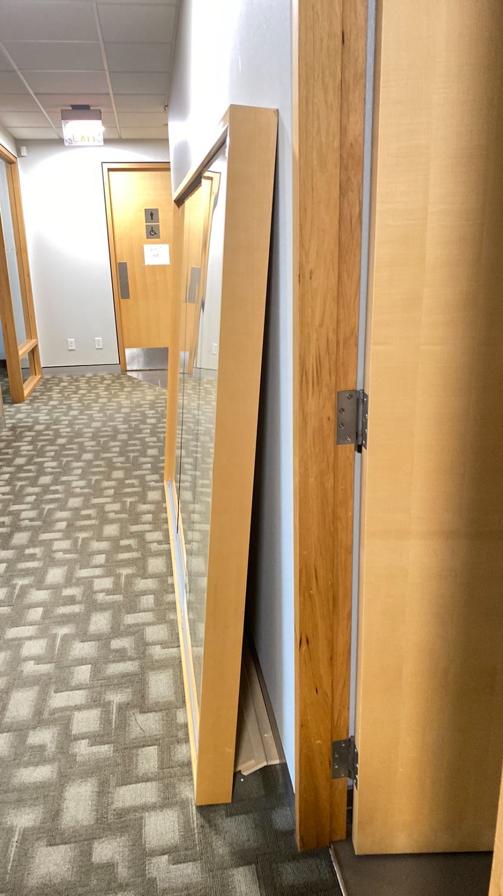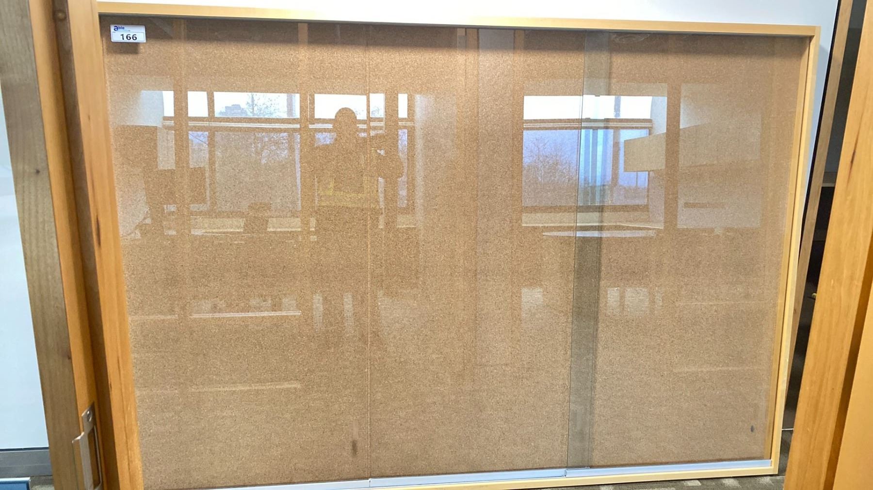 WALL MOUNT WOOD FRAMED SLIDING GLASS DOOR FRONT BULLETIN BOARD DISPLAY CASE APPROX. 8FT ACROSS X 5 1/2FT WIDE X 4" DEEP