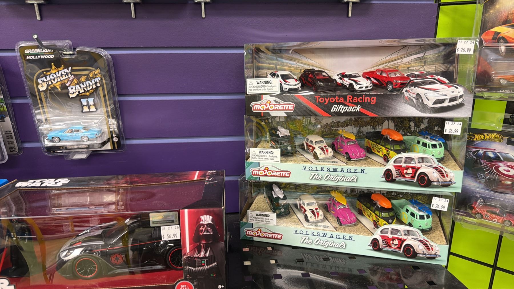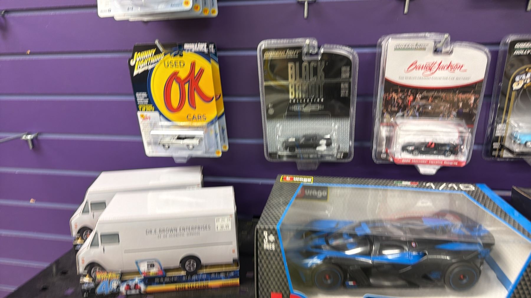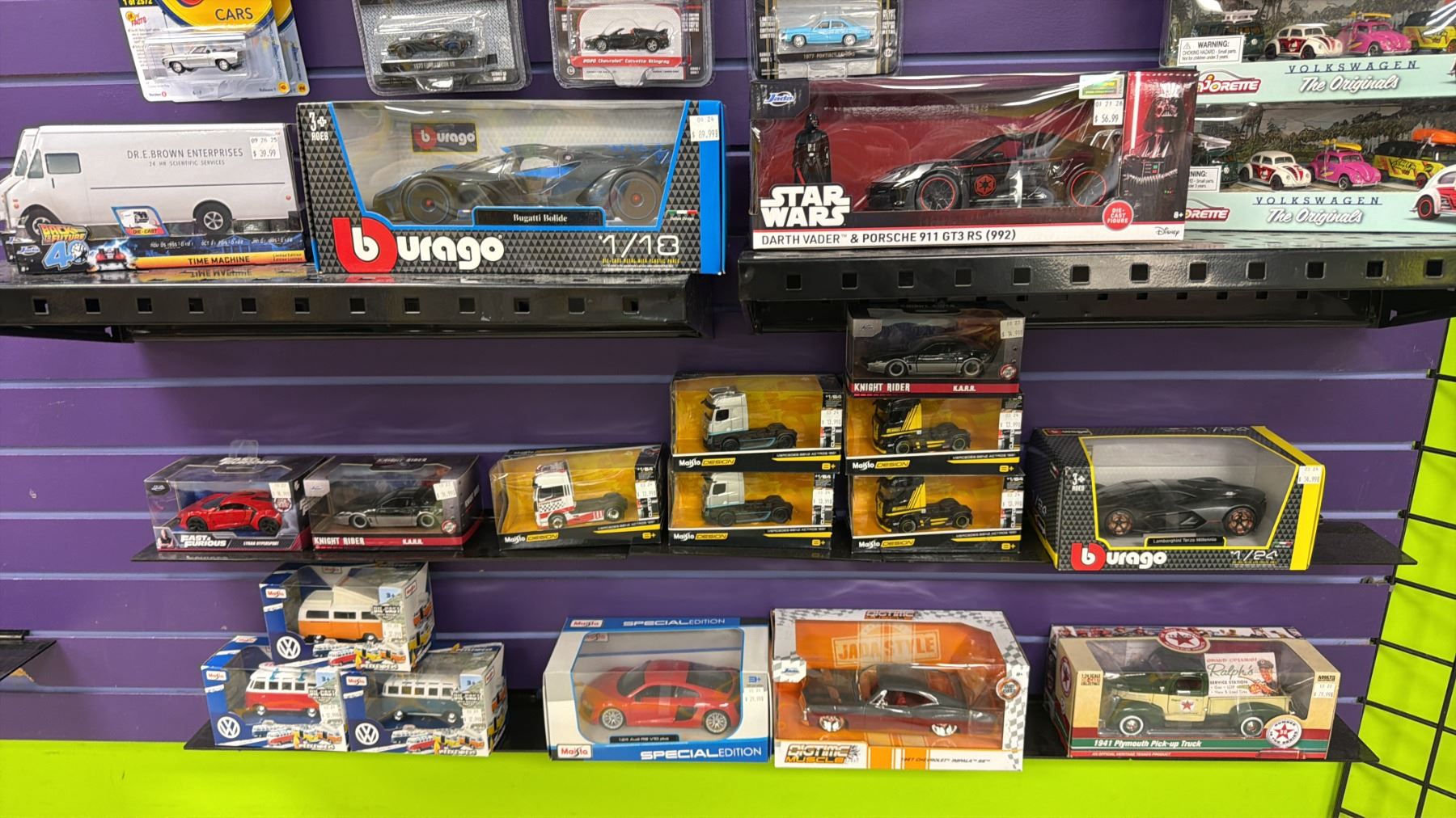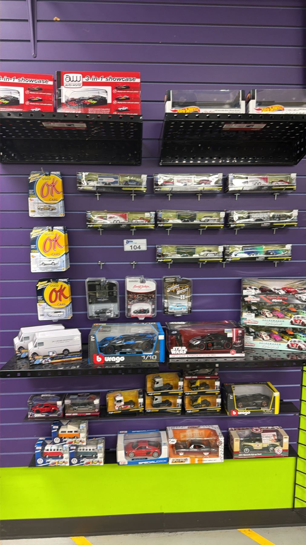 WALL OF ASSORTED MODEL CARS INCLUDING; STAR WARS DARTH VADER & PORSCHE 911 GT3 RS, BURAGO BUGATTI BOLIDE, BACK TO THE FUTURE 4 TIME MACHINE & MORE