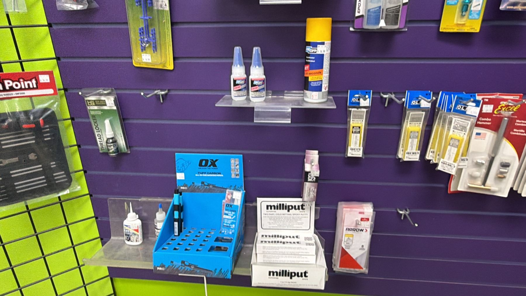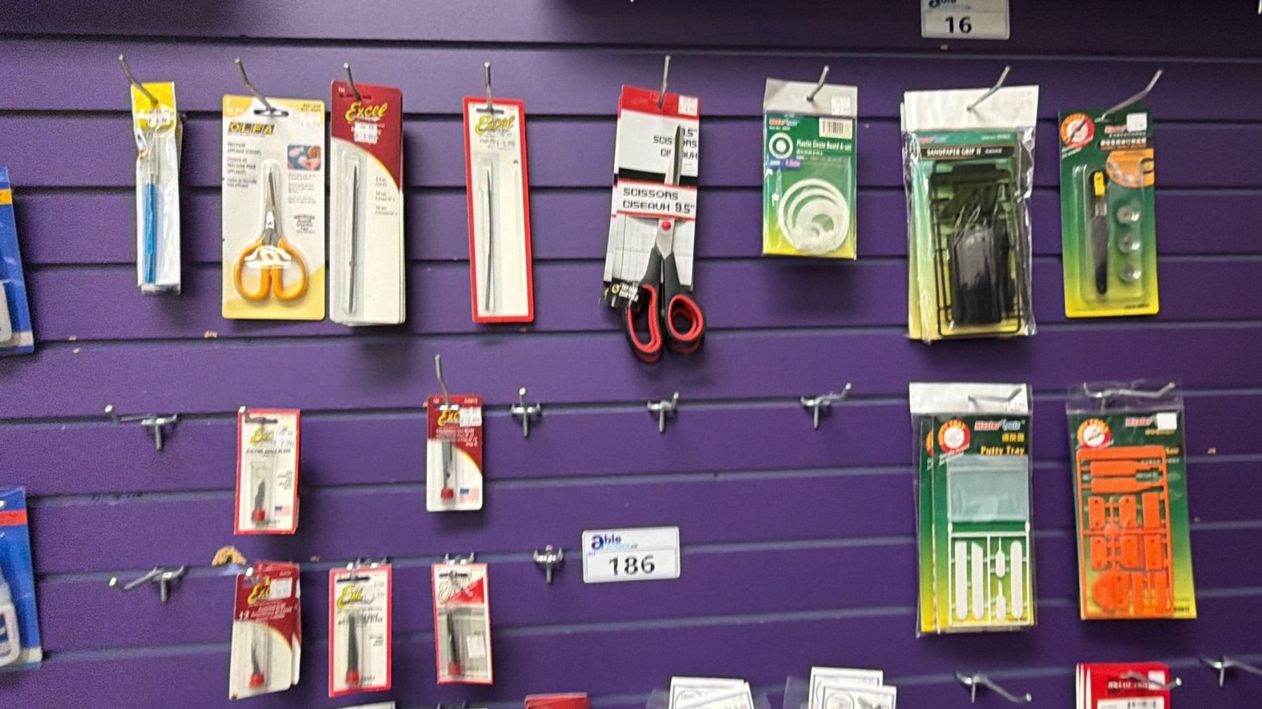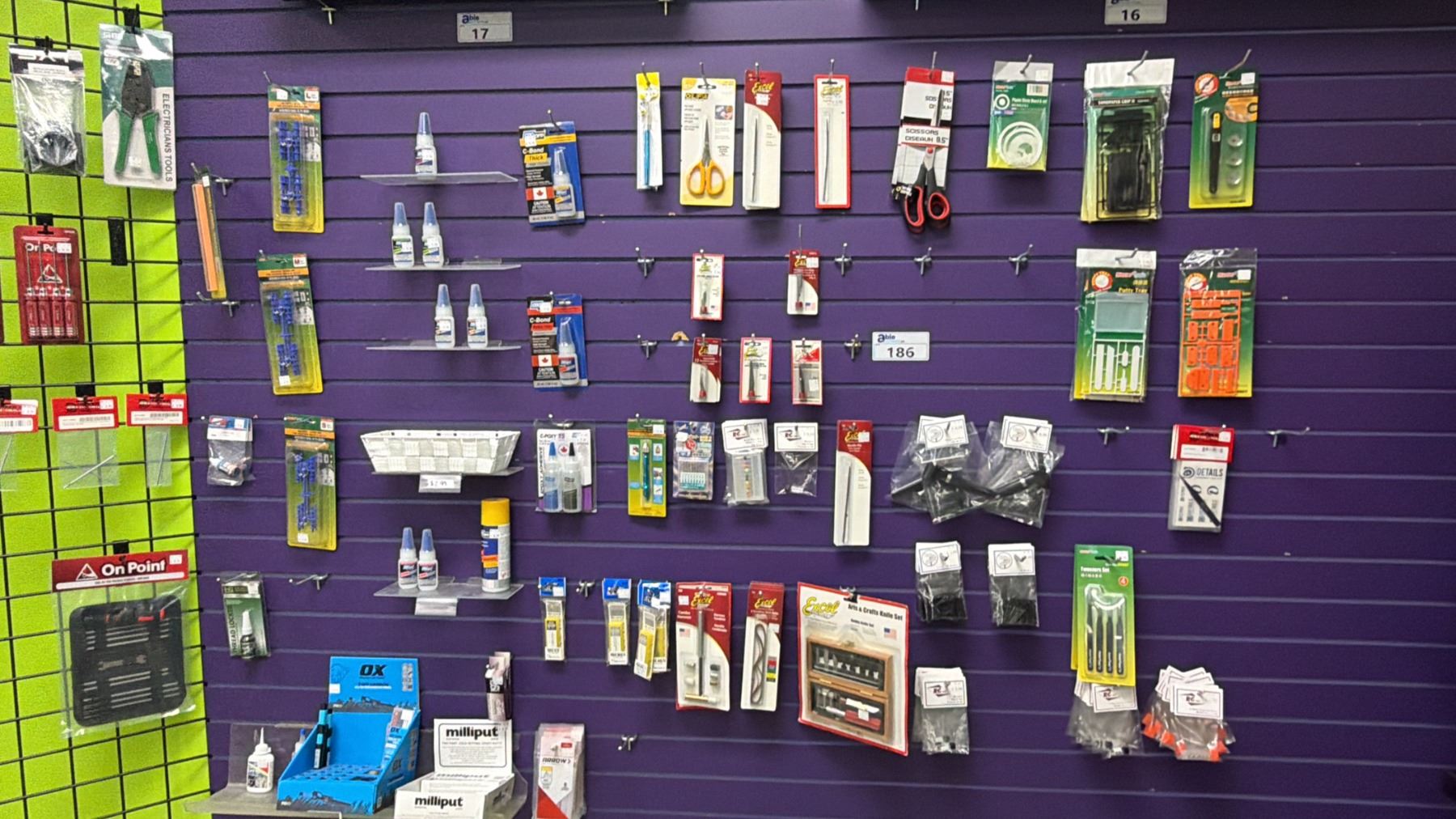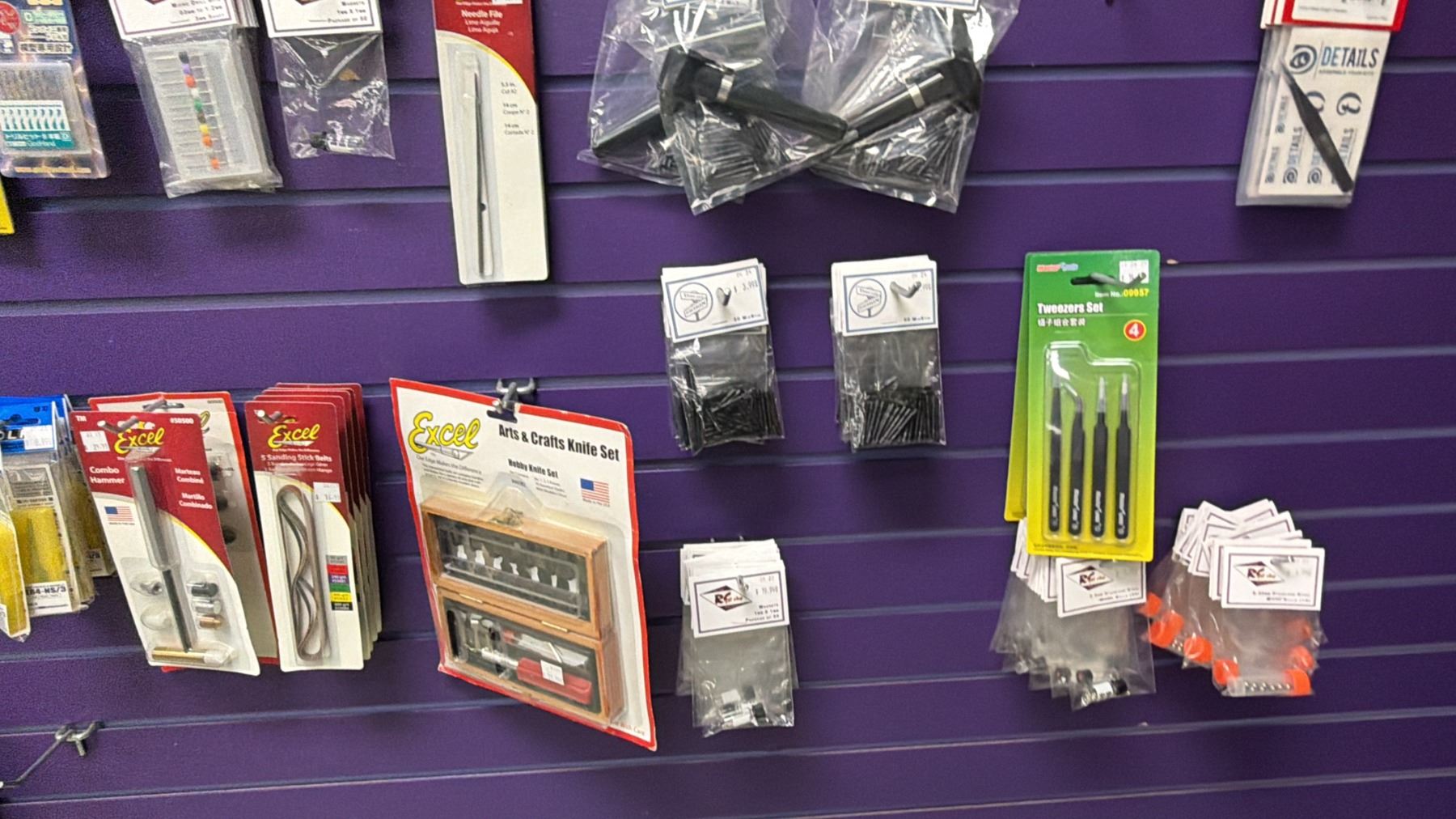 WALL OF ASSORTED R/C, HOBBY & MODEL CAR ACCESSORIES & TOOLS