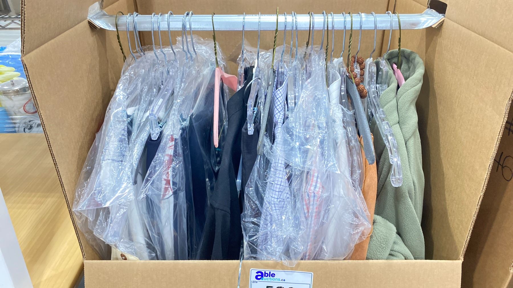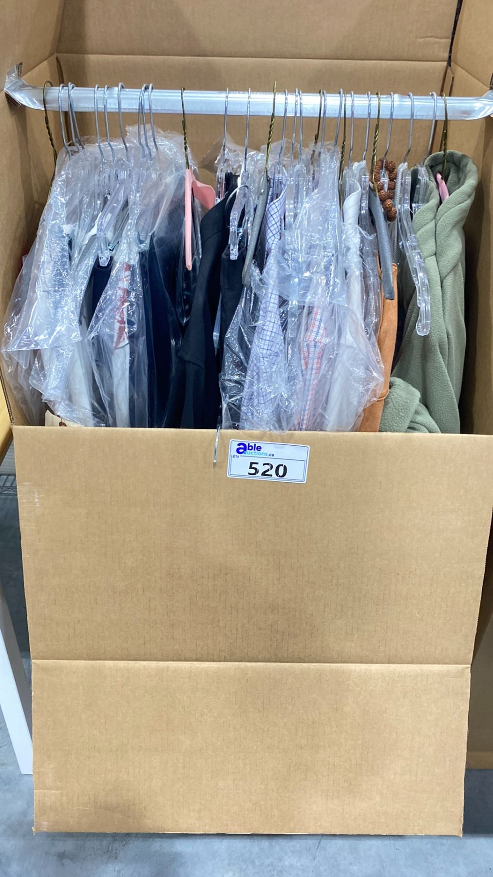 WARDROBE BOX OF ASSORTED CLOTHING (BOX AND ALL CONTENTS MUST BE TAKEN)