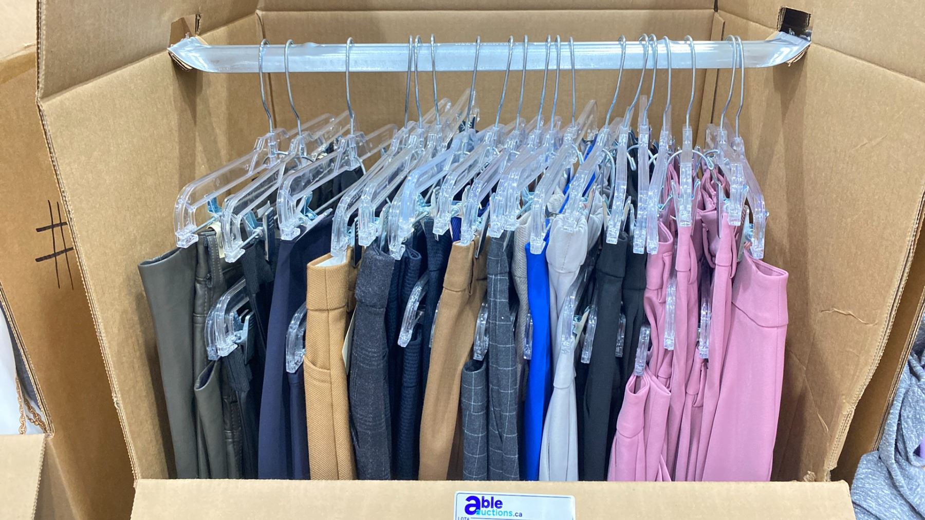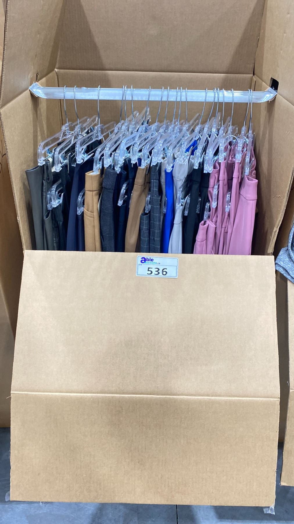 WARDROBE BOX OF ASSORTED CLOTHING (BOX AND ALL CONTENTS MUST BE TAKEN)