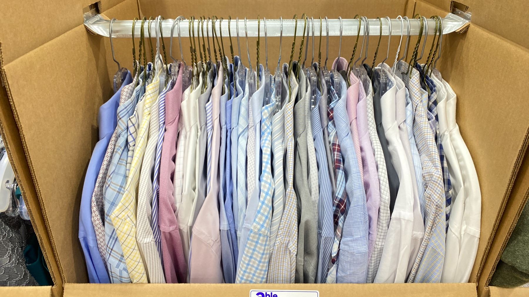 WARDROBE BOX OF ASSORTED CLOTHING (BOX AND ALL CONTENTS MUST BE TAKEN)