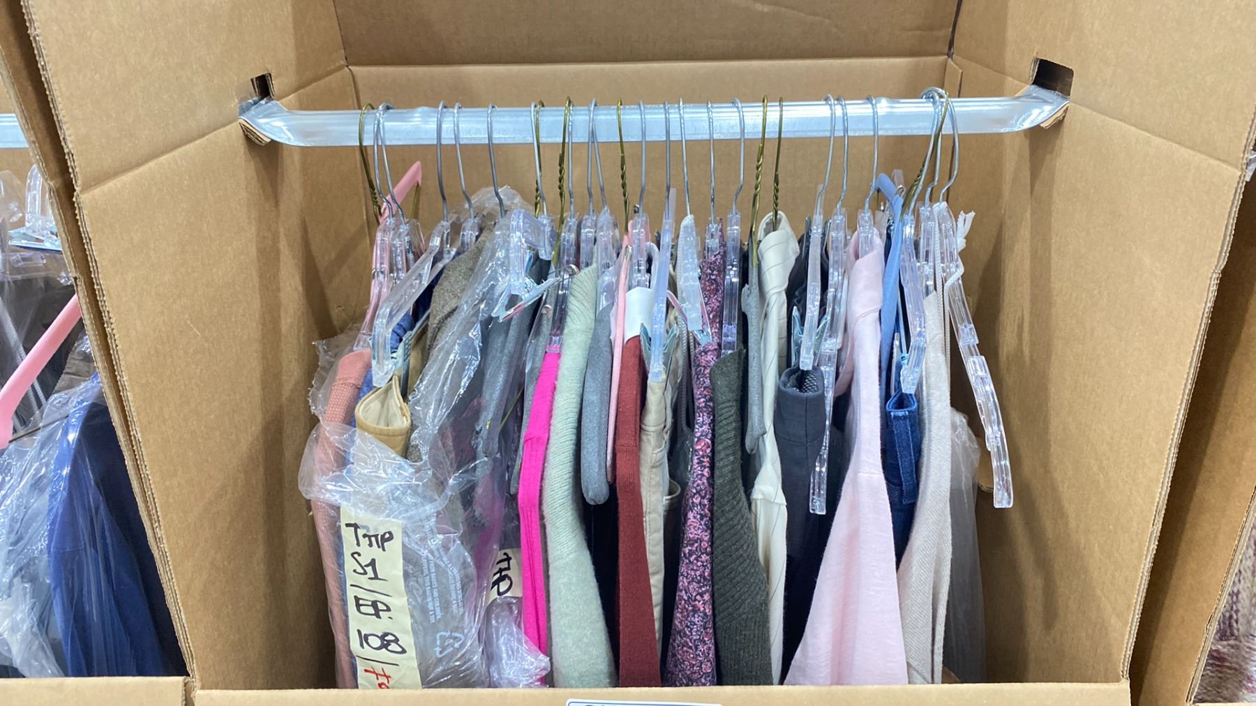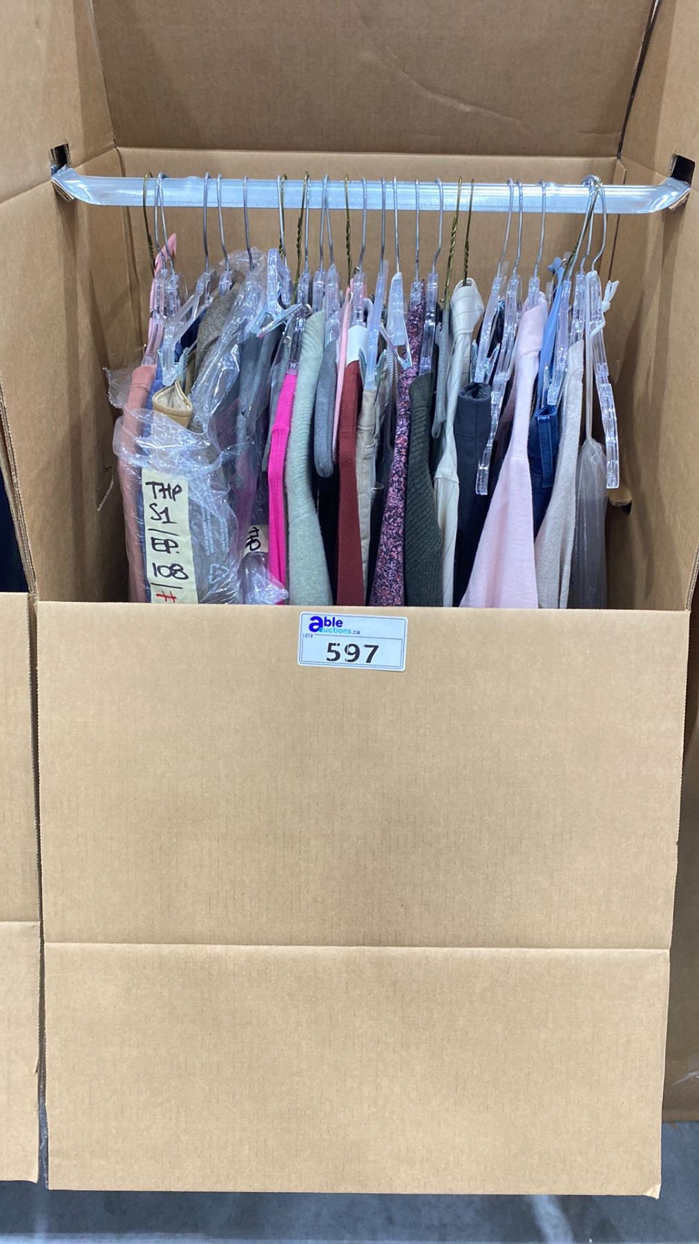 WARDROBE BOX OF ASSORTED CLOTHING (BOX AND ALL CONTENTS MUST BE TAKEN)