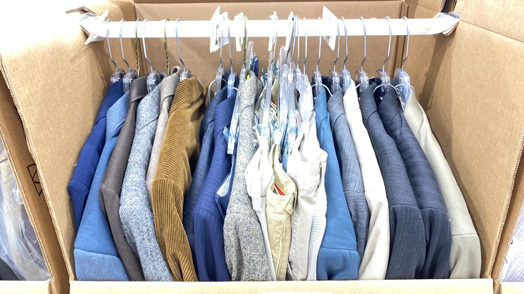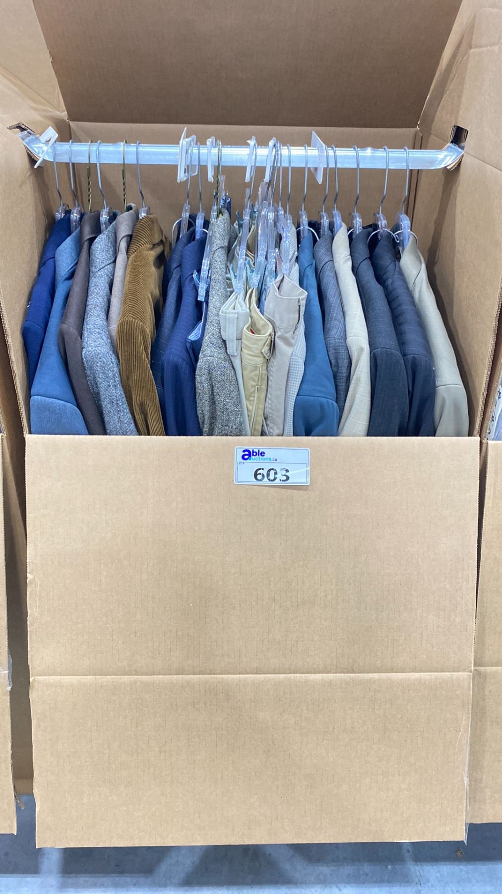 WARDROBE BOX OF ASSORTED CLOTHING (BOX AND ALL CONTENTS MUST BE TAKEN)