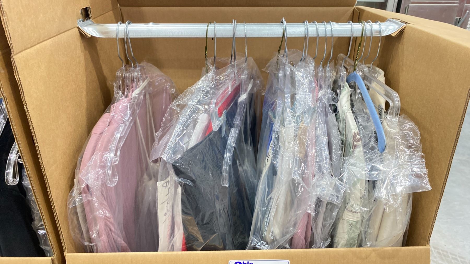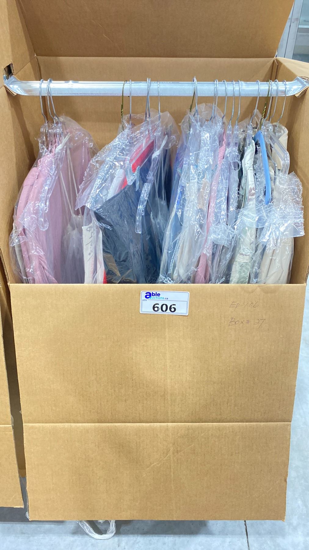 WARDROBE BOX OF ASSORTED CLOTHING (BOX AND ALL CONTENTS MUST BE TAKEN)