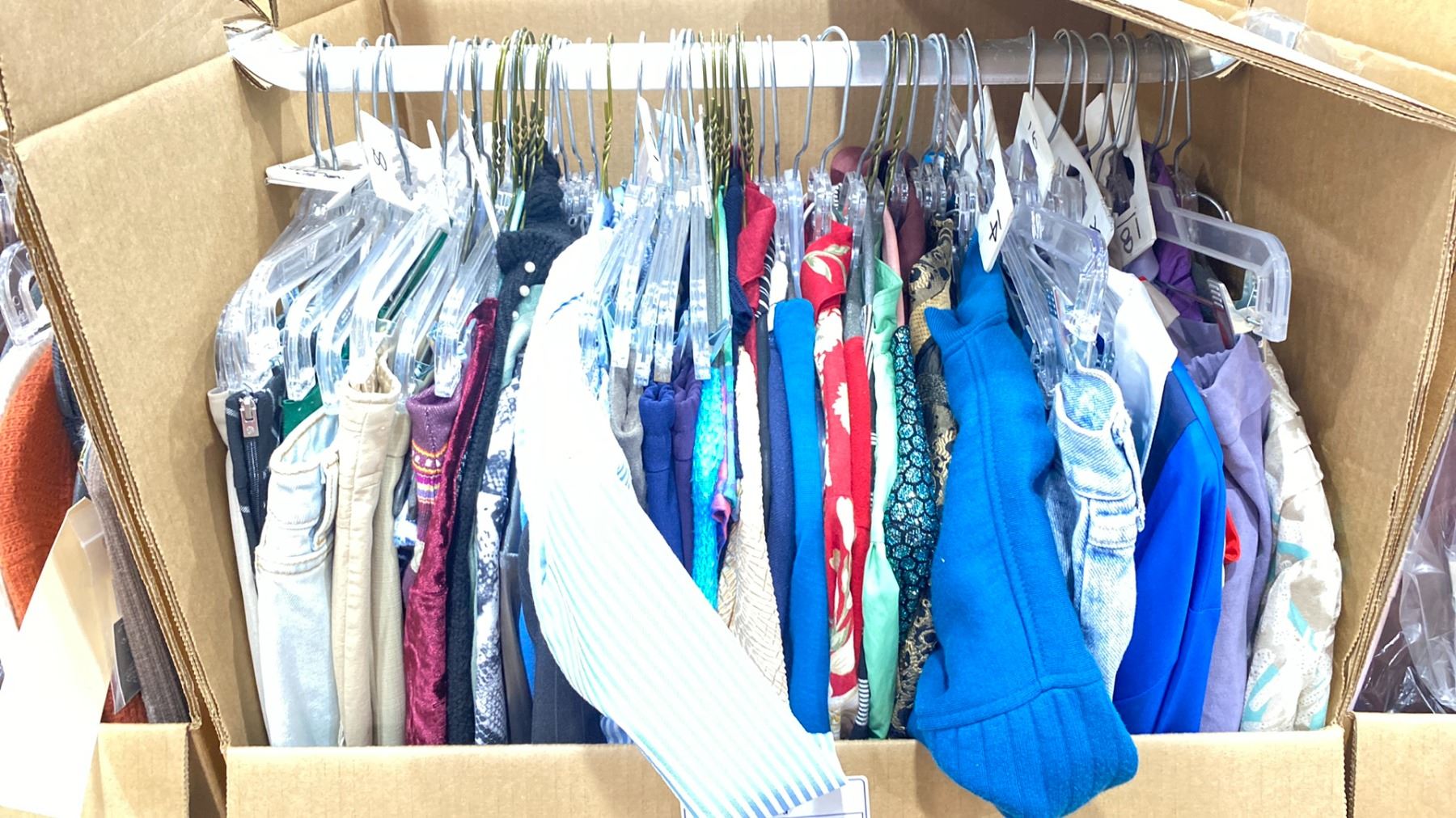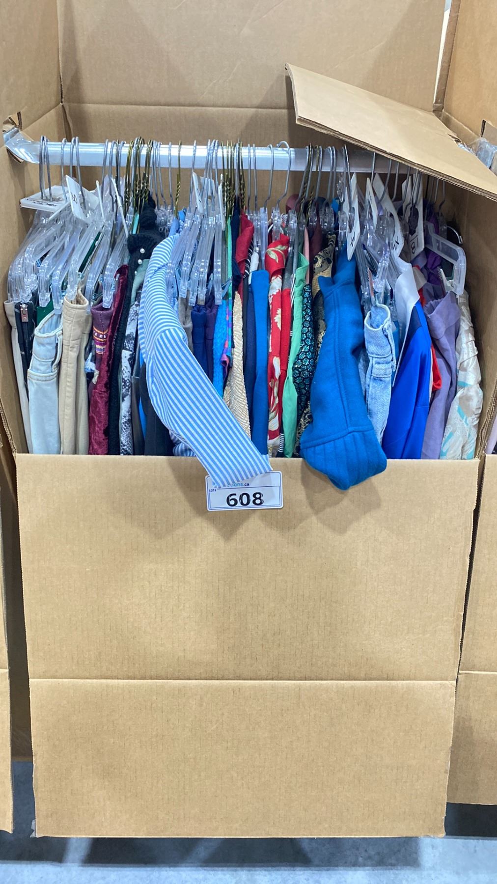 WARDROBE BOX OF ASSORTED CLOTHING (BOX AND ALL CONTENTS MUST BE TAKEN)
