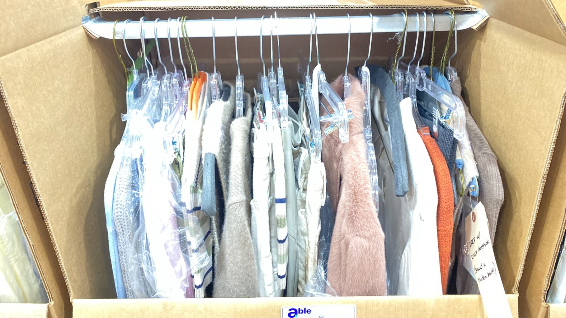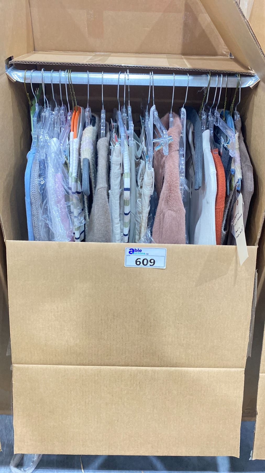 WARDROBE BOX OF ASSORTED CLOTHING (BOX AND ALL CONTENTS MUST BE TAKEN)