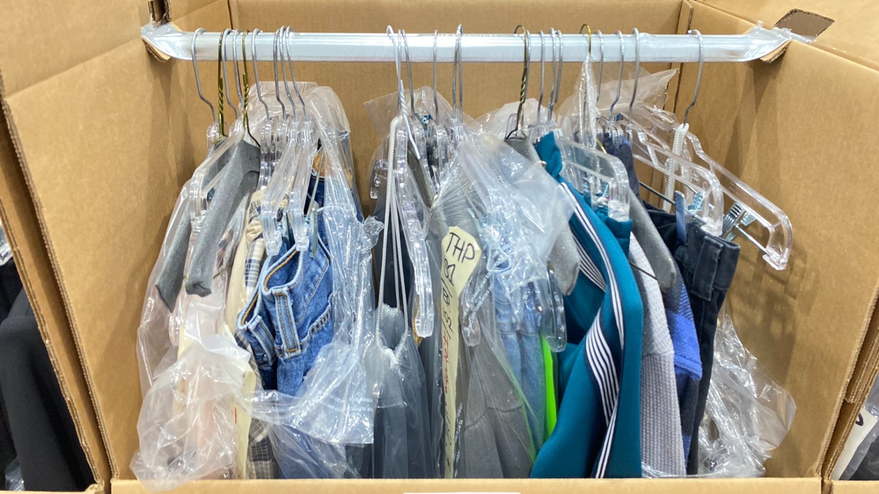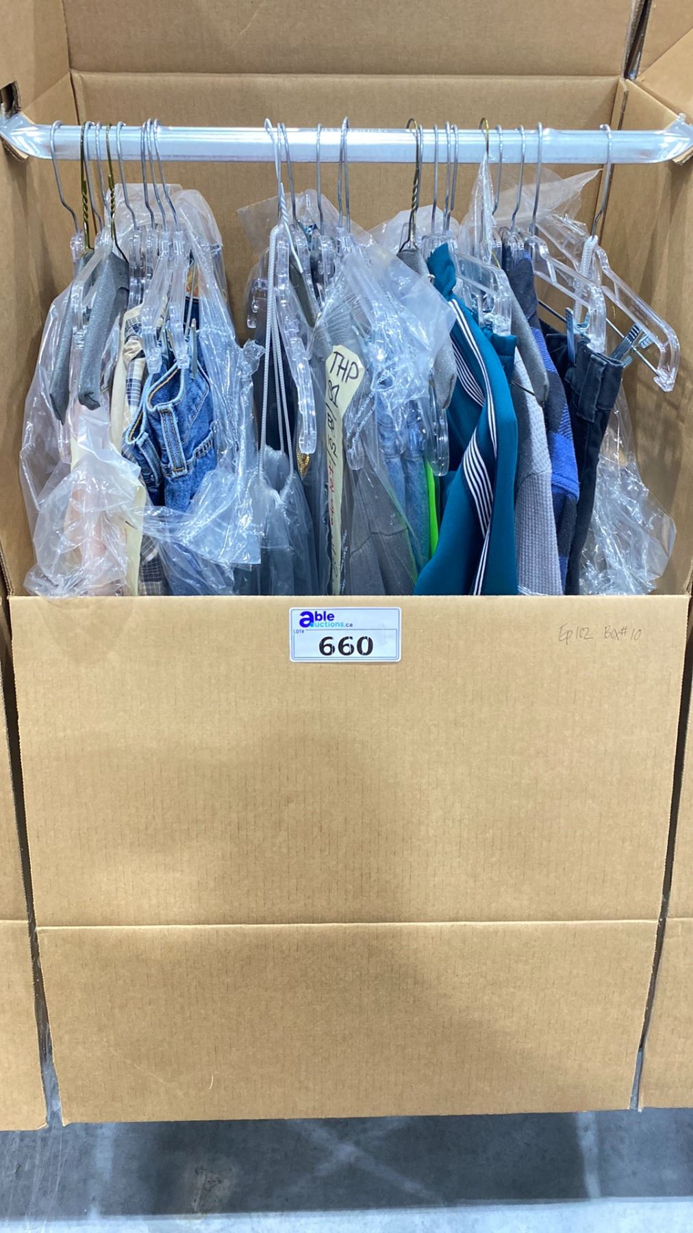 WARDROBE BOX OF ASSORTED CLOTHING (BOX AND ALL CONTENTS MUST BE TAKEN)