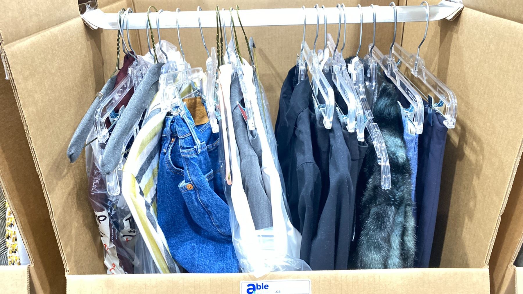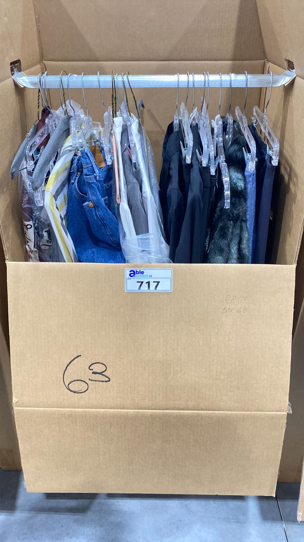 WARDROBE BOX OF ASSORTED CLOTHING (BOX AND ALL CONTENTS MUST BE TAKEN)
