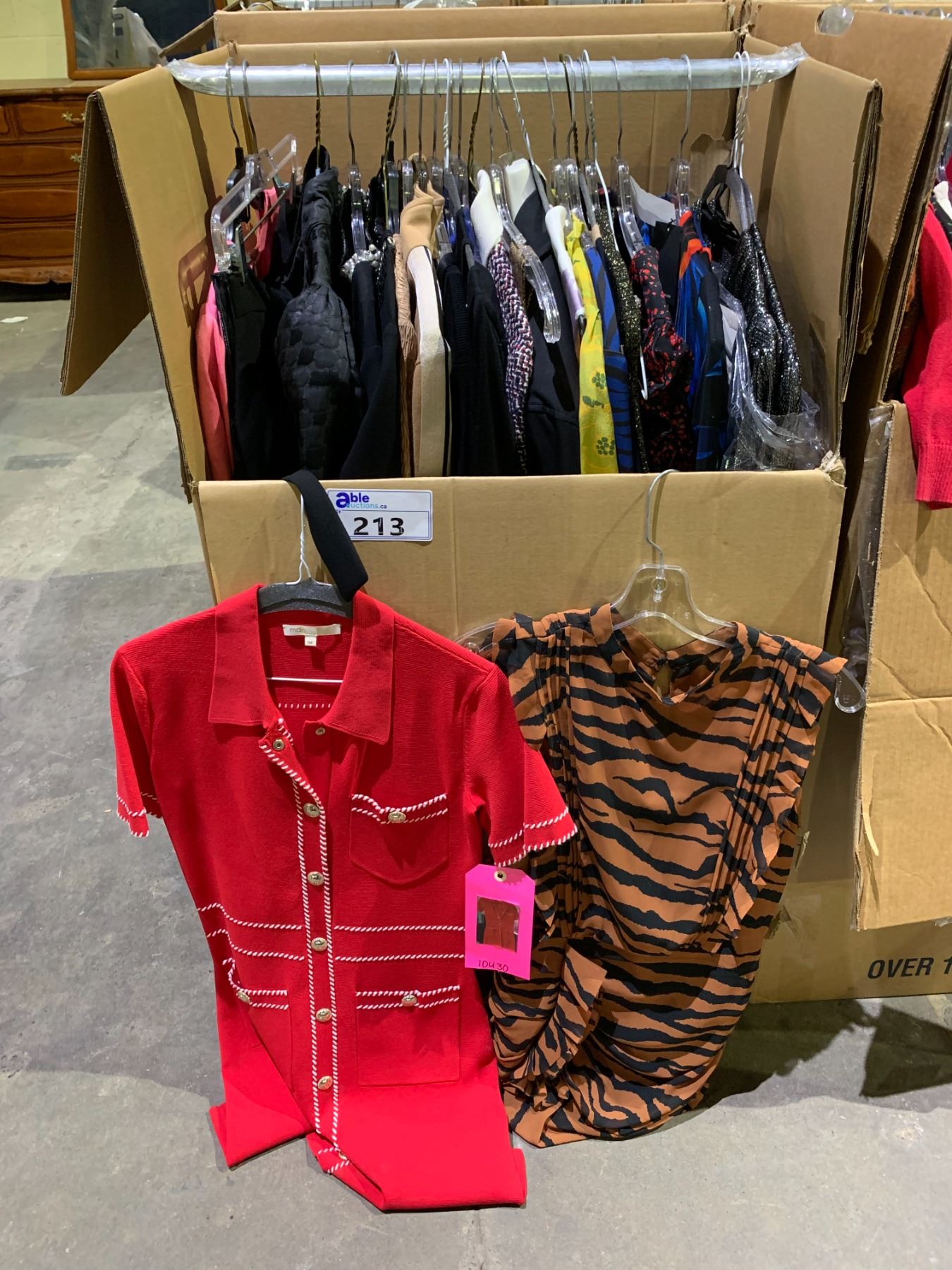 WARDROBE BOX OF ASSORTED CLOTHING INCLUDING; DRESSES, SHIRTS & PANTS