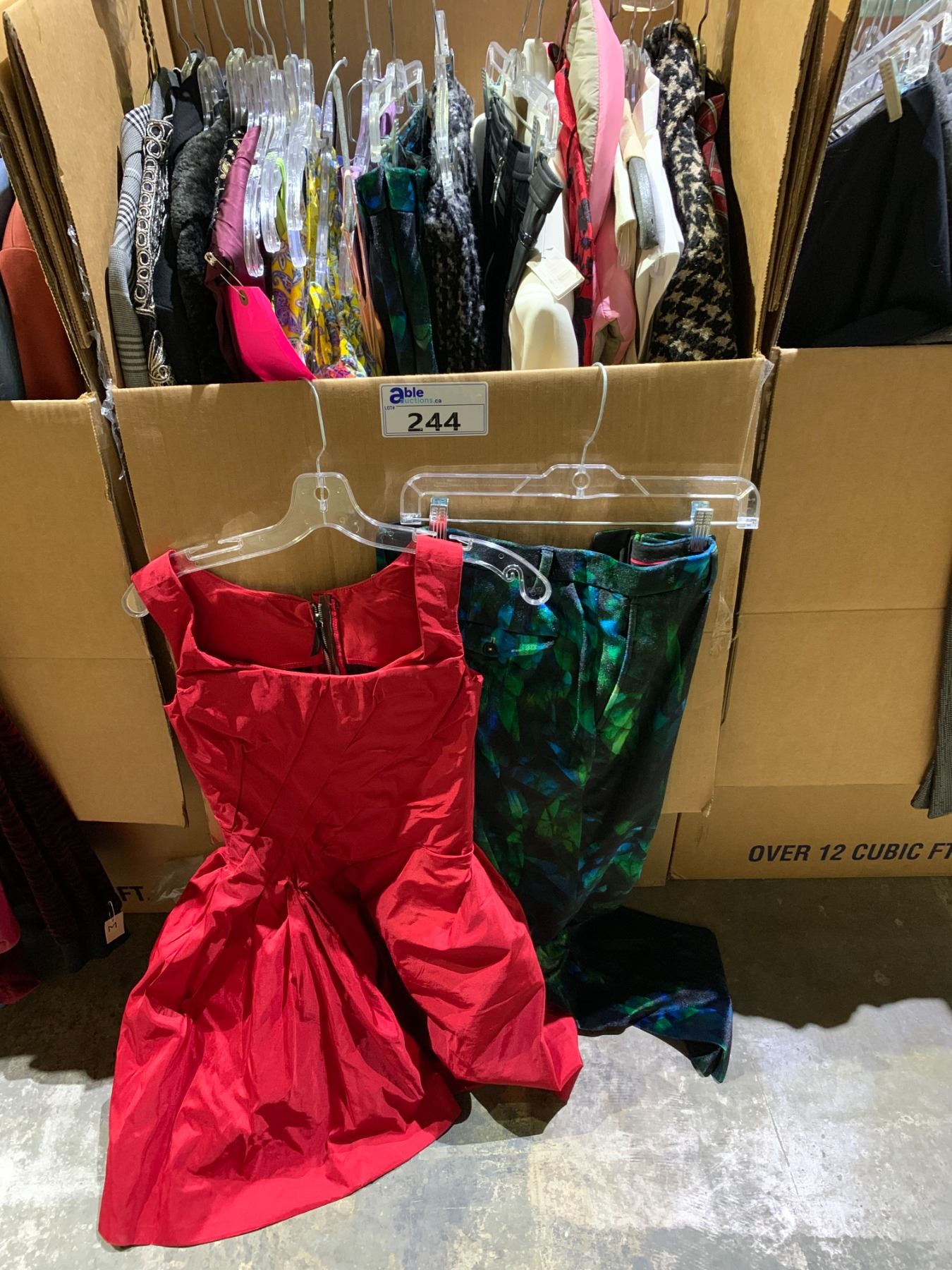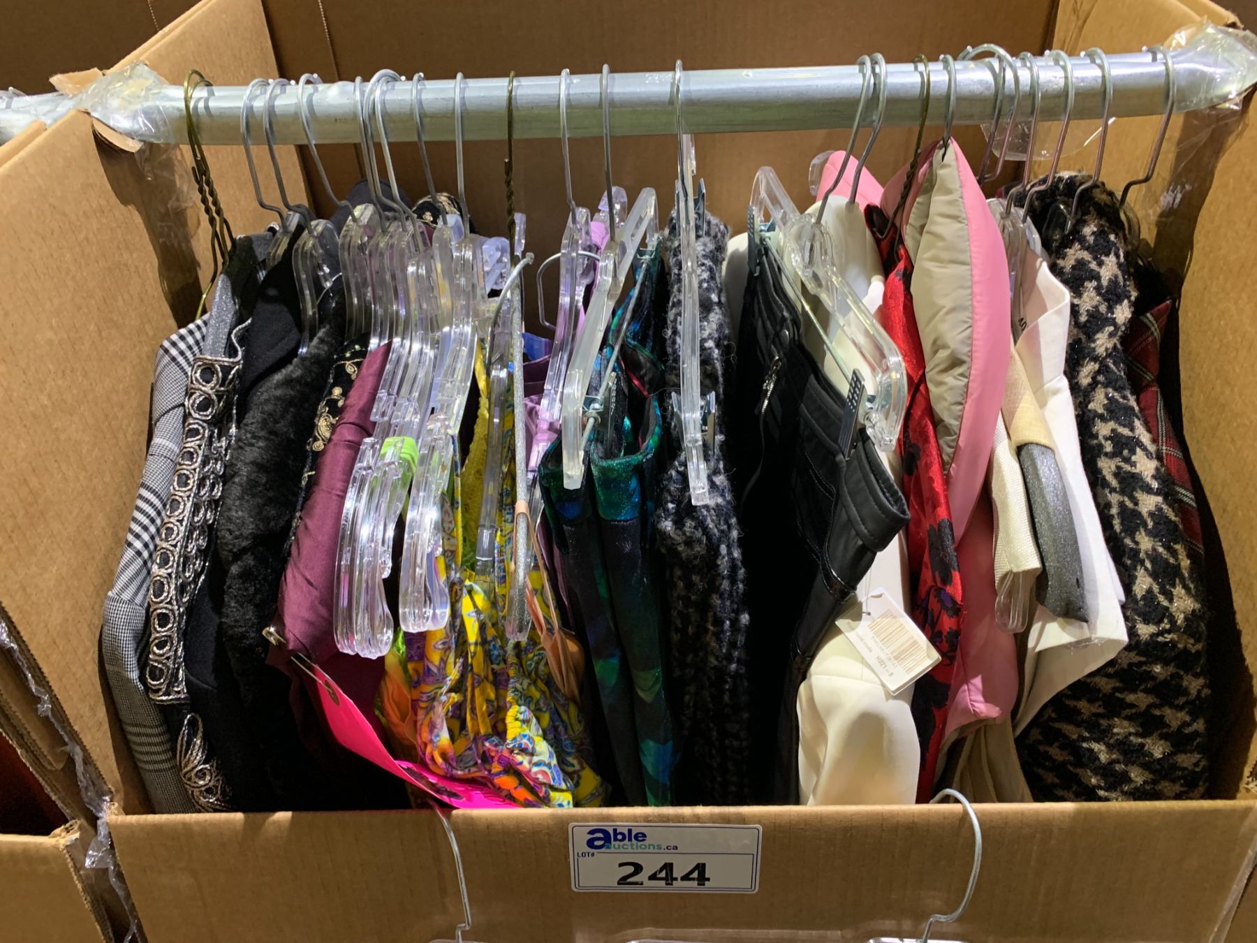 WARDROBE BOX OF ASSORTED CLOTHING INCLUDING; JACKETS, DRESSES, PANTS & MORE