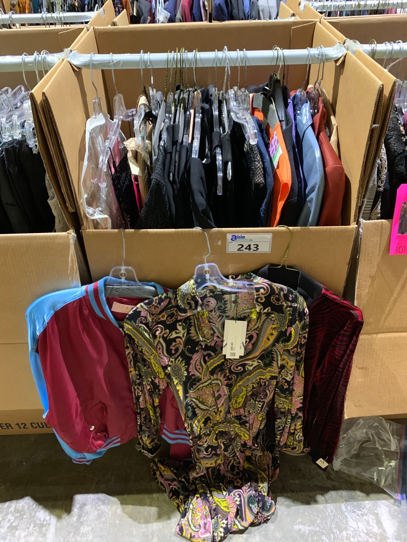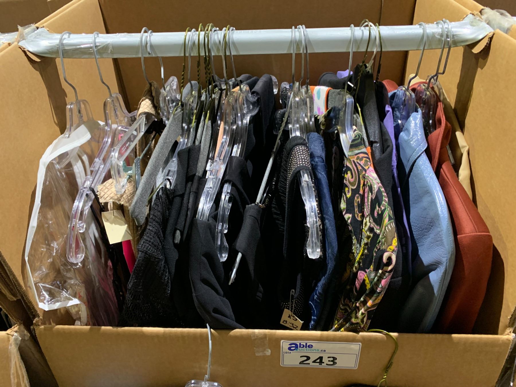 WARDROBE BOX OF ASSORTED CLOTHING INCLUDING; JACKETS, SHIRTS, DRESSES & MORE