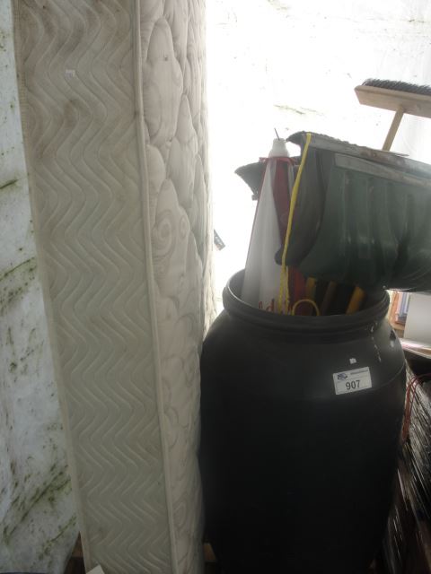 WATER BARREL, SHOVELS, BROOMS, MATTRESS, ETC