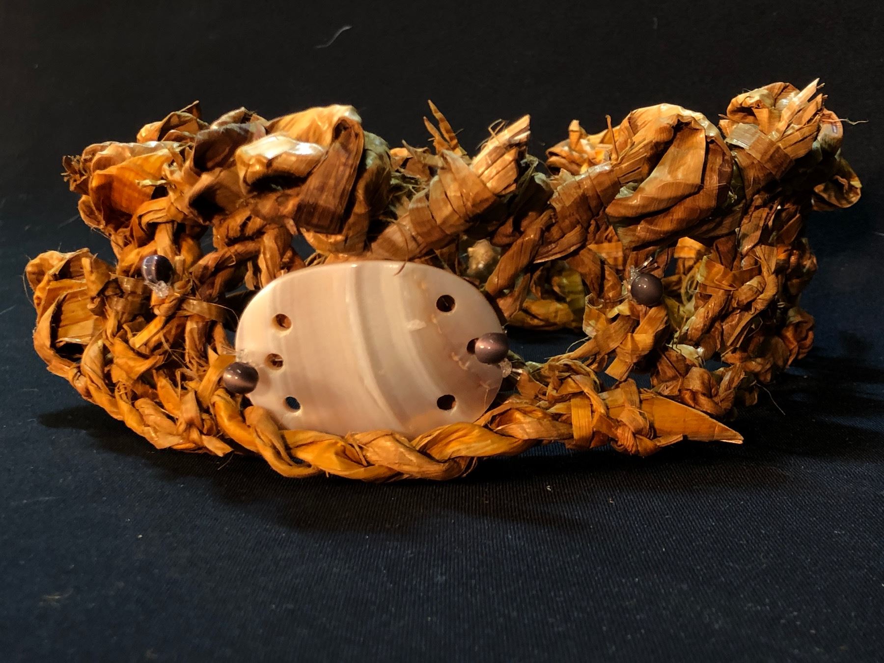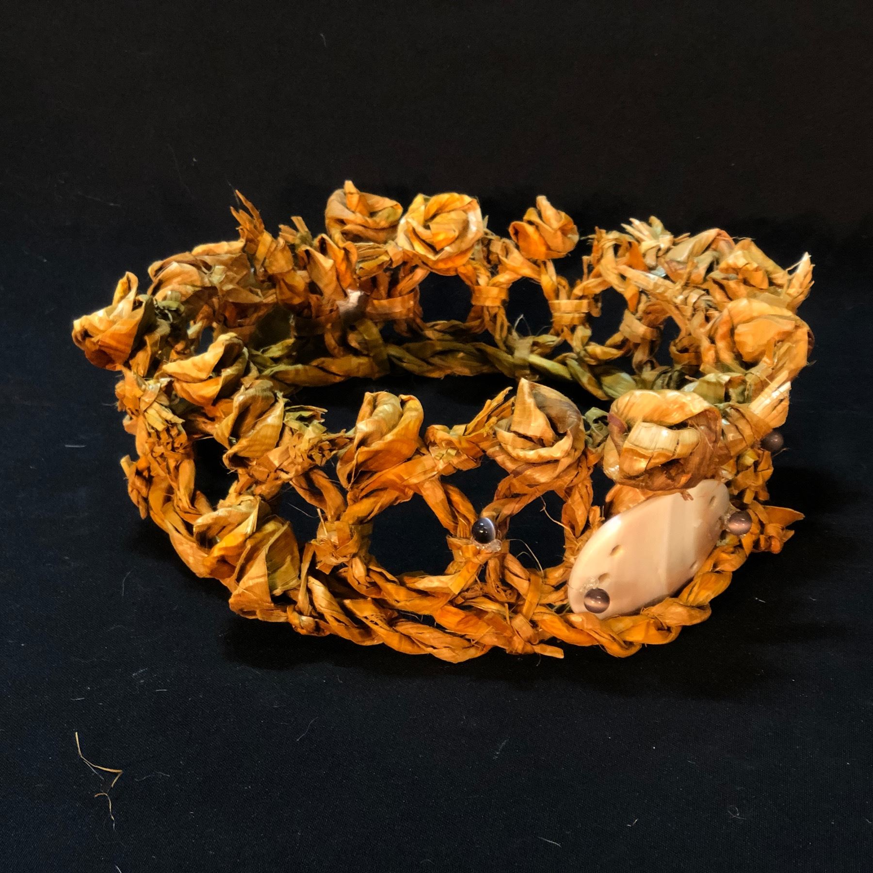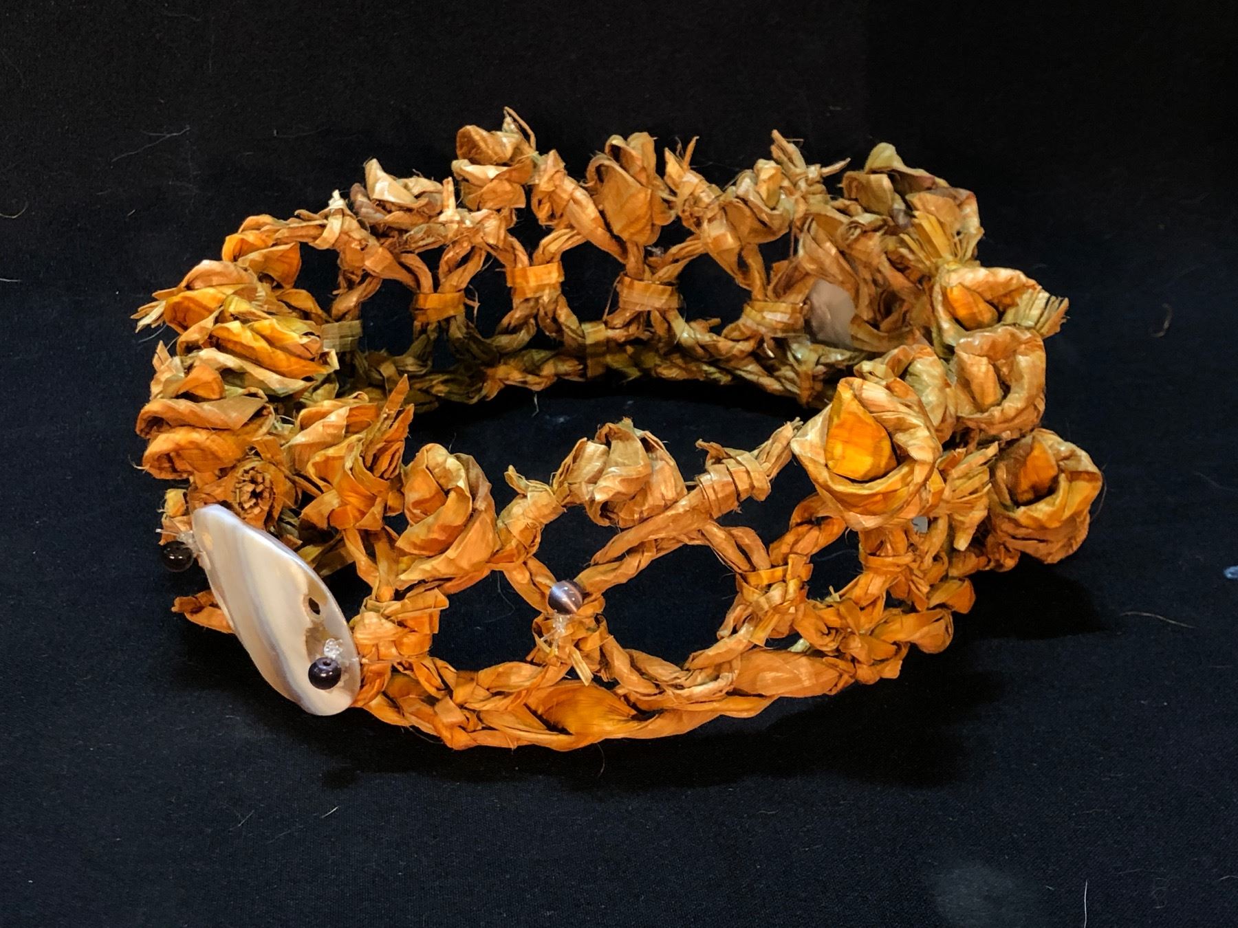 WAYNE BELL, HAND WOVEN FIRST NATIONS WREATH WITH ABALONE SHELL ACCENT, APPROX. 7'' TALL X 13'' WIDE