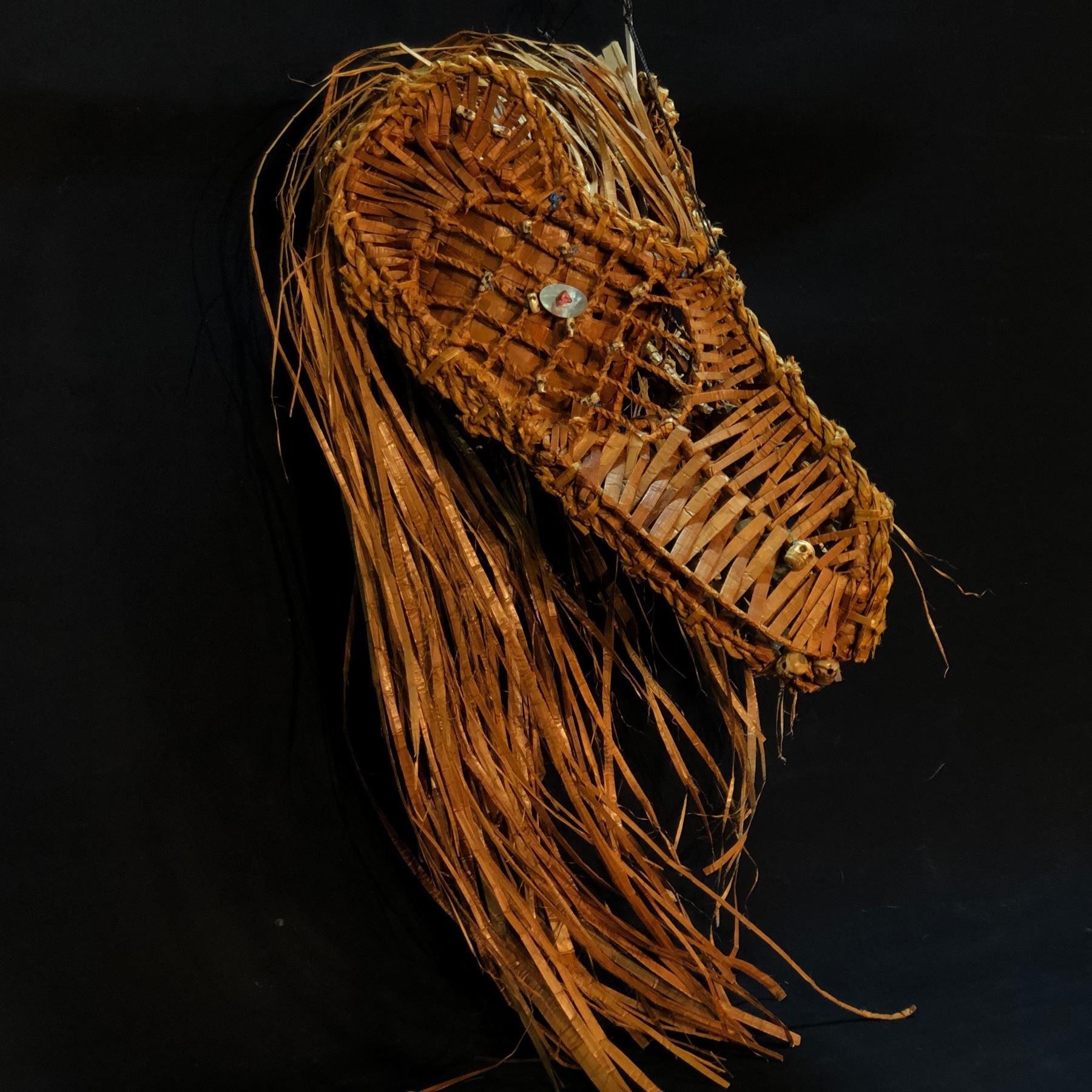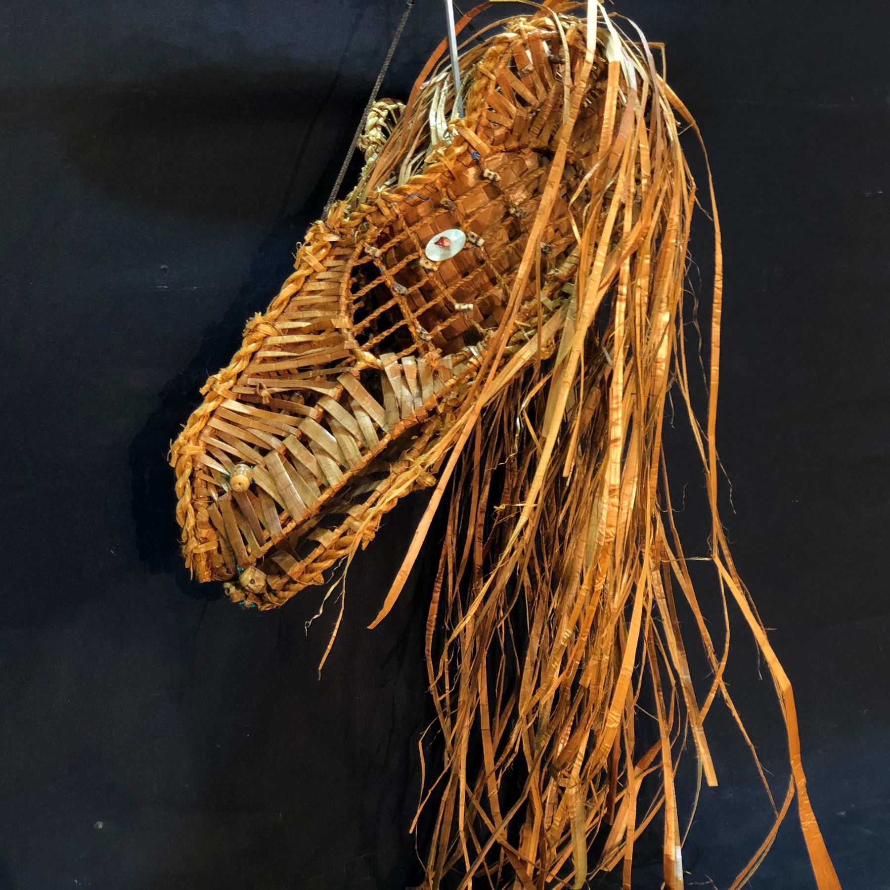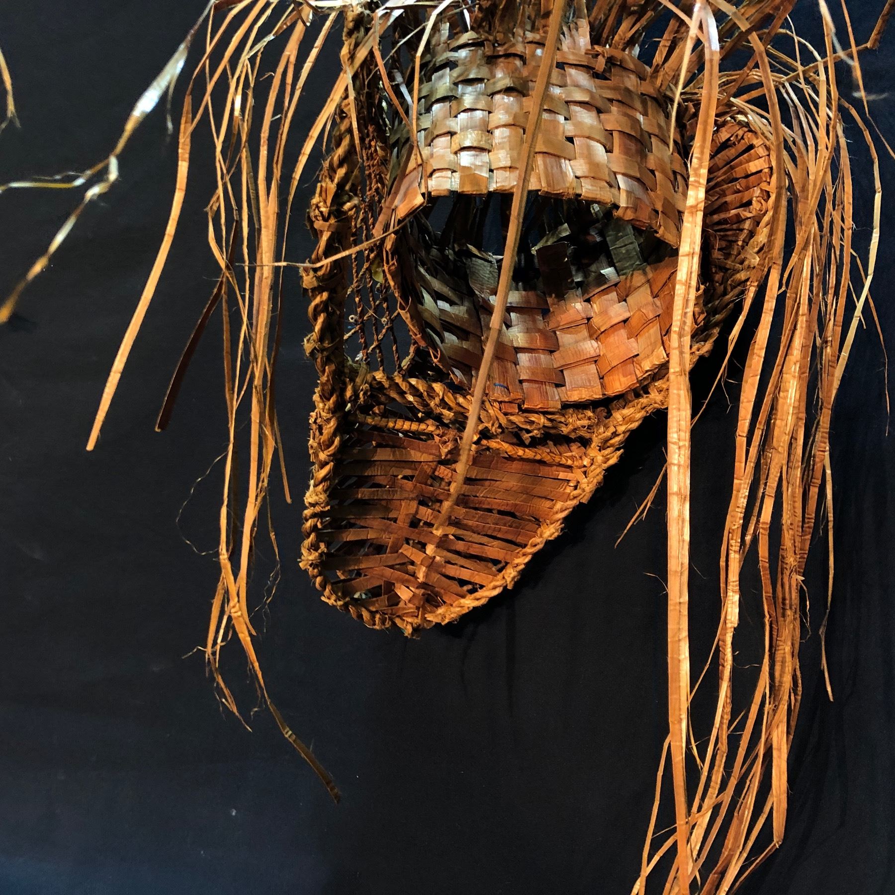 WAYNE BELL, LARGE ELABORATE SHAVED CEDAR BARK WEARABLE EAGLE HEAD DRESS, WITH ABALONE AND POLISHED STONE ACCENTS, APPROX. 24'' LONG