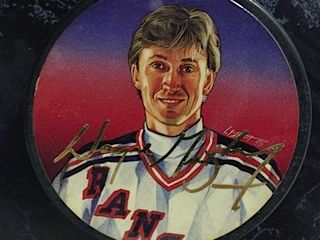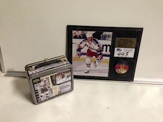 WAYNE GRETZKY PLAQUE AND WAYNE GRETZKY L.A. KINGS LUNCHBOX. PLAQUE INCLUDES: GRETZKY NEW YORK RANGERS PHOTOGRAPH AND WAYNE GRETZKY AUTOGRAPHED PUCK