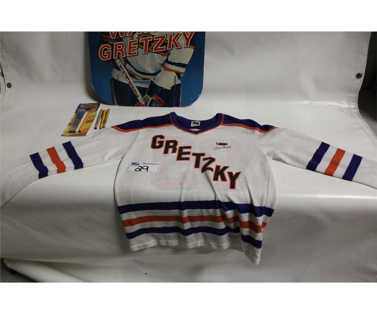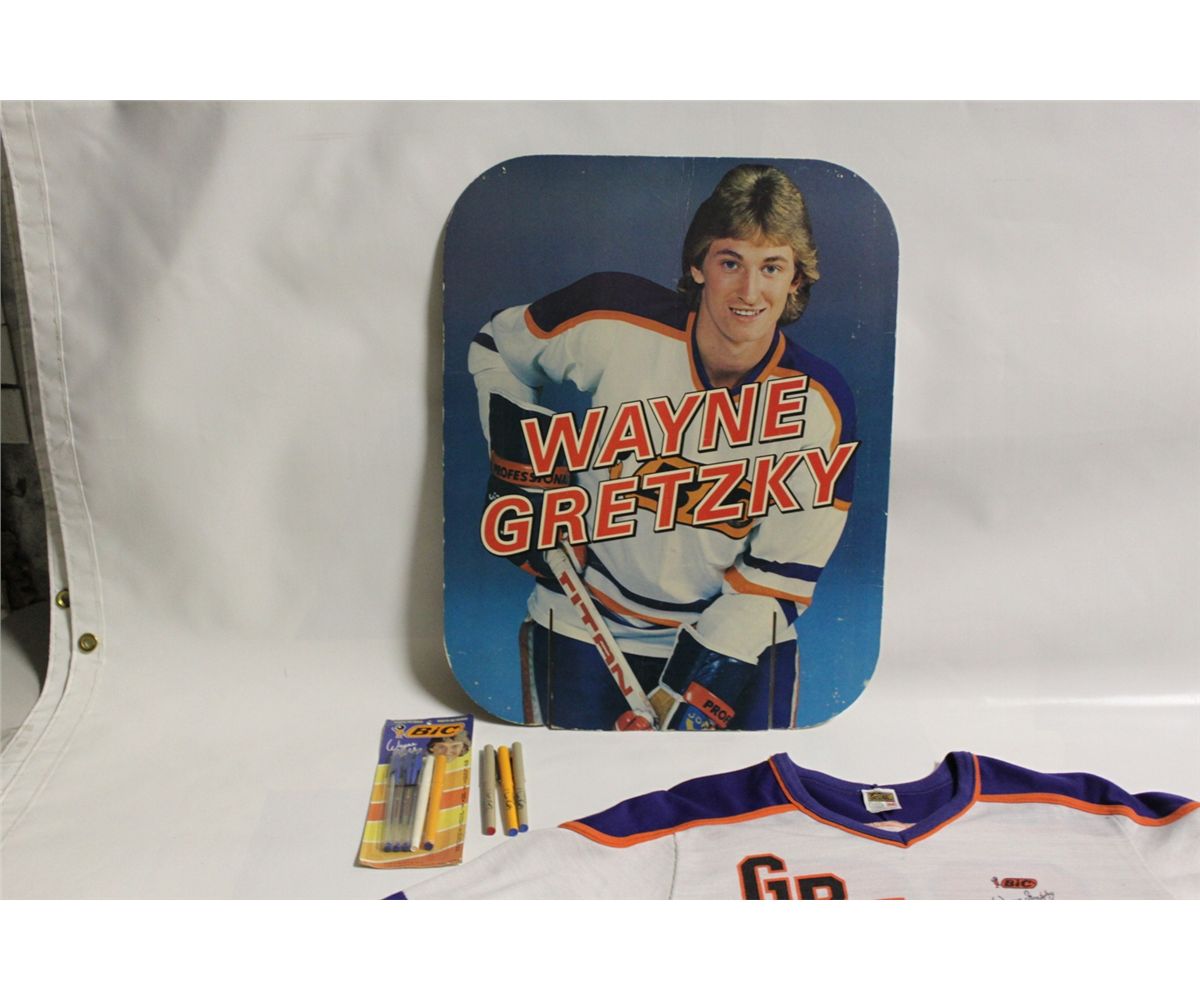 WAYNE GREZKY BIC PROMOTIONAL ITEMS INCLUDING ROUNDED STAND-UP POSTER, BIC SEALED PEN SET, UNSEALED PEN SET & REPLICA JERSEY