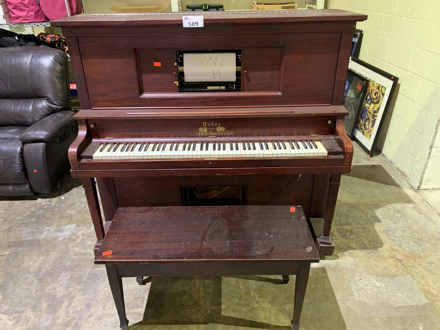 WEBER PLAYER PIANO WITH 4 ASSORTED SCROLLS & BENCH
