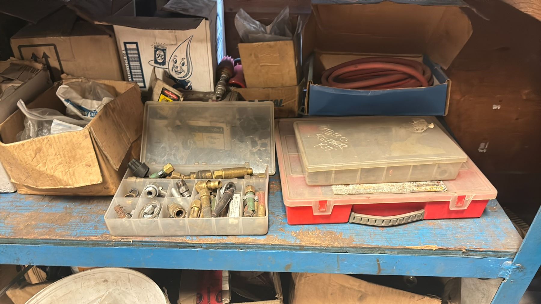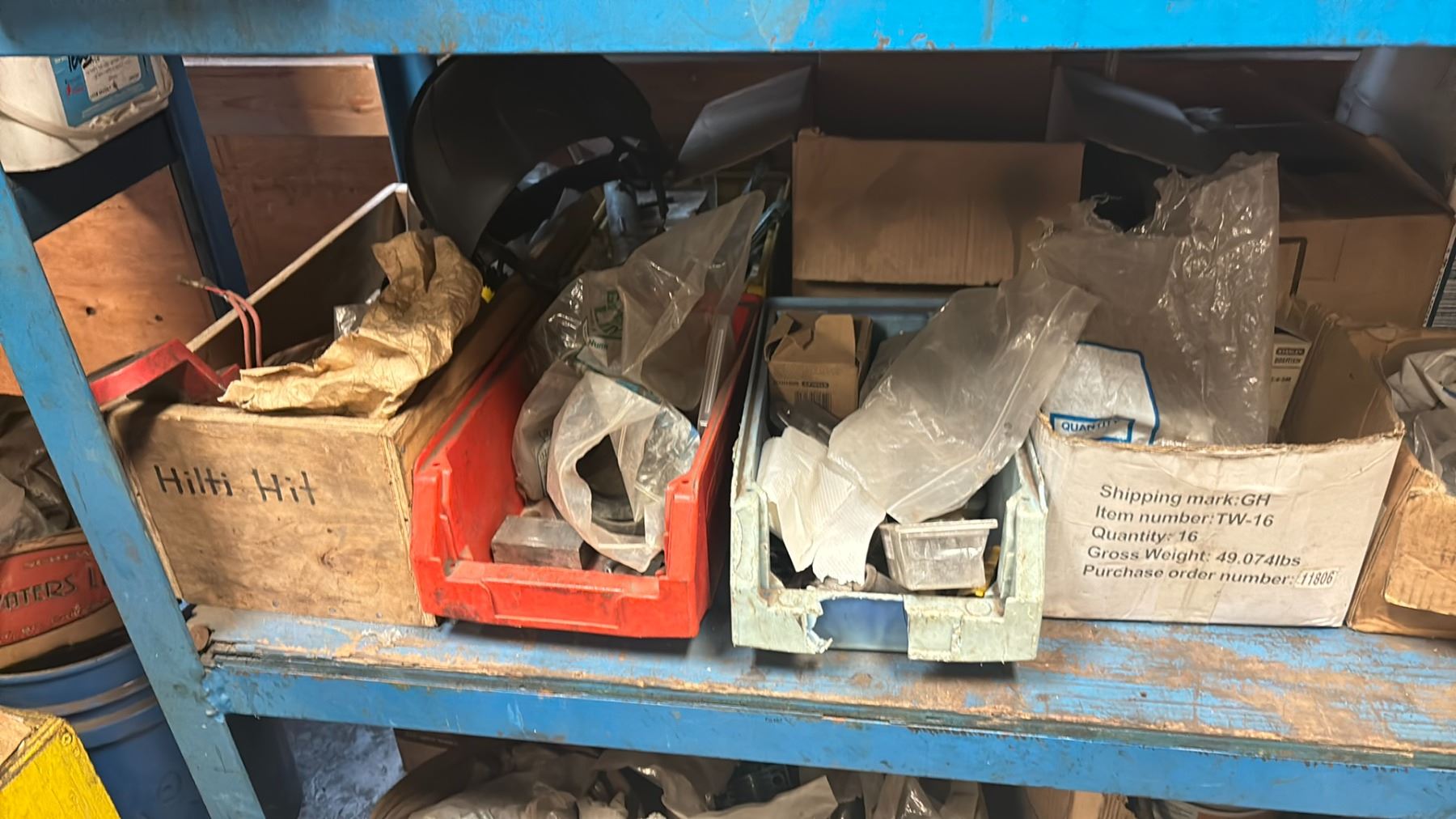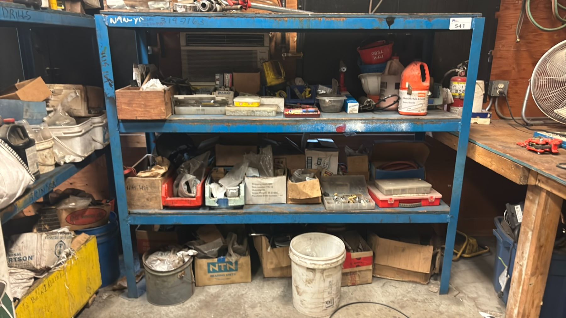 WELDED METAL SHELF UNIT AND ALL CONTENTS - 4 SHELVES OF MISCELLANEOUS SHOP ITEMS