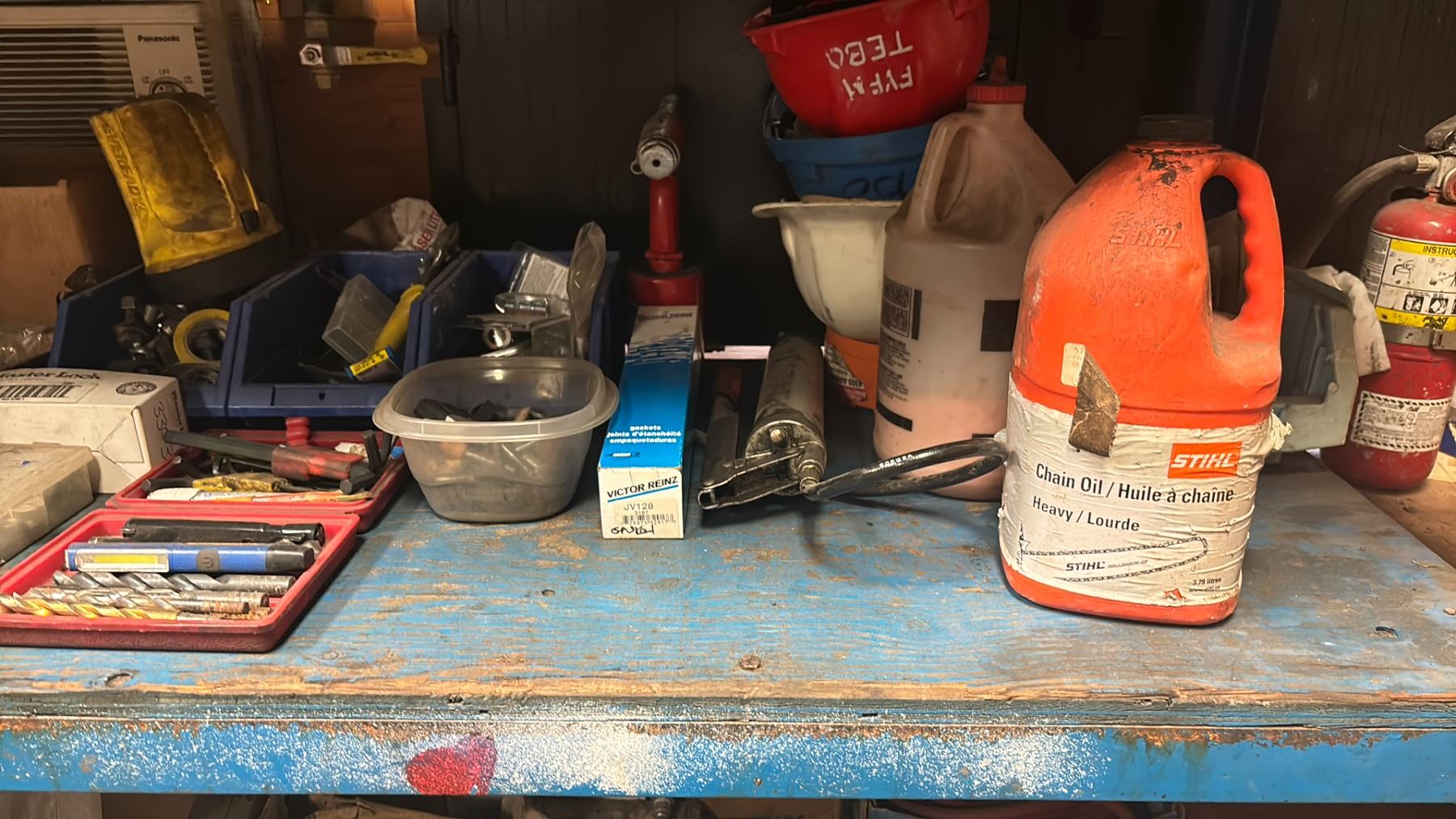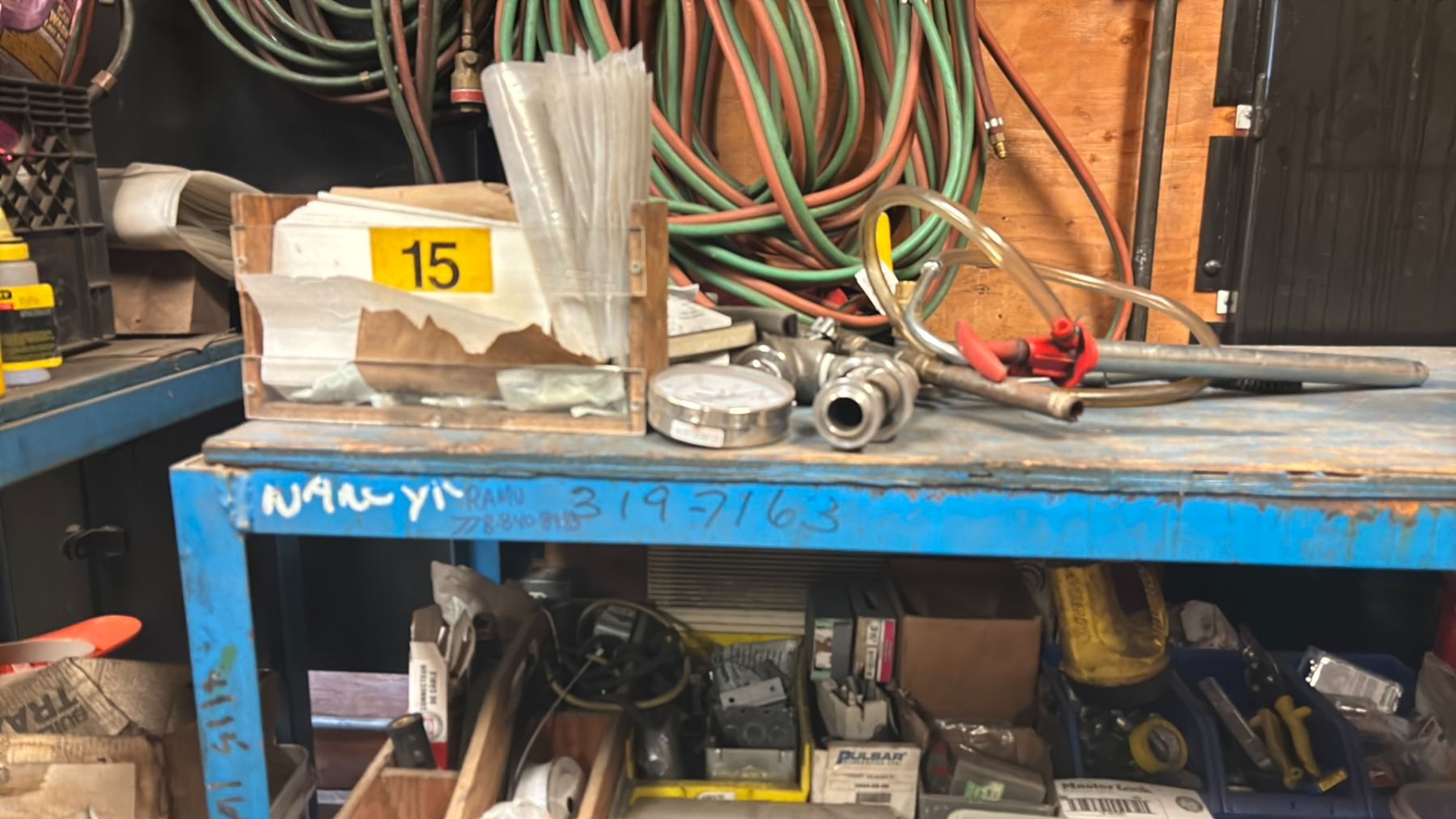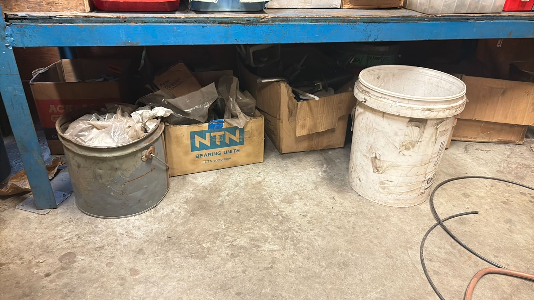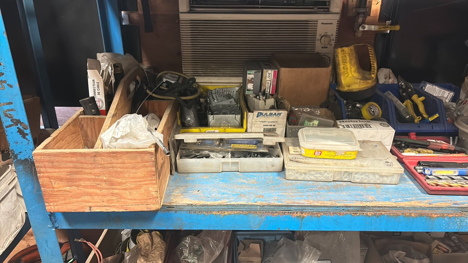 WELDED METAL SHELF UNIT AND ALL CONTENTS - 4 SHELVES OF MISCELLANEOUS SHOP ITEMS
