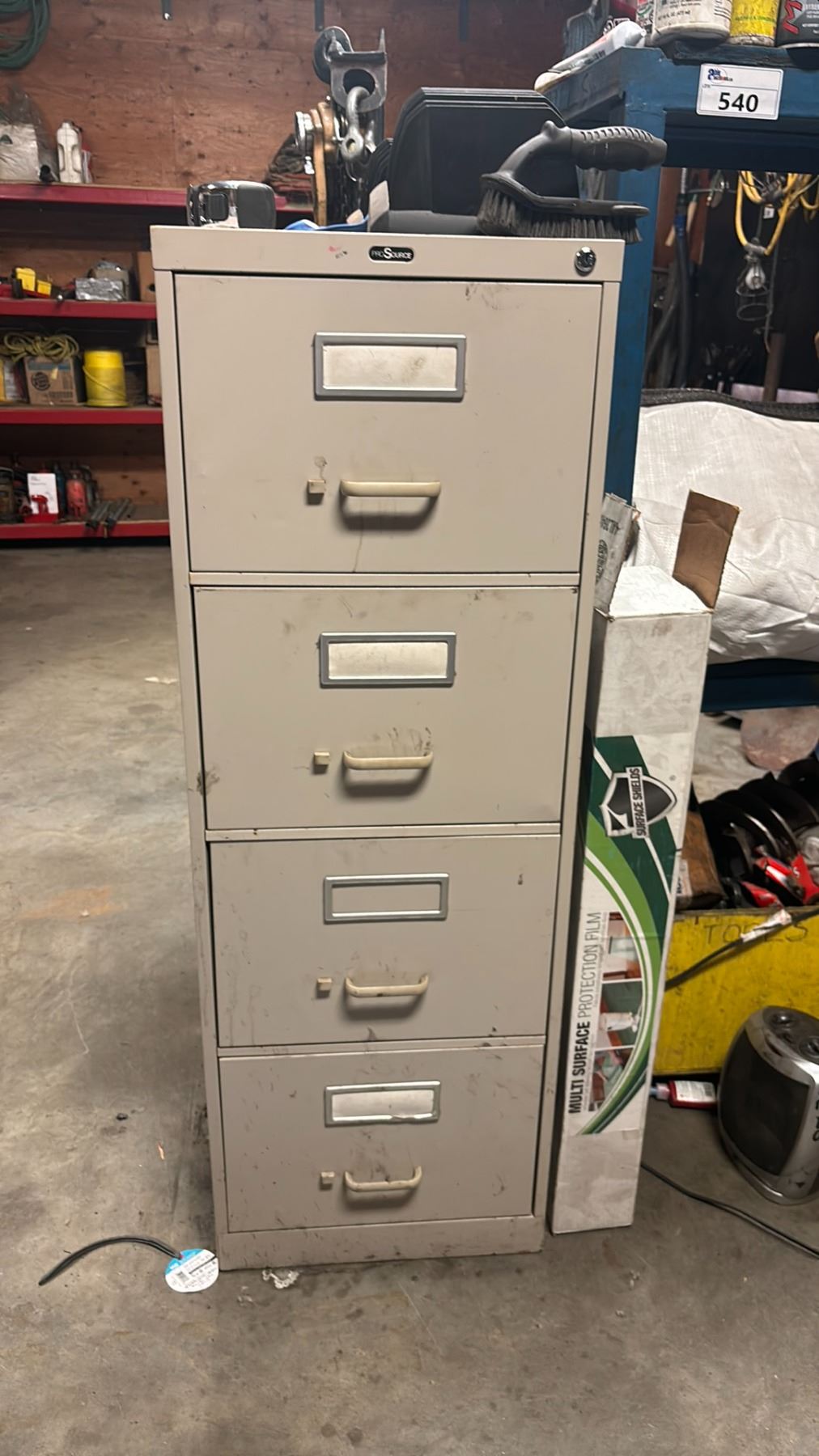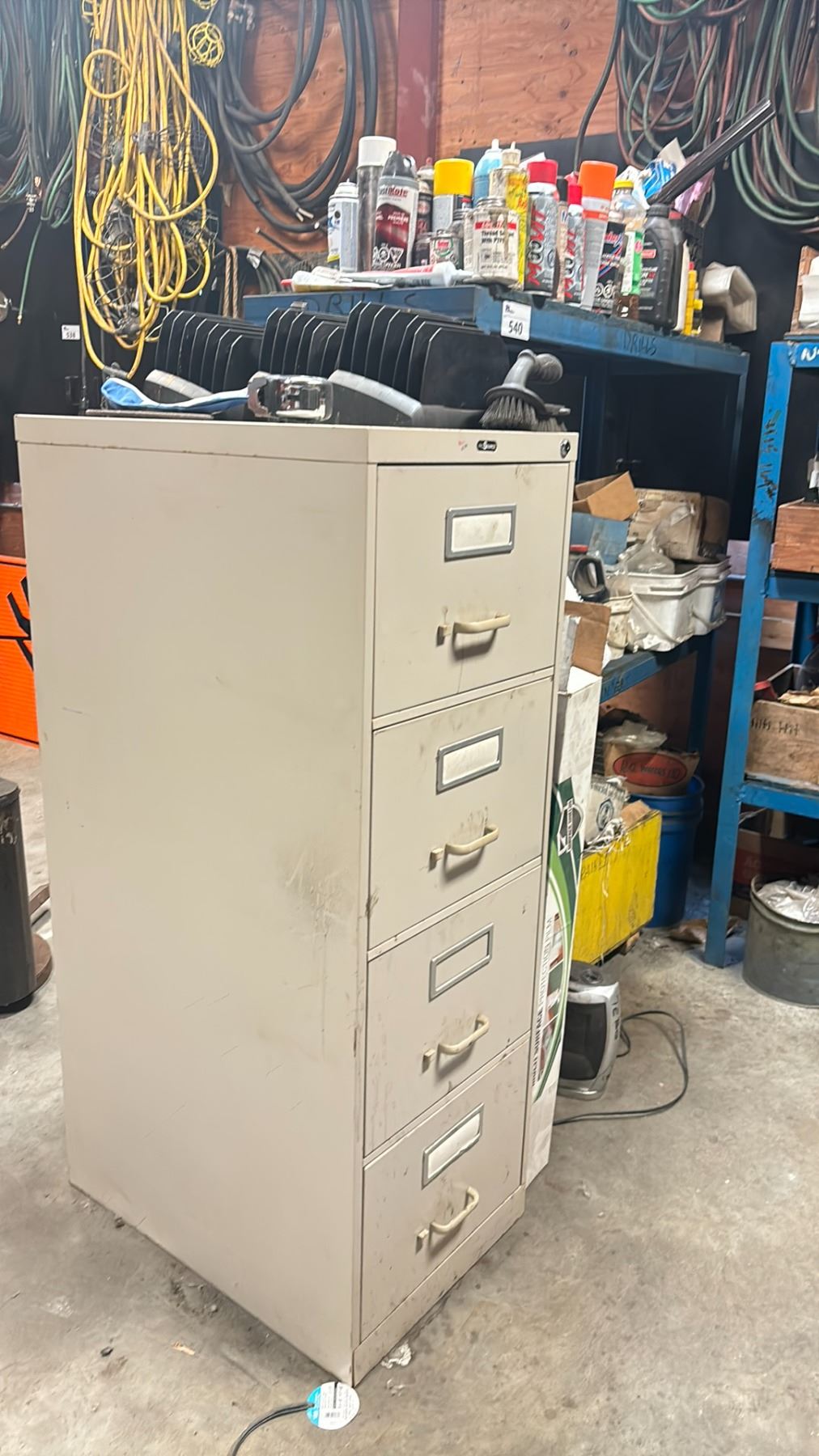 WELDED METAL SHELF UNIT AND ALL CONTENTS - INCLUDES 4 DRAWER FILING CABINET & 3 SHELVES OF MISCELLANEOUS SHOP ITEMS SHELF UNIT APPROX. 5'W X 1.5'D X 5'H