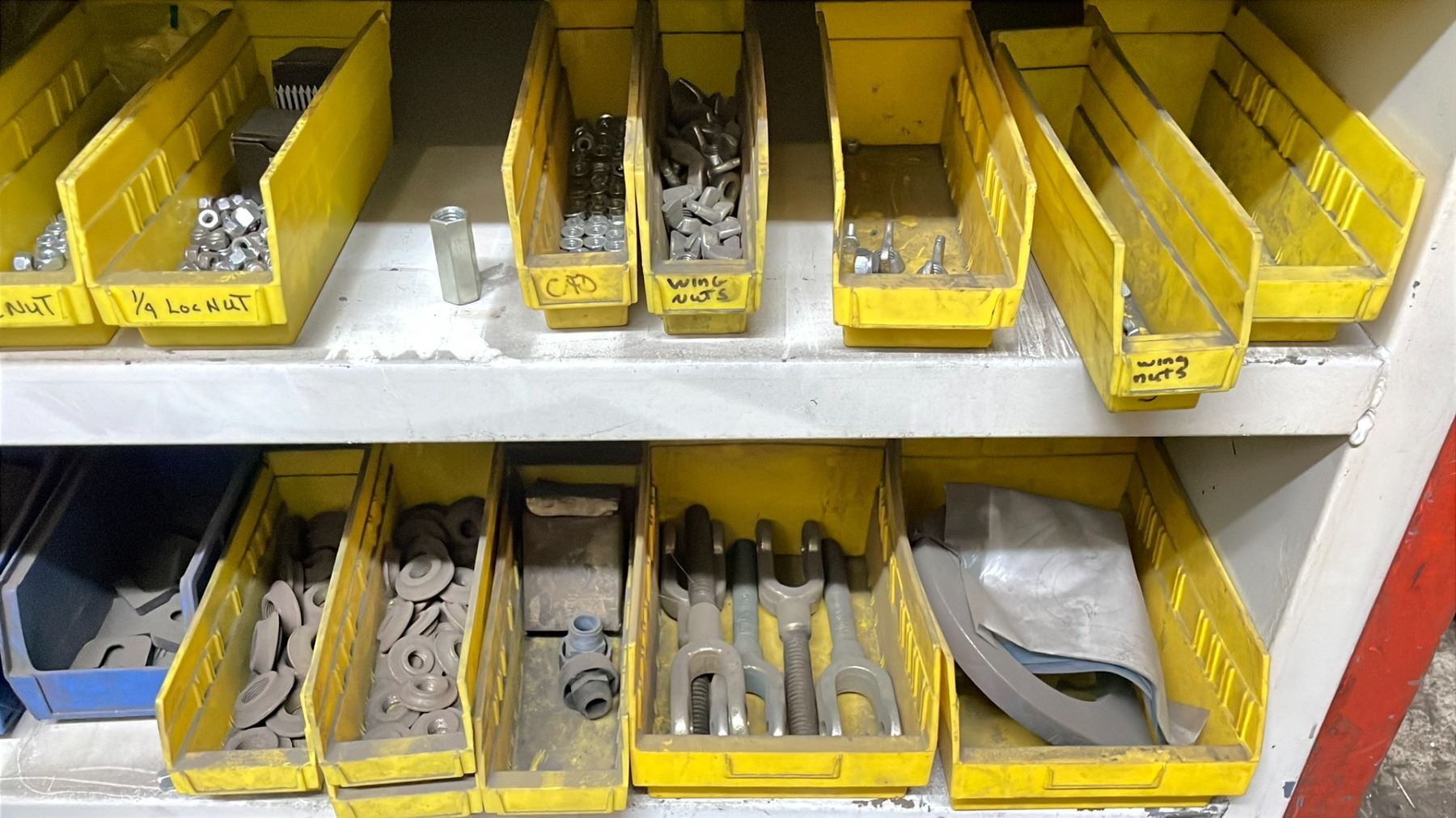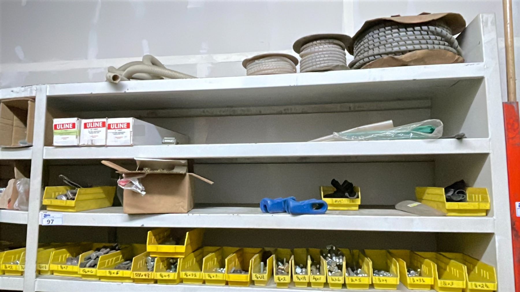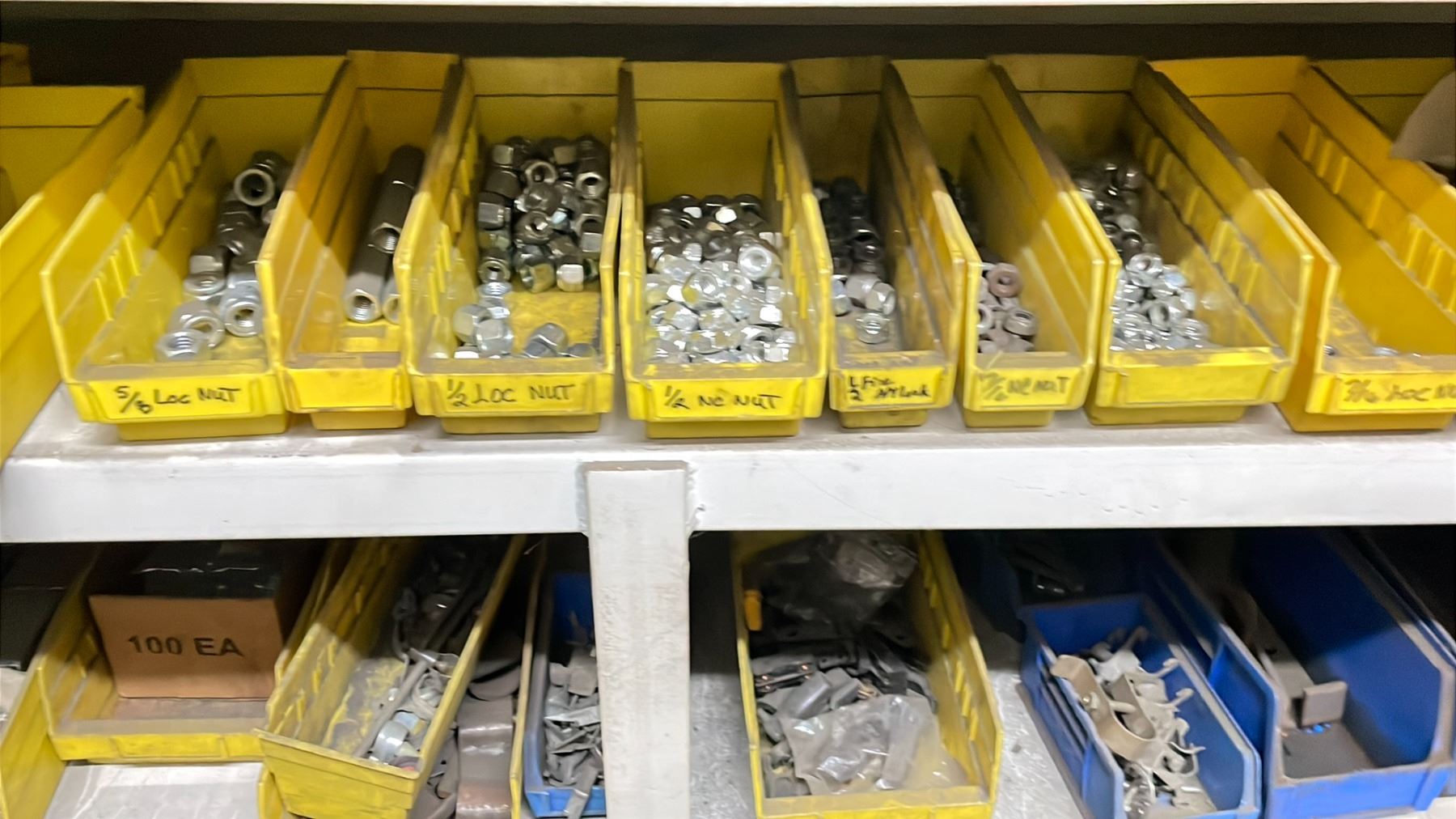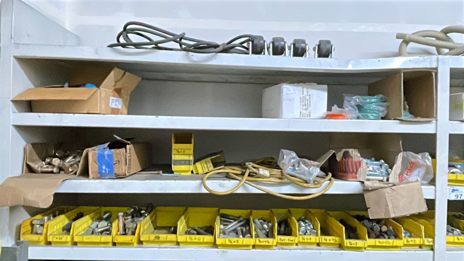 WELDED METAL SHELF UNIT W/CONTENTS - LARGE QUANTITY & ASSORTMENT OF FASTENERS, NUTS, BOLTS AND HARDWARE SHELF MEASURES APPROX.148" ACROSS X 24" WIDE X 84" HIGH