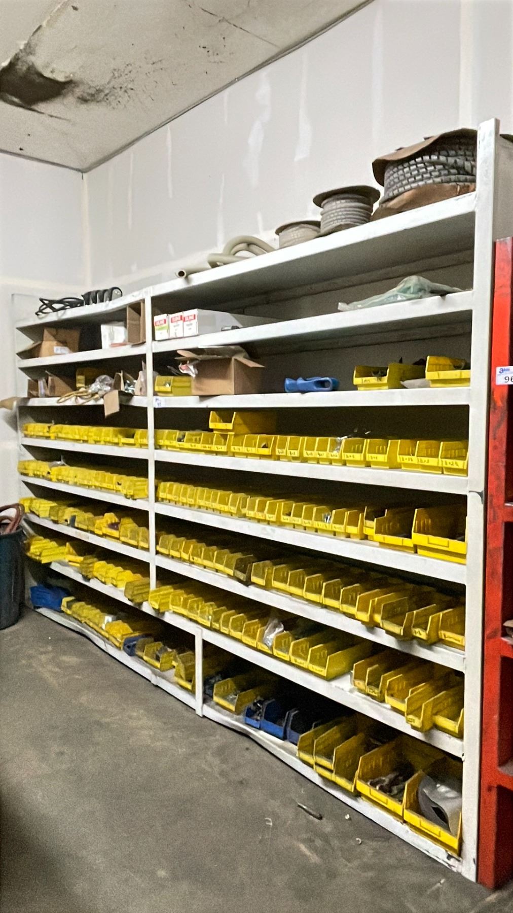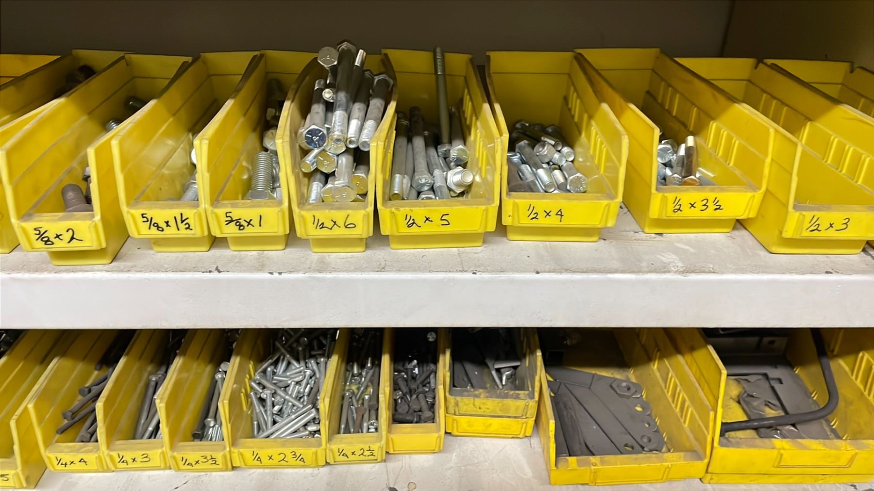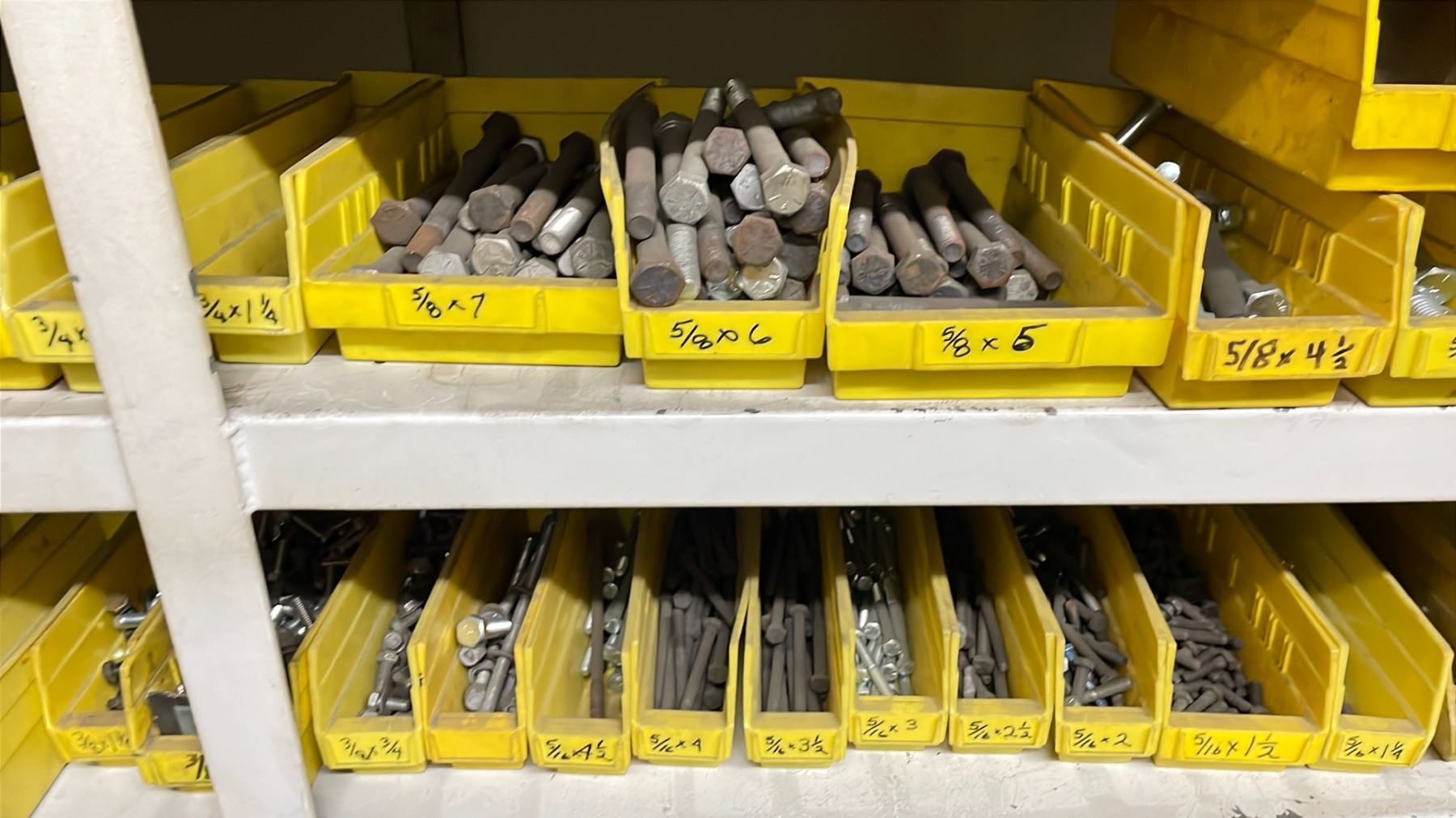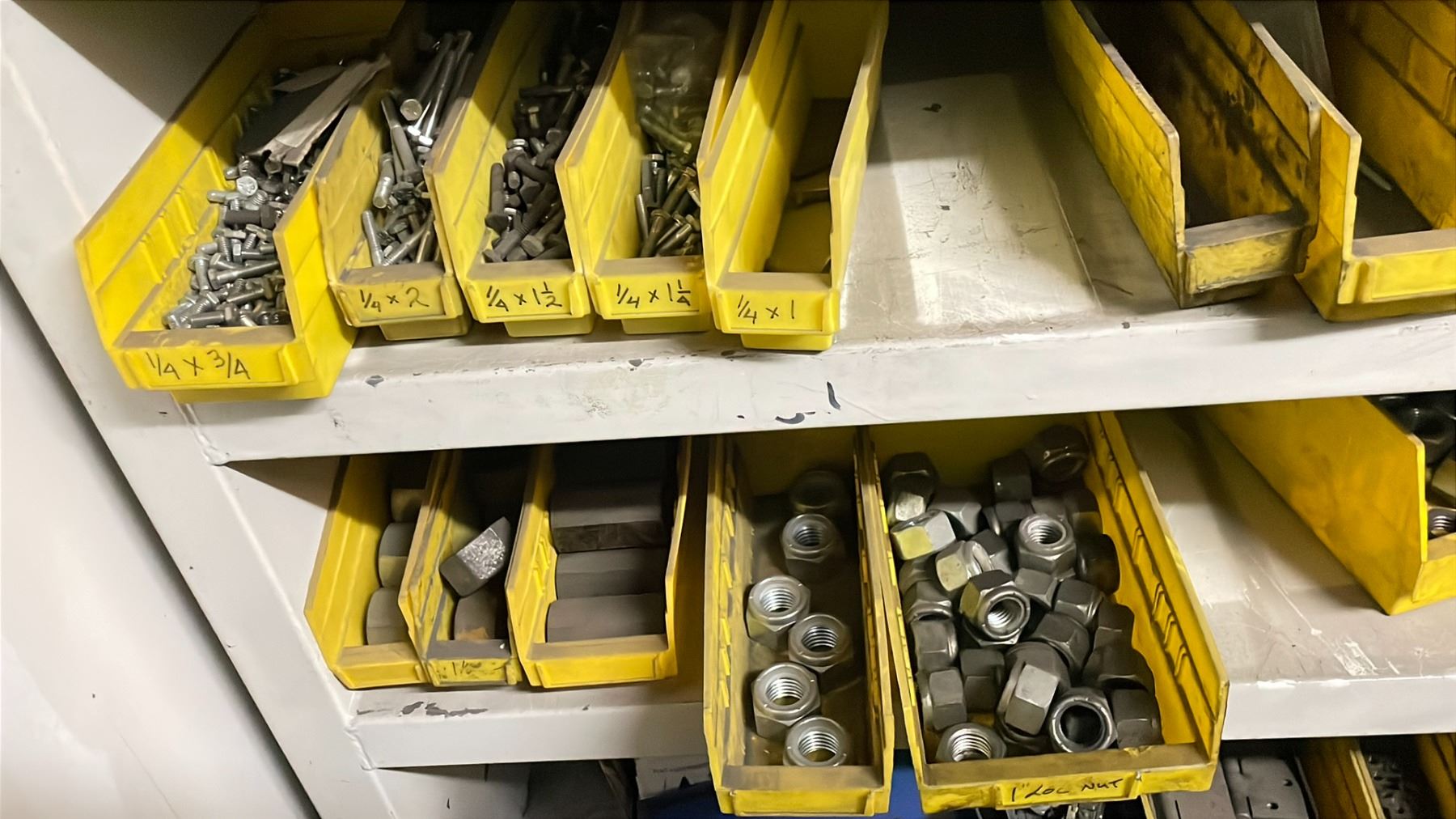 WELDED METAL SHELF UNIT W/CONTENTS - LARGE QUANTITY & ASSORTMENT OF FASTENERS, NUTS, BOLTS AND HARDWARE SHELF MEASURES APPROX.148" ACROSS X 24" WIDE X 84" HIGH