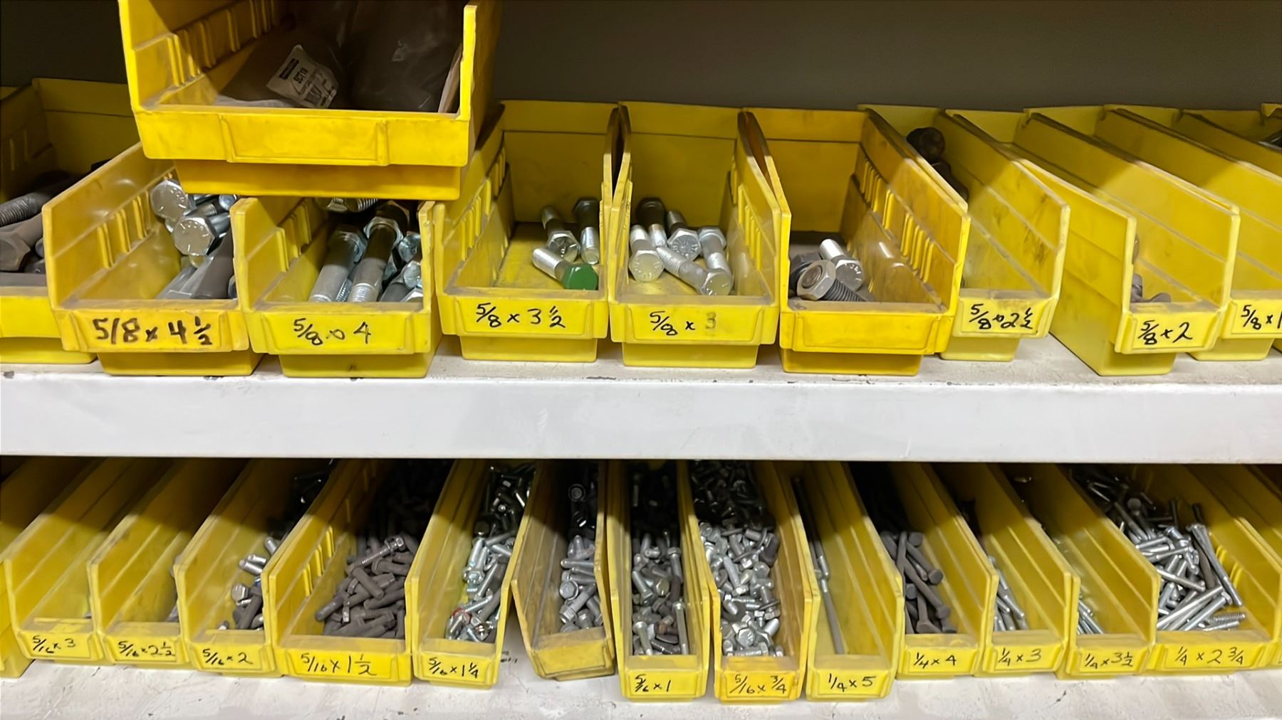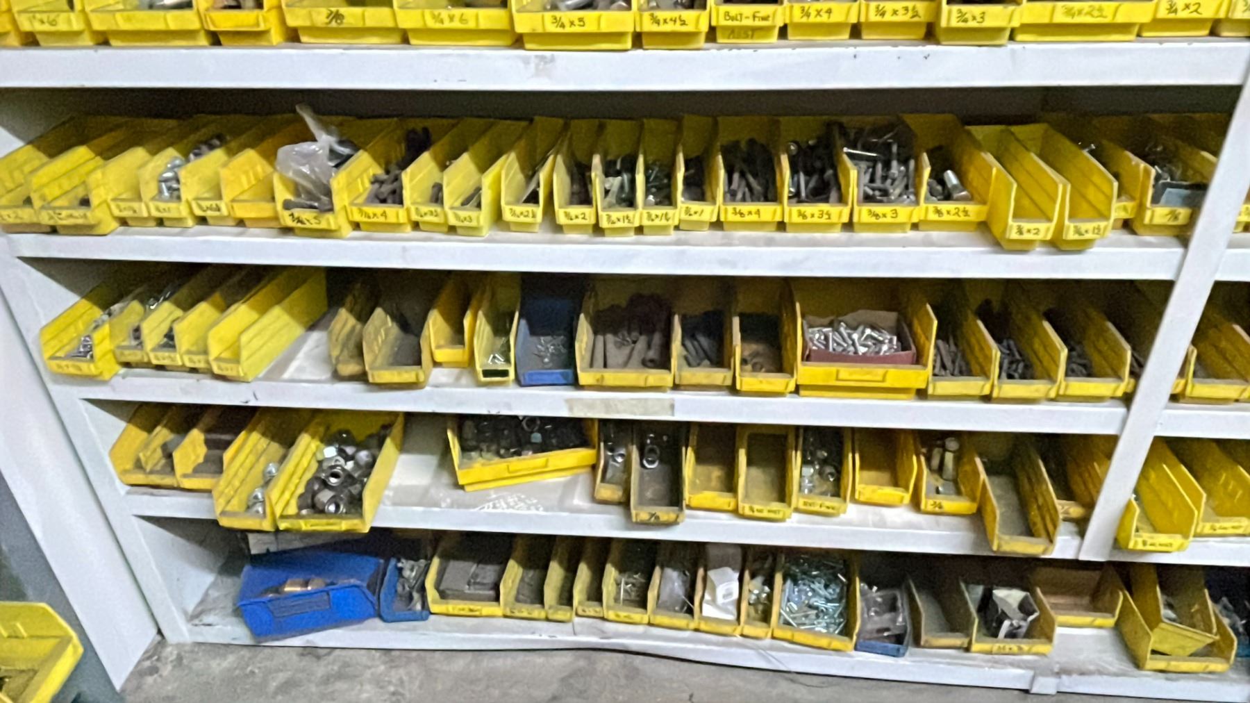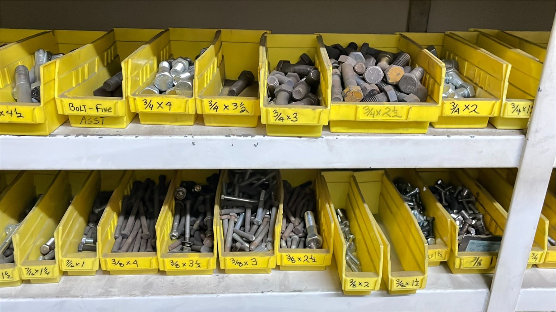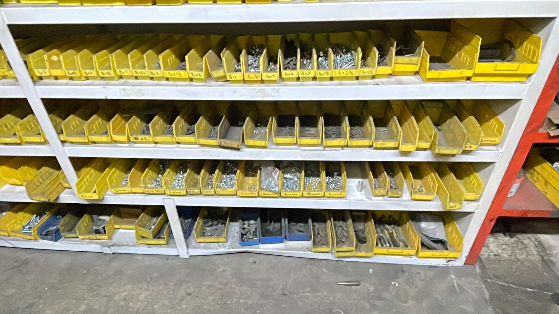 WELDED METAL SHELF UNIT W/CONTENTS - LARGE QUANTITY & ASSORTMENT OF FASTENERS, NUTS, BOLTS AND HARDWARE SHELF MEASURES APPROX.148" ACROSS X 24" WIDE X 84" HIGH