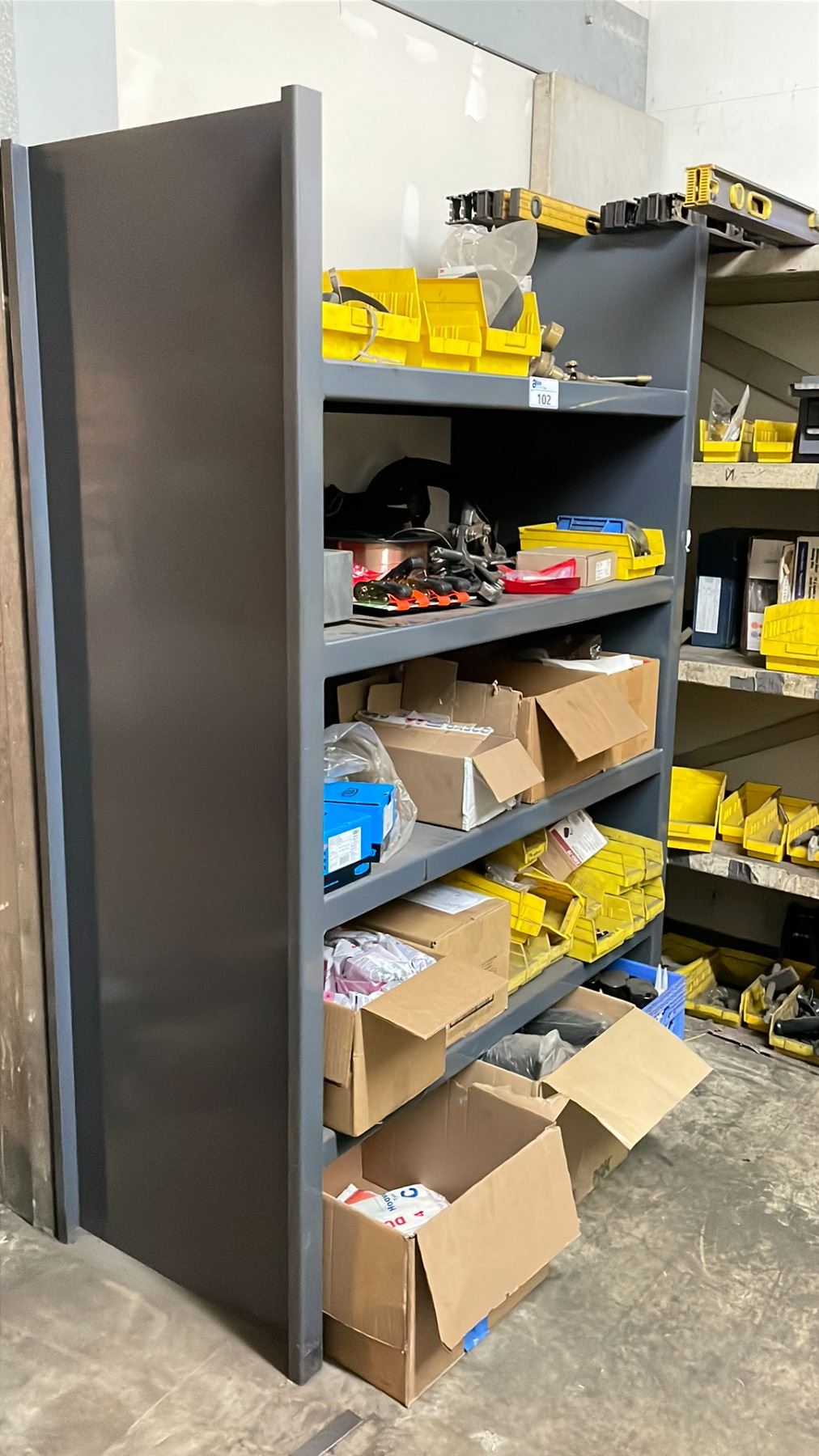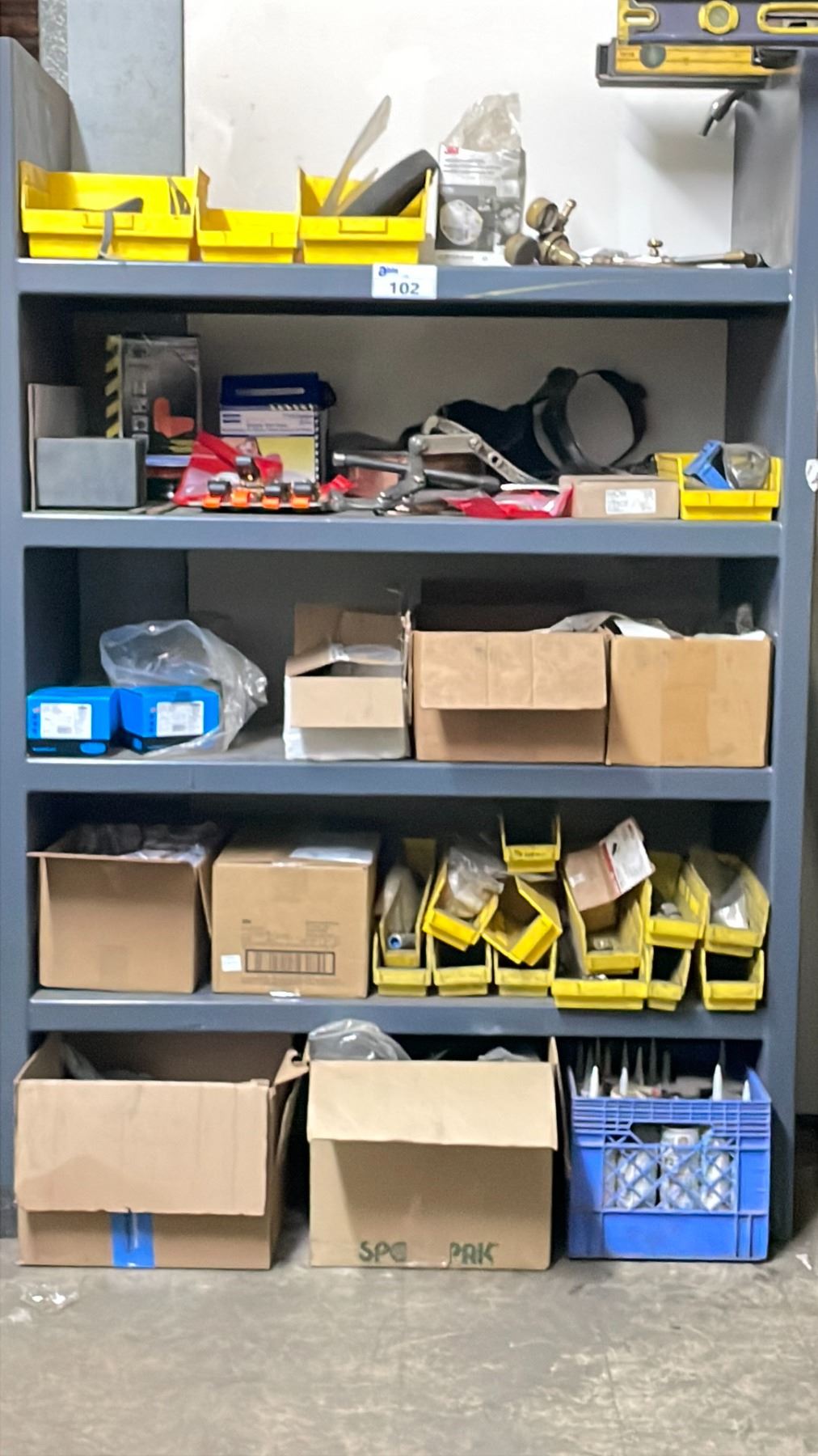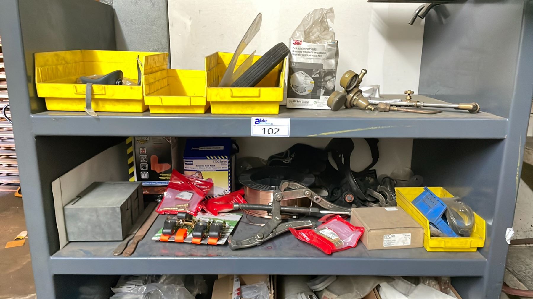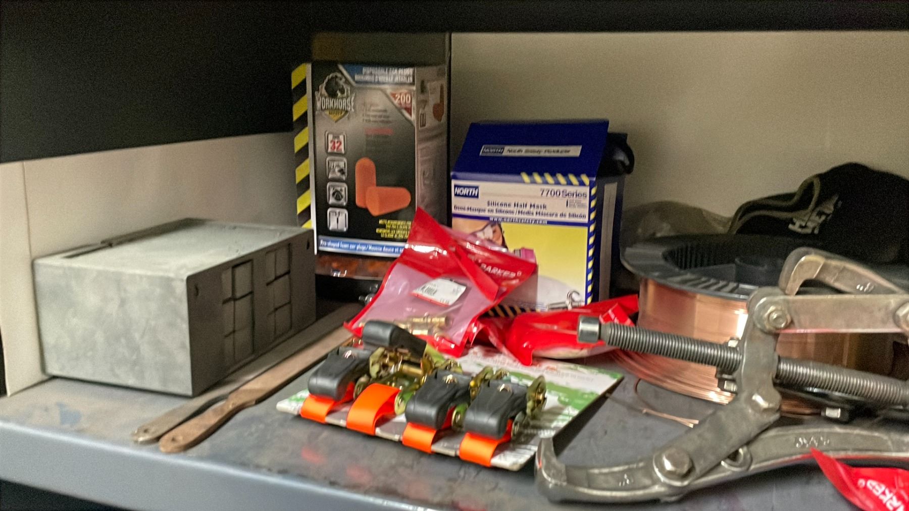 WELDED METAL SHELF UNIT W/CONTENTS - LARGE QUANTITY & ASSORTMENT OF TOOLS, HARDWARE, SAFETY GEAR AND SHOP SUPPLIES SHELF MEASURES APPROX. 53" ACROSS X 24" WIDE X 77" HIGH