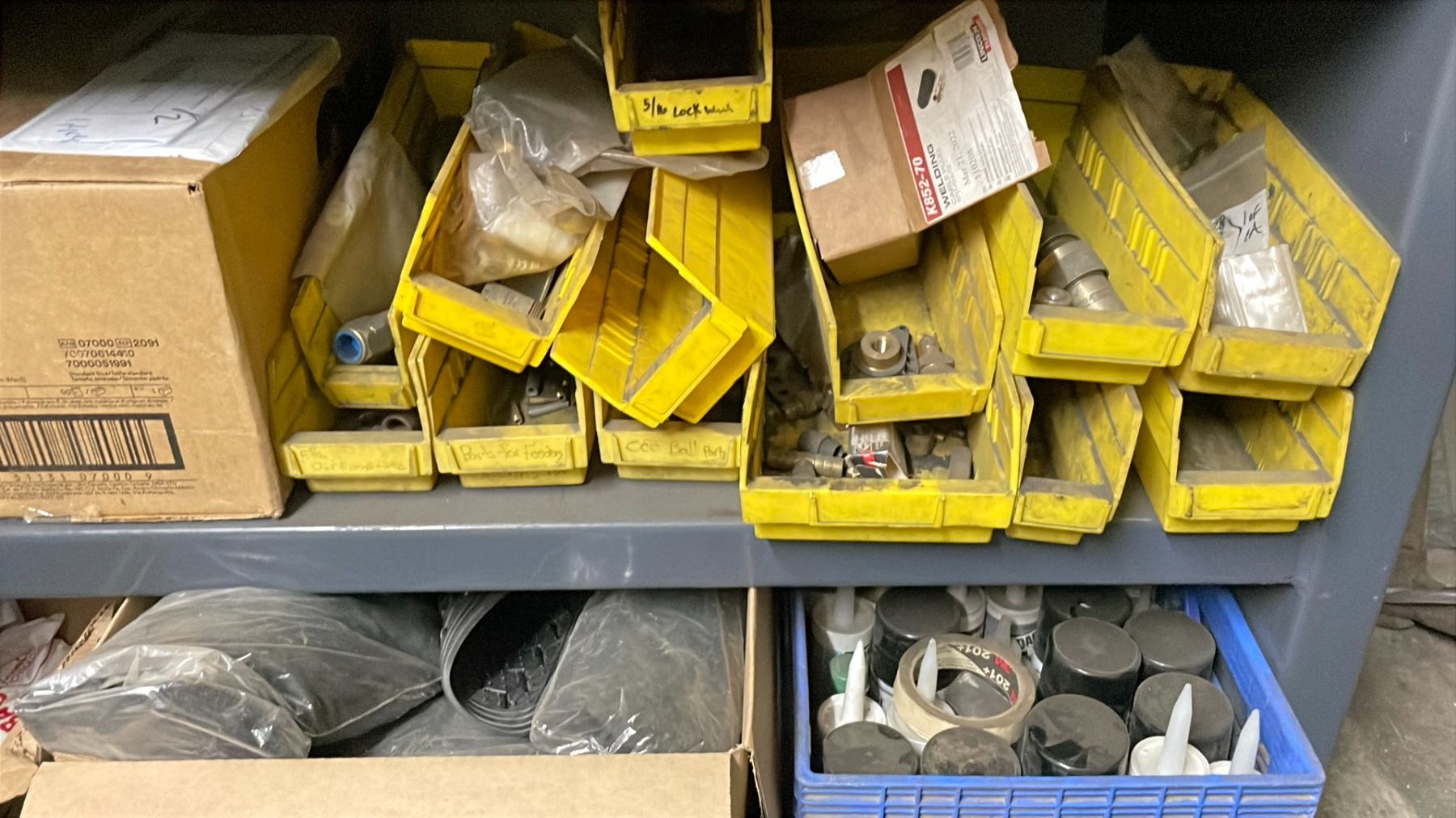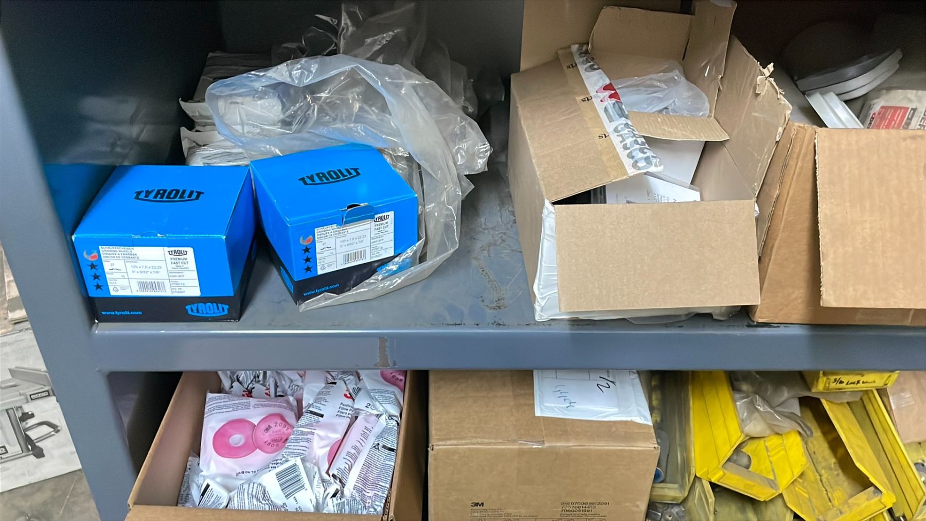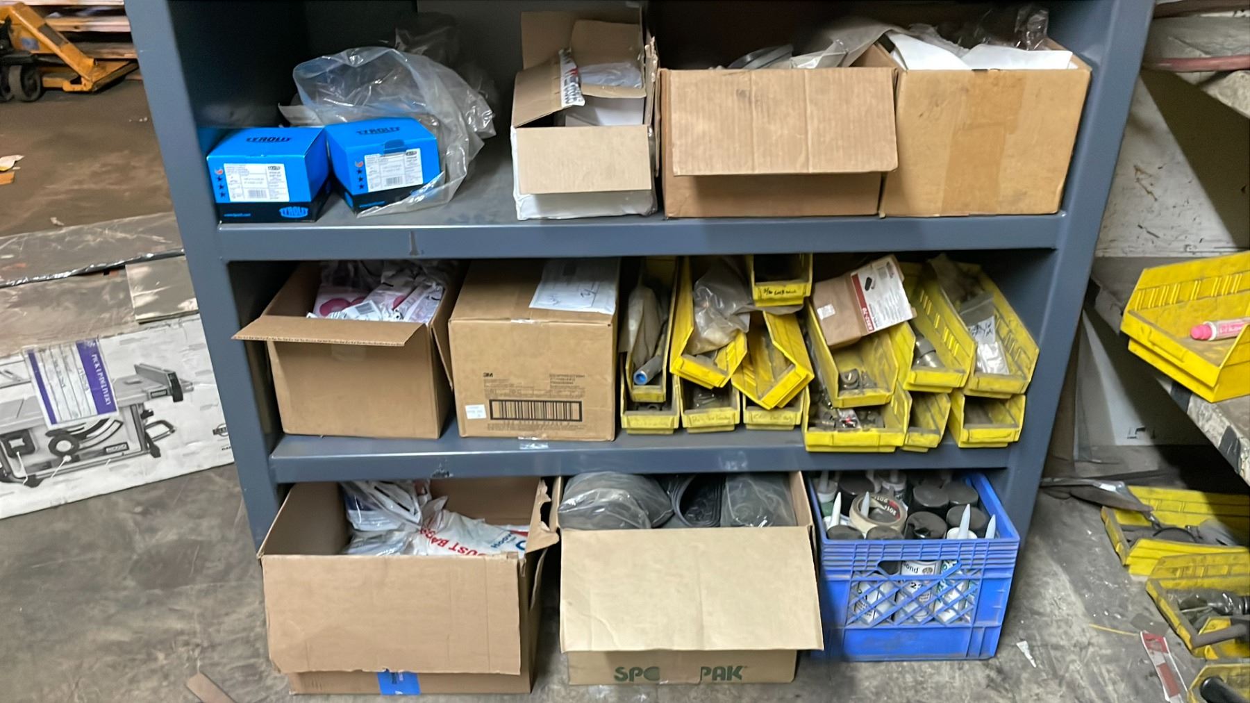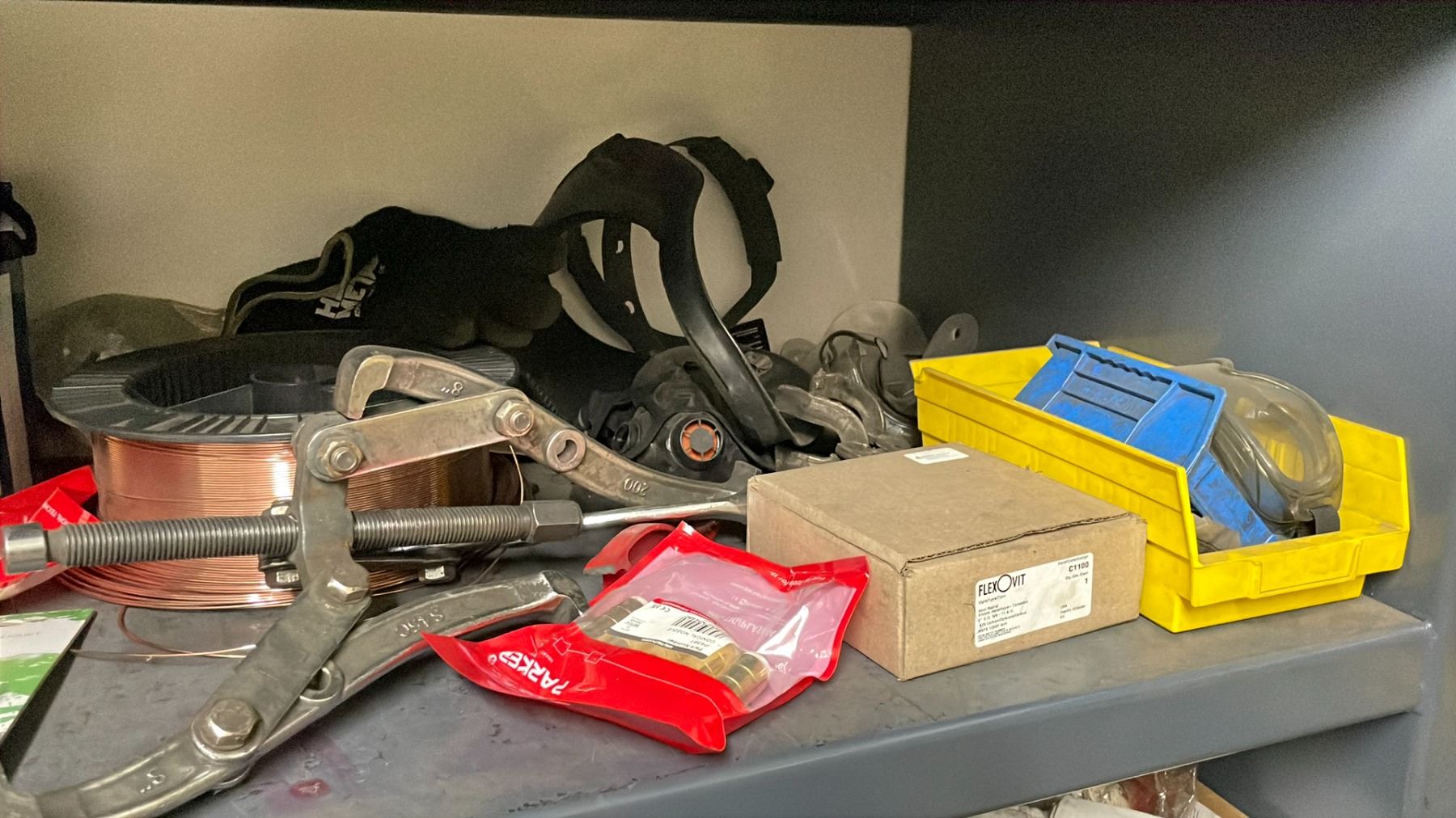 WELDED METAL SHELF UNIT W/CONTENTS - LARGE QUANTITY & ASSORTMENT OF TOOLS, HARDWARE, SAFETY GEAR AND SHOP SUPPLIES SHELF MEASURES APPROX. 53" ACROSS X 24" WIDE X 77" HIGH