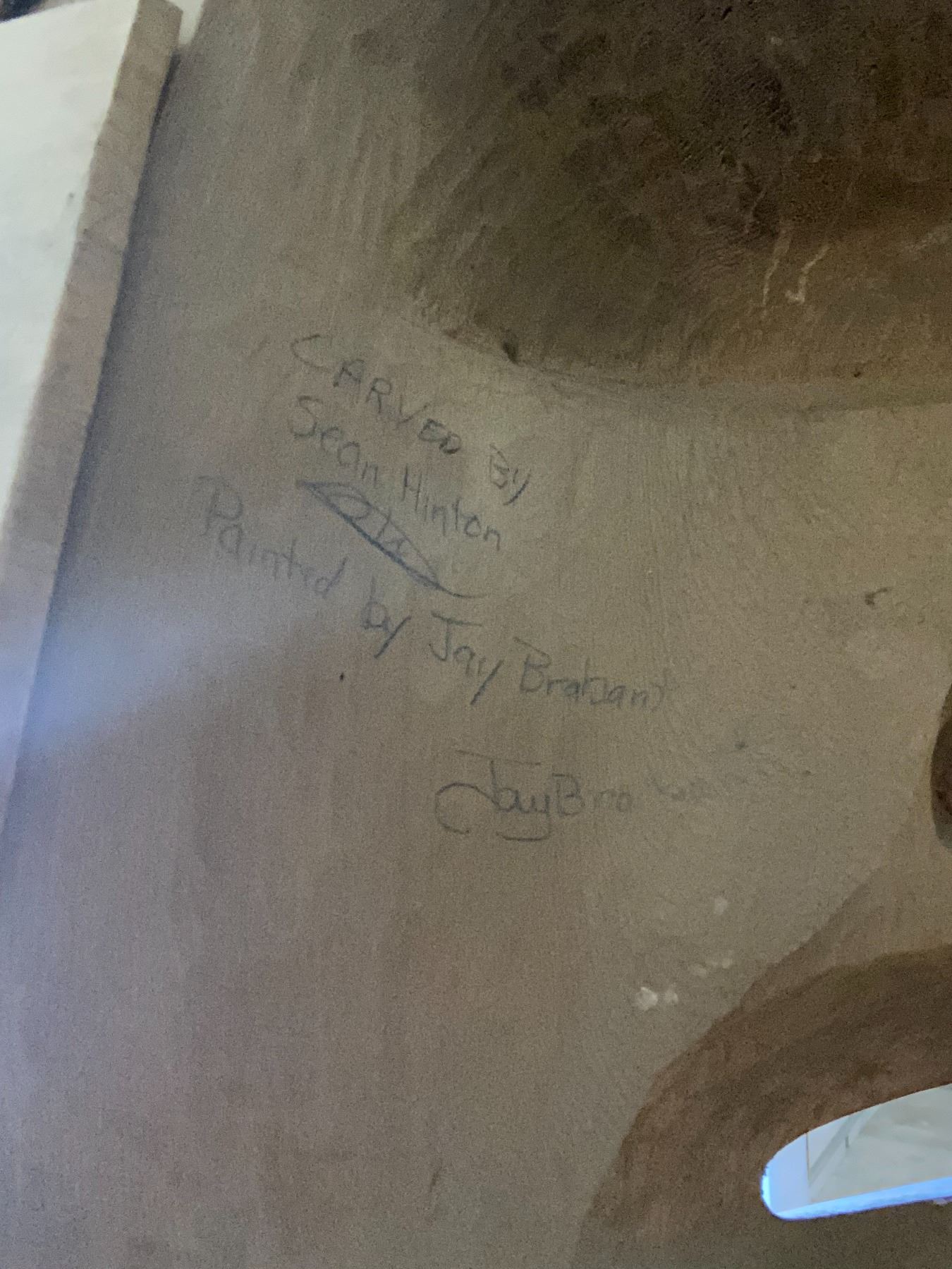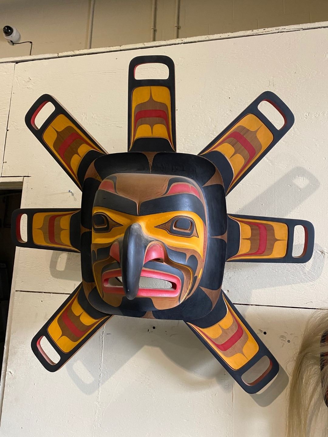 WEST COAST FIRST NATION SUN MASK KWAG-UILTH CARVED AND PAINTED BY JAY BRABANT AND SEAN HINTON, WITH REPAIR ON NOSE APPROX 36"